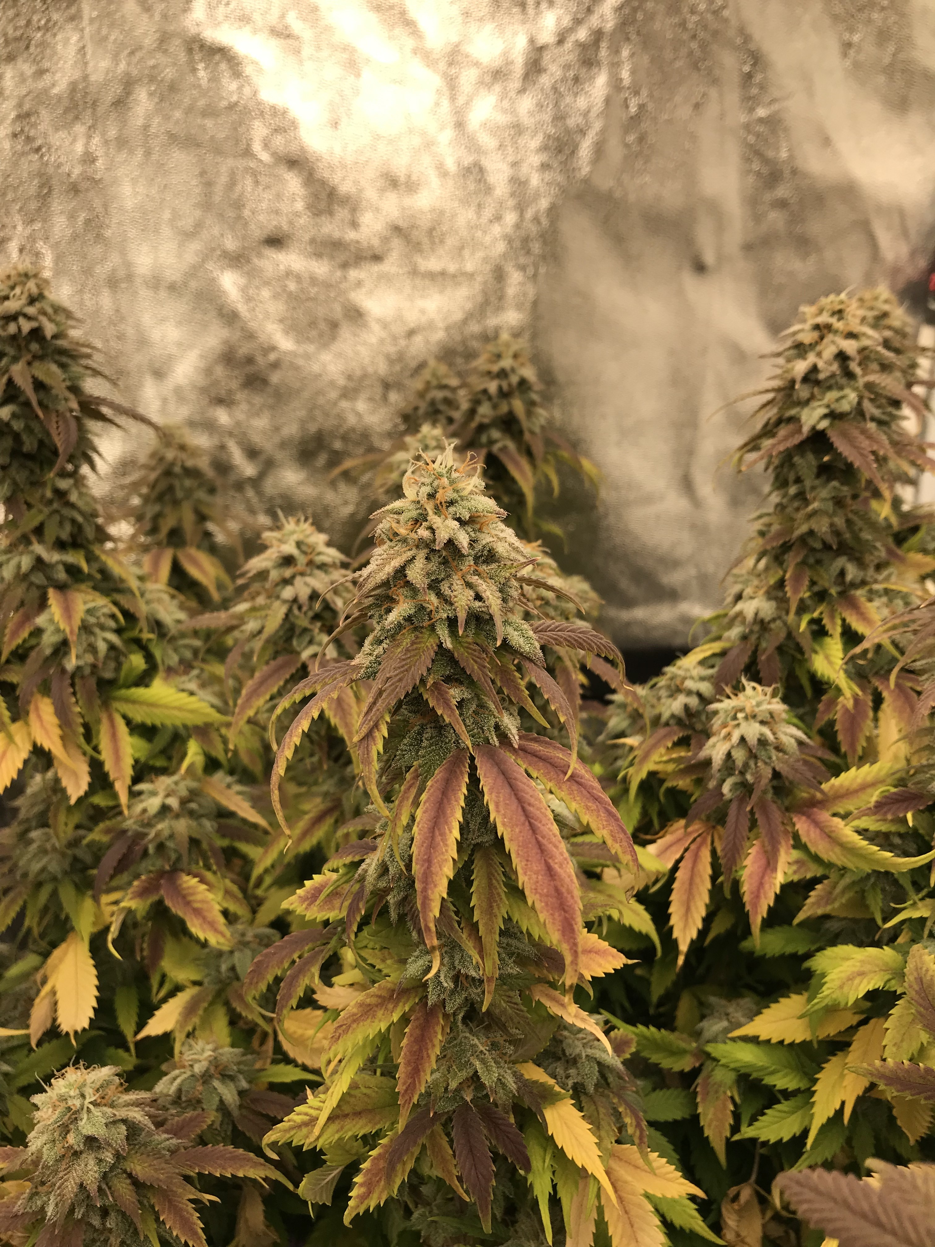 Canuck147 yep I use 2.5 mL/gal GH CaliMagic every other watering. My last grow of Royal Kush did the exact same thing with leaves turning purple, yellow, etc. after a few weeks into flower. It looked like a fall forest in my tent by the time I harvested those. These pics were at week 7 of that grow, got 11 ounces of very nice smoke (of course I am biased) out of that grow. Hoping to up my yield this time without losing potency, but then again who isn’t?!?4’x4’x6 1/2’ tent, Nextlight Mega, Roots Organics 707 soil in 5 gallon square plastic planters, GH Flora Series Performance Pack nutes alternated with Fish Sh!t in RO water