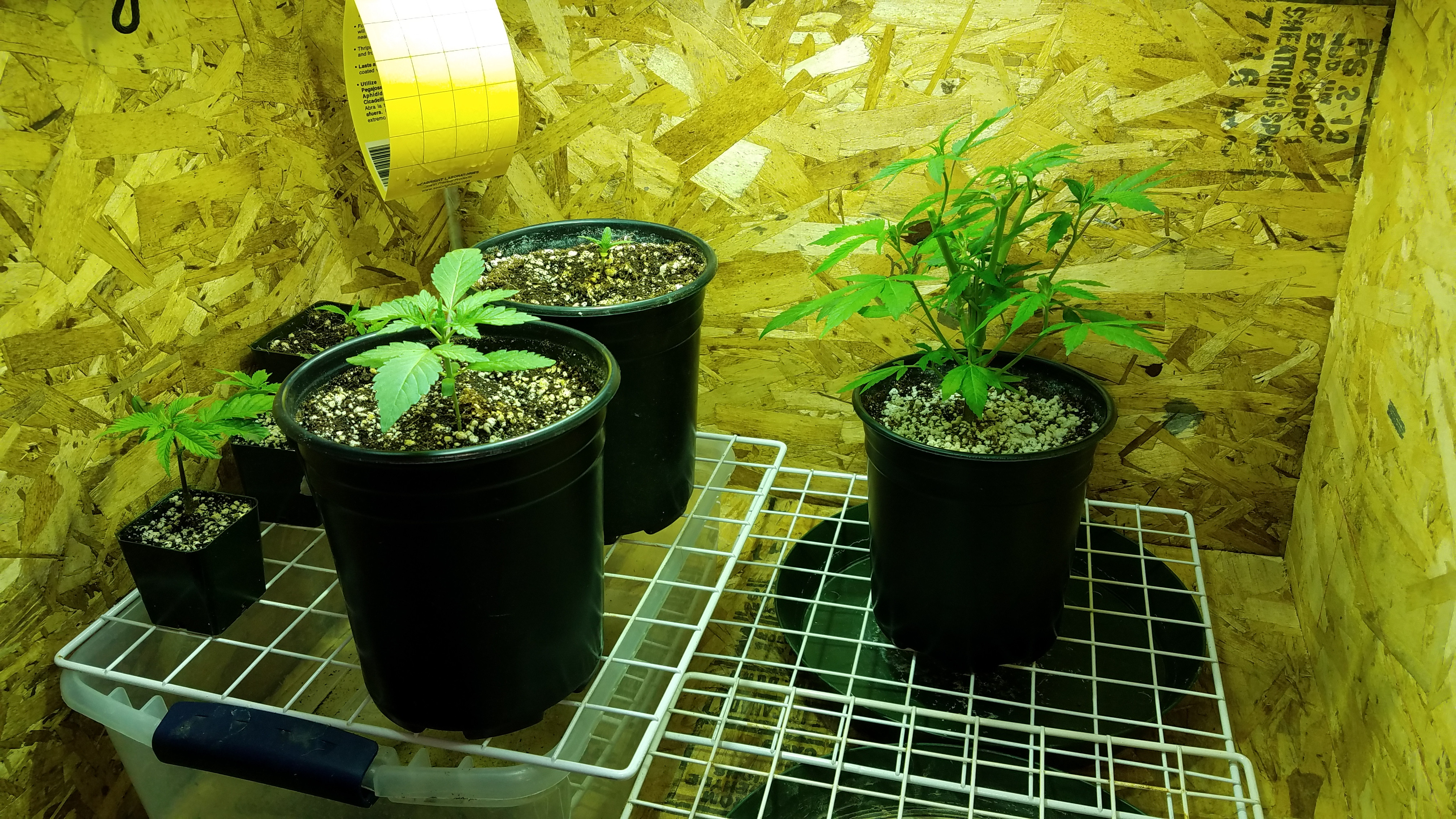 Moving Day! Tent came inside today..cold and snow for end of week. Considering its a home made tent, and i MacGyver'ed it together with odds n ends. I only needed to smoke six joints and take two Tylenol to get her back together.! good times. And it BARELY fit. Once in the house i finally got a chance to really look over the plants..and they looked like i expected after two weeks of neglect. Did some defoliating and a good spray for wpm, check for any bugaboos, and in they went. Switched to 12/12 tonight!! They seem to be going thru water extremely fast...like every two days..maybe it'll settle now that their into a more stable climate. Got two clones that got kicked out of tent for 12/12. Not sure what to do with them.. got them under a small 45w led for now