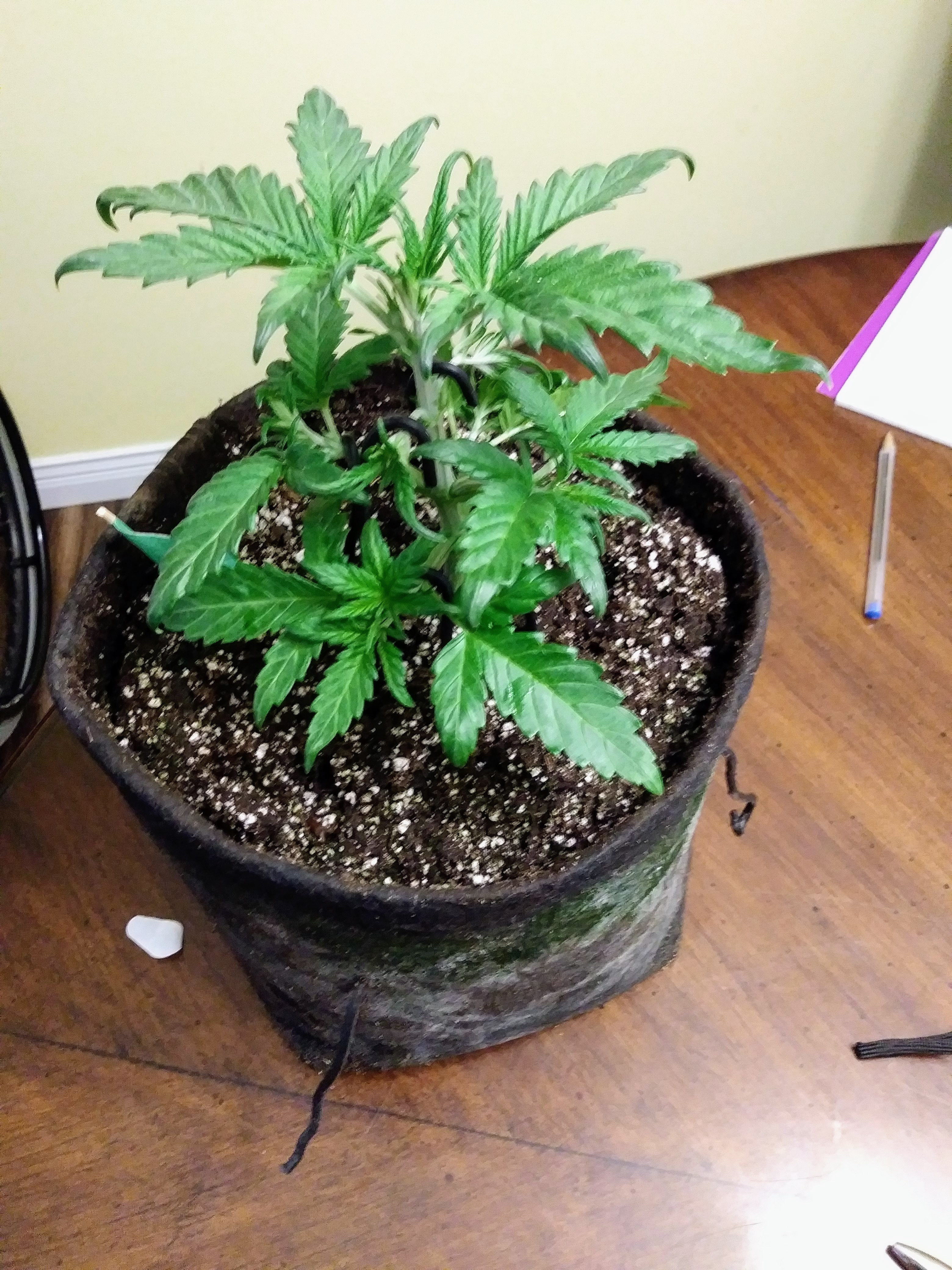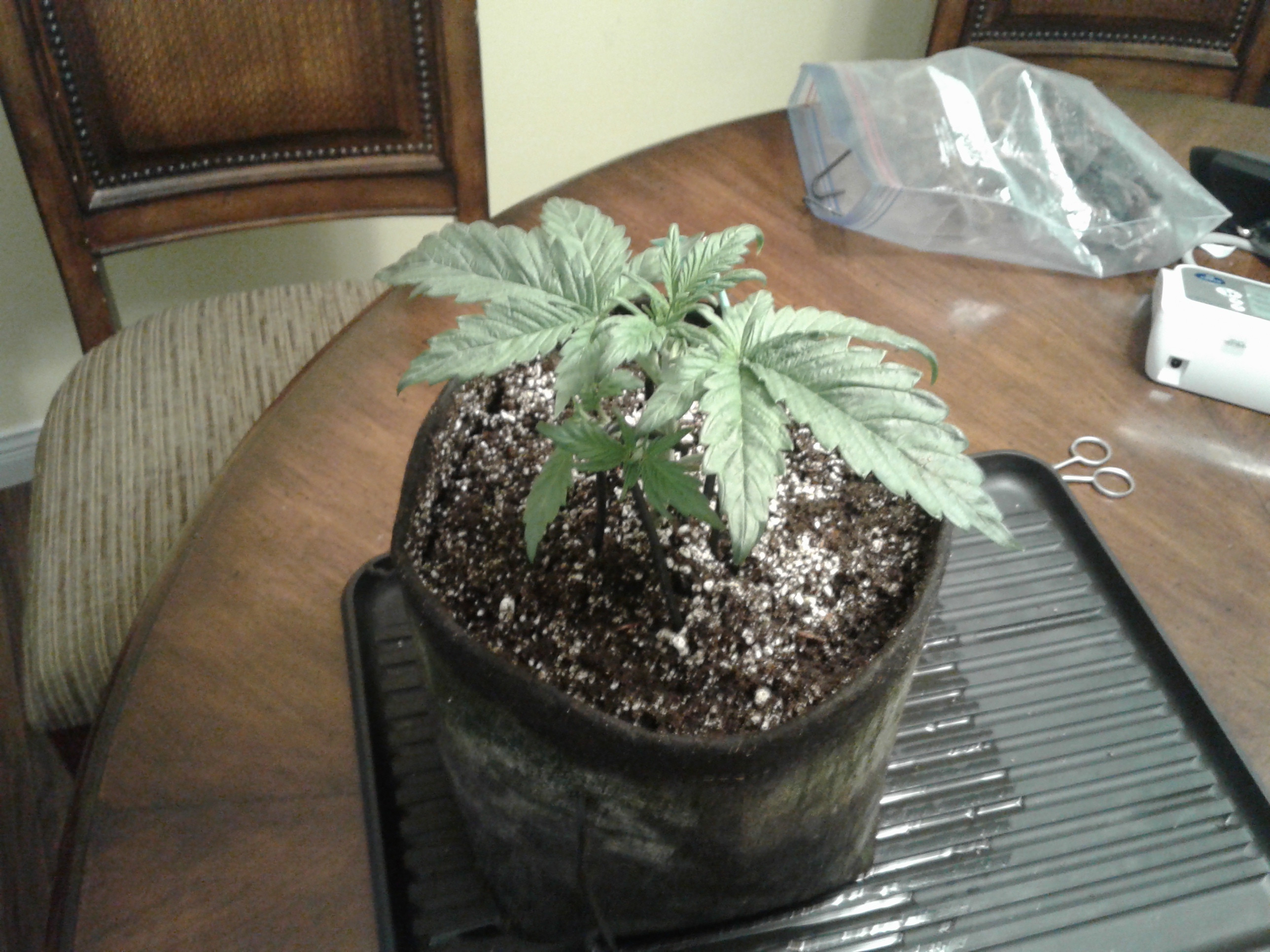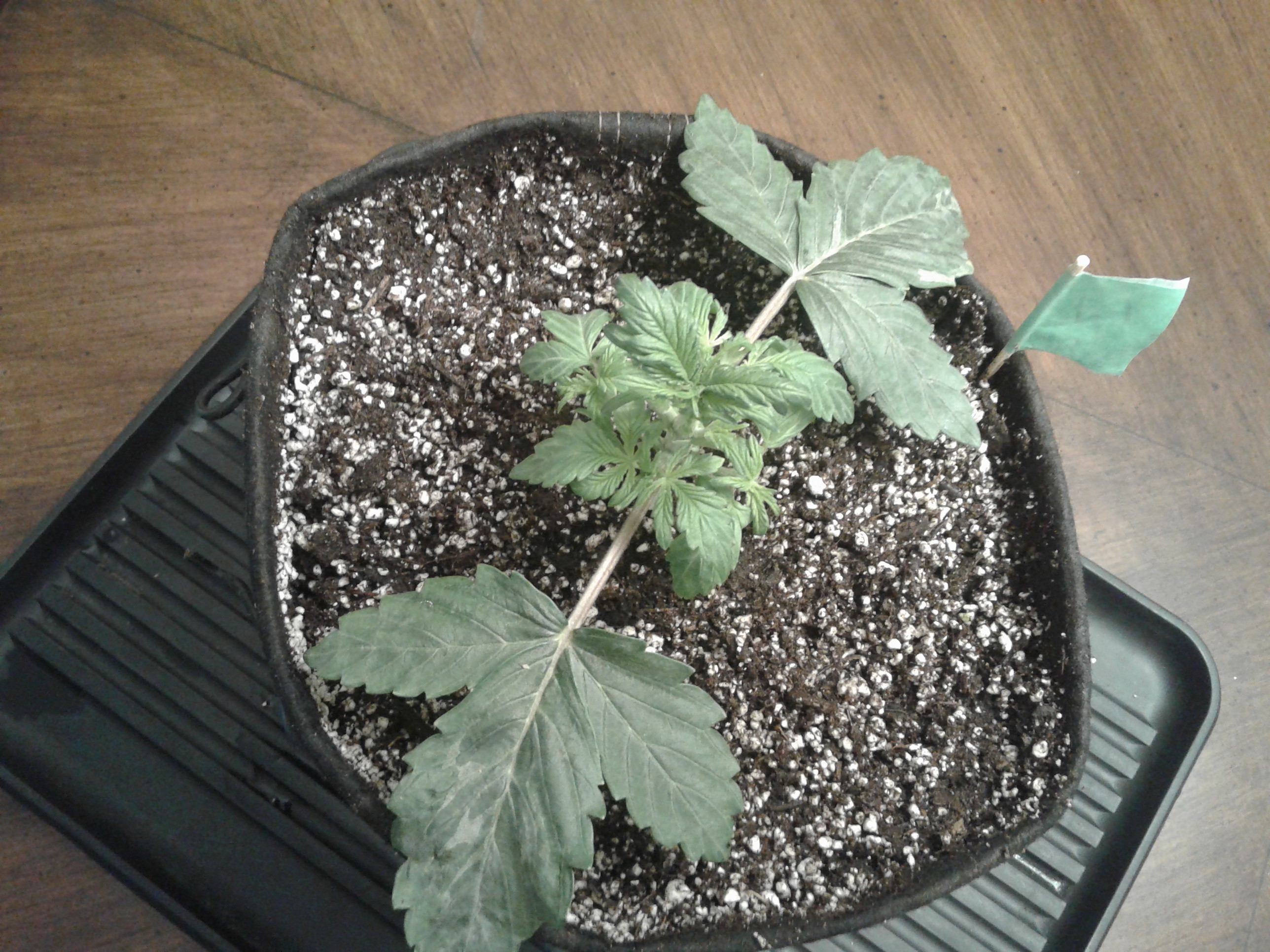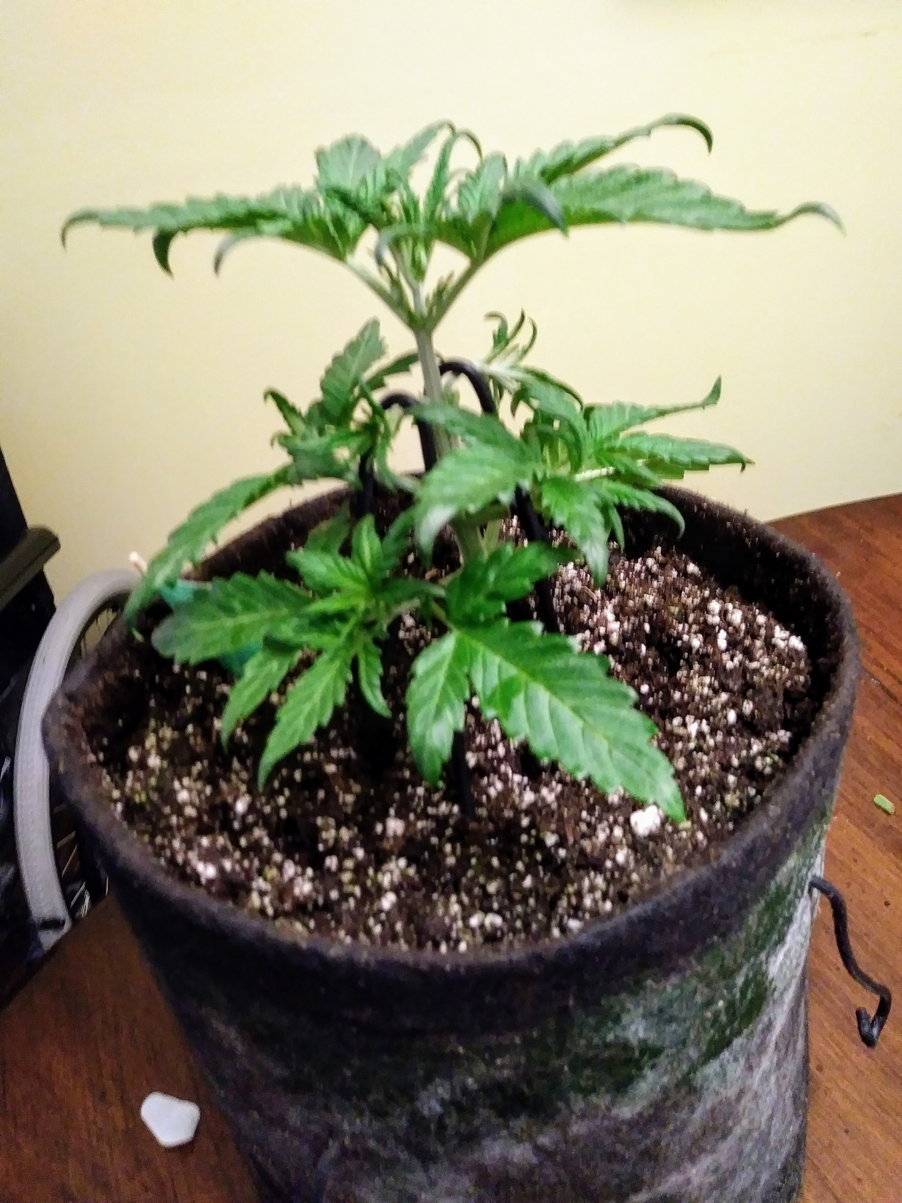White Widow - not being topped - being let to grow on her own - well, that's what I tell her. I'll definitely have a say in how she grows. Right now I cut off 2 sets of leaves. Left the 2 ugly leaves on the bottom as they are not blocking anything but are almost laying on the soil. Once a bit bigger I'll encourage the branches to grow away from the center.