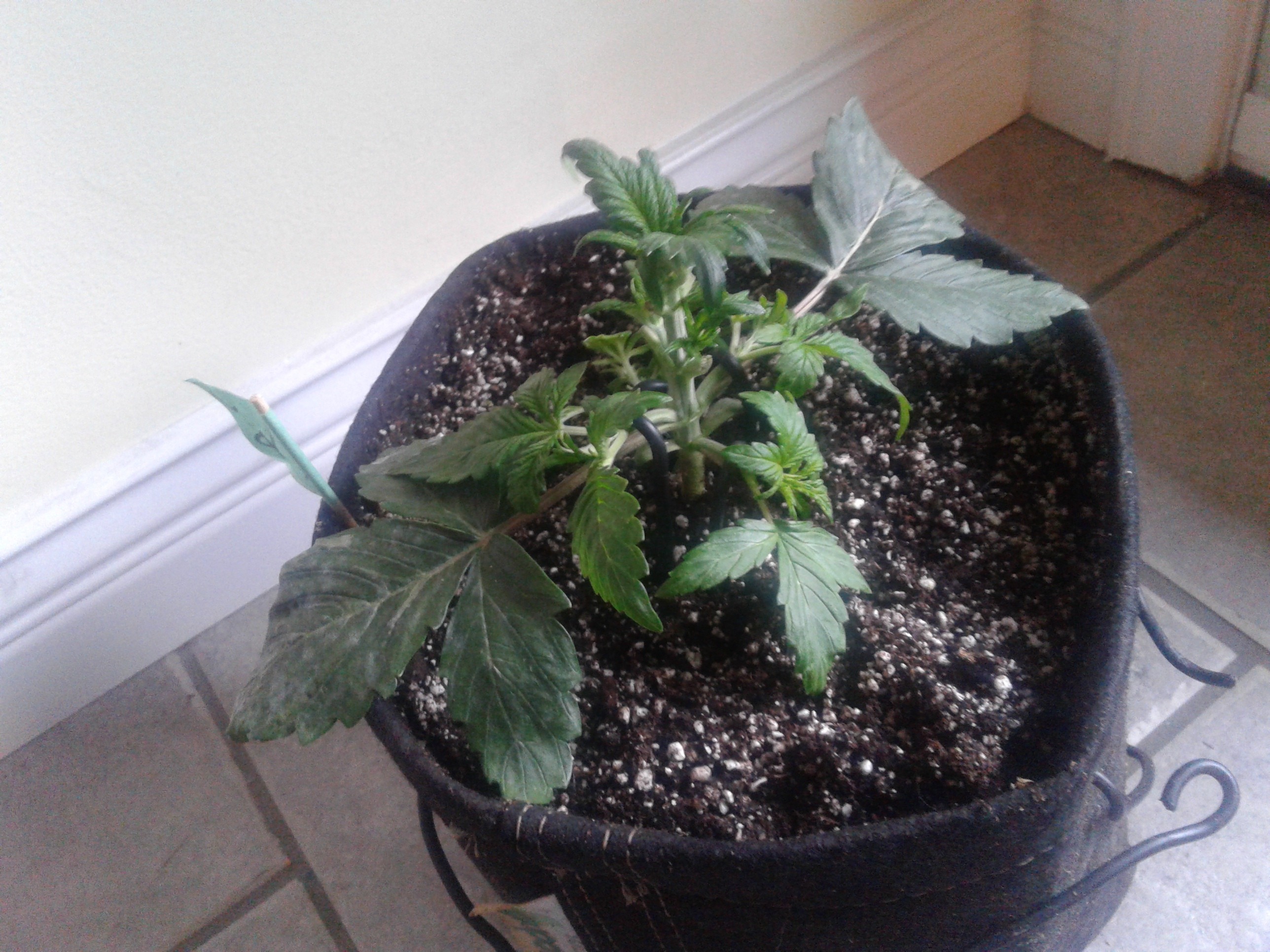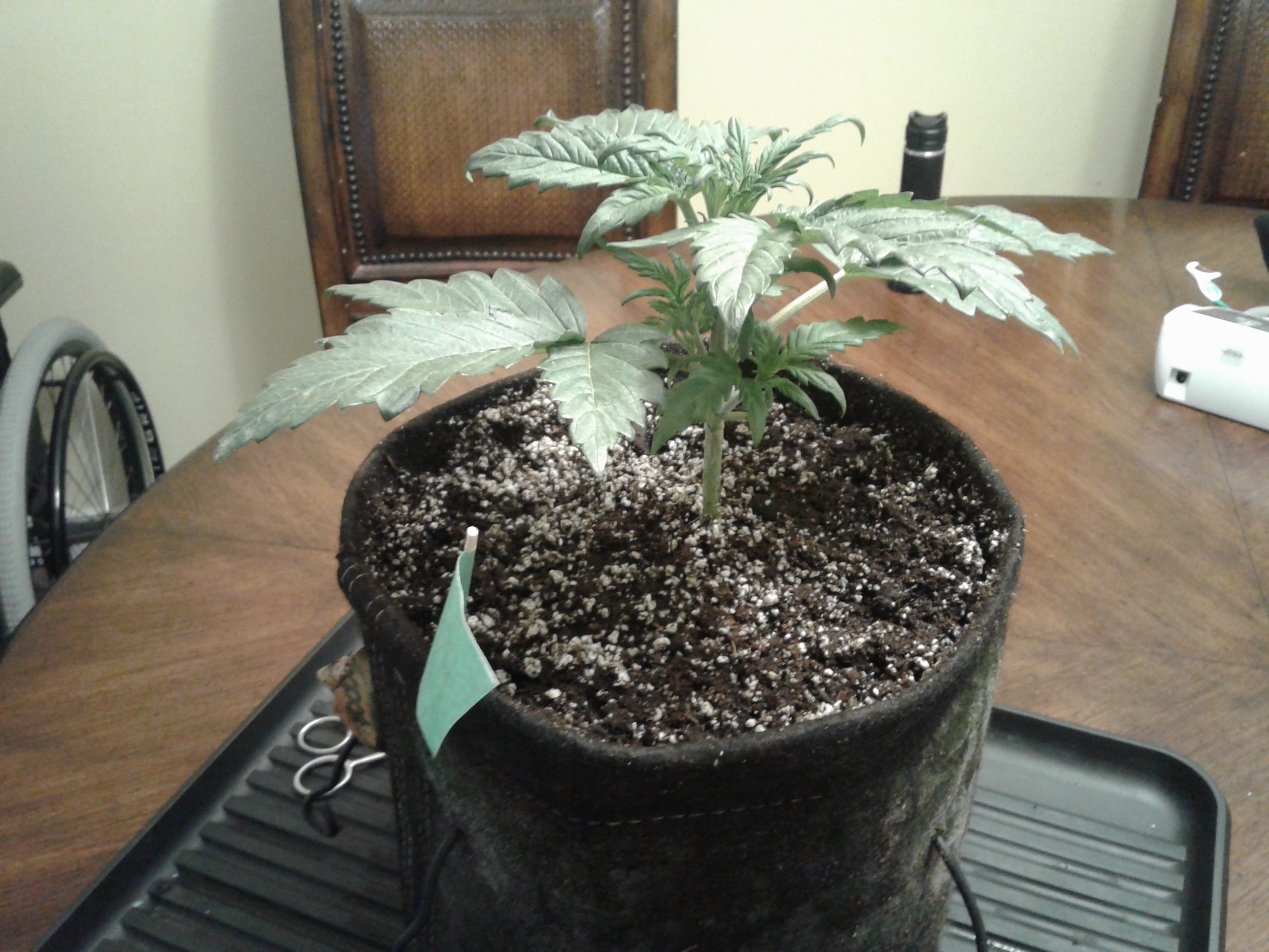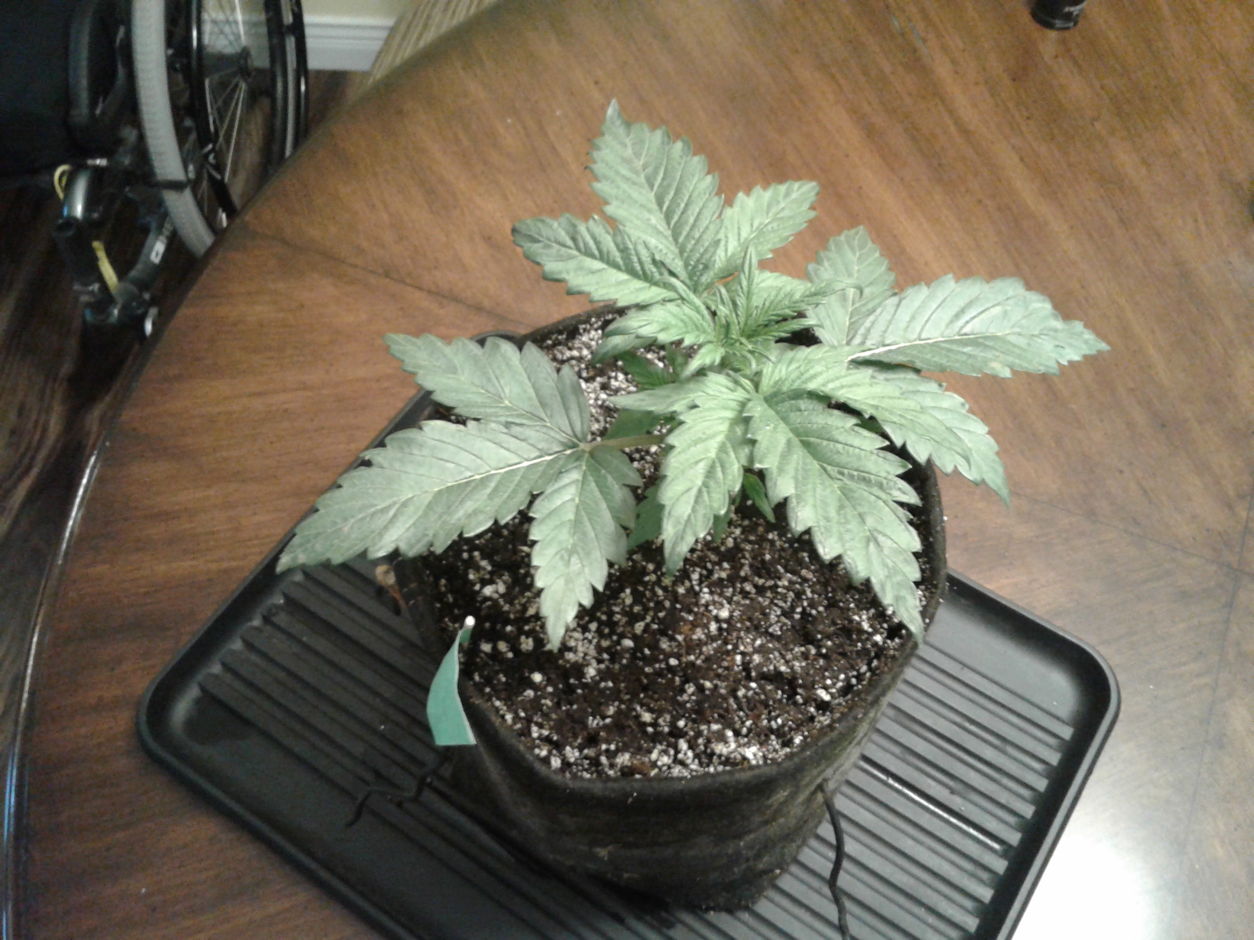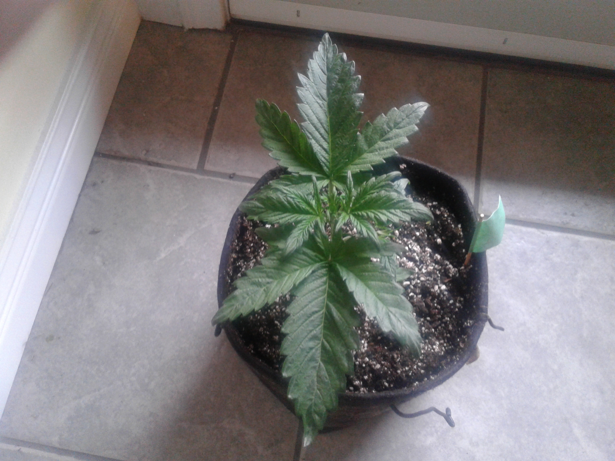 White Widow - not being topped - being let to grow on her own - well, that's what I tell her. I'll definitely have a say in how she grows. Right now I cut off 2 sets of leaves. Left the 2 ugly leaves on the bottom as they are not blocking anything but are almost laying on the soil. Once a bit bigger I'll encourage the branches to grow away from the center.