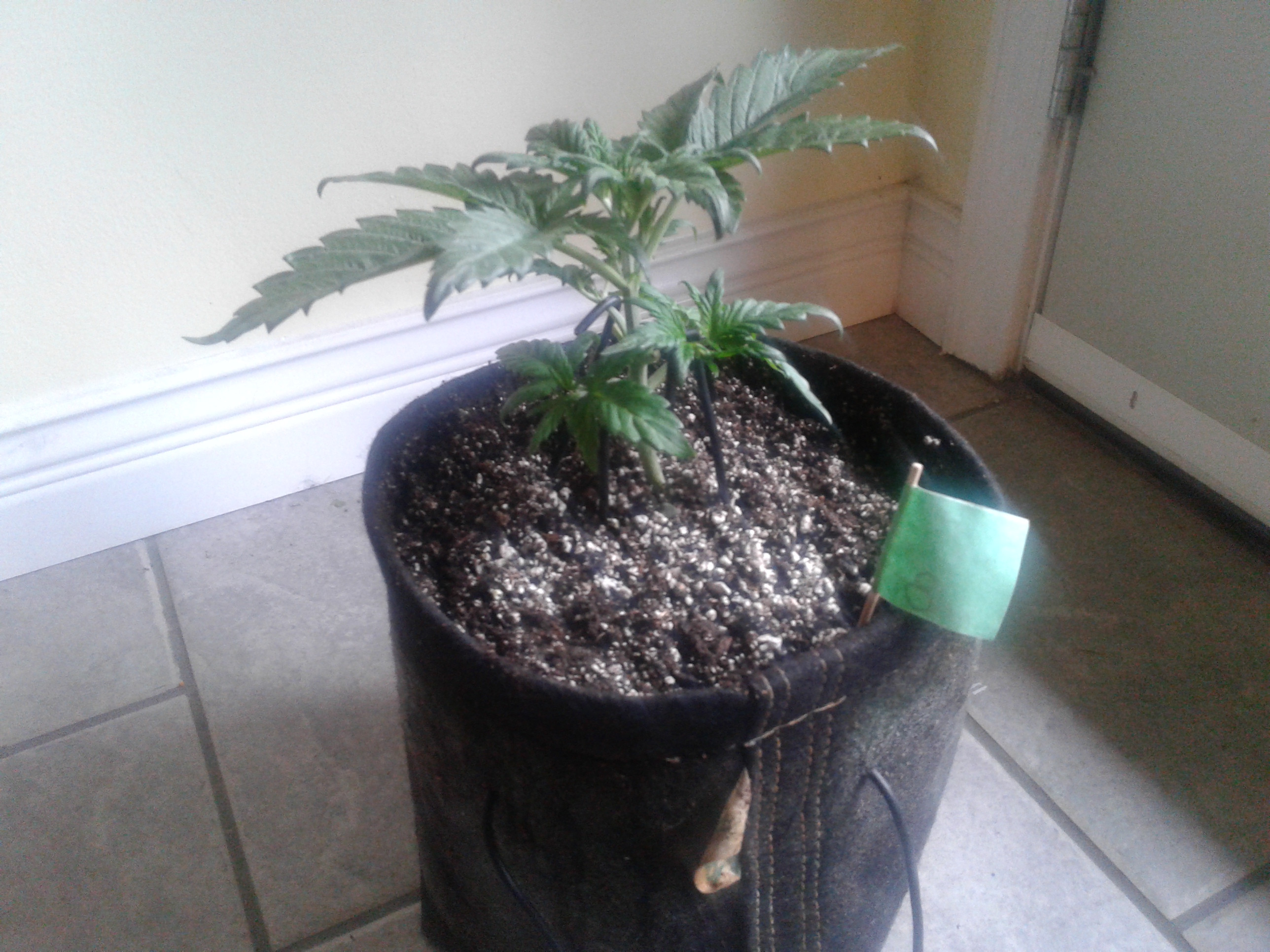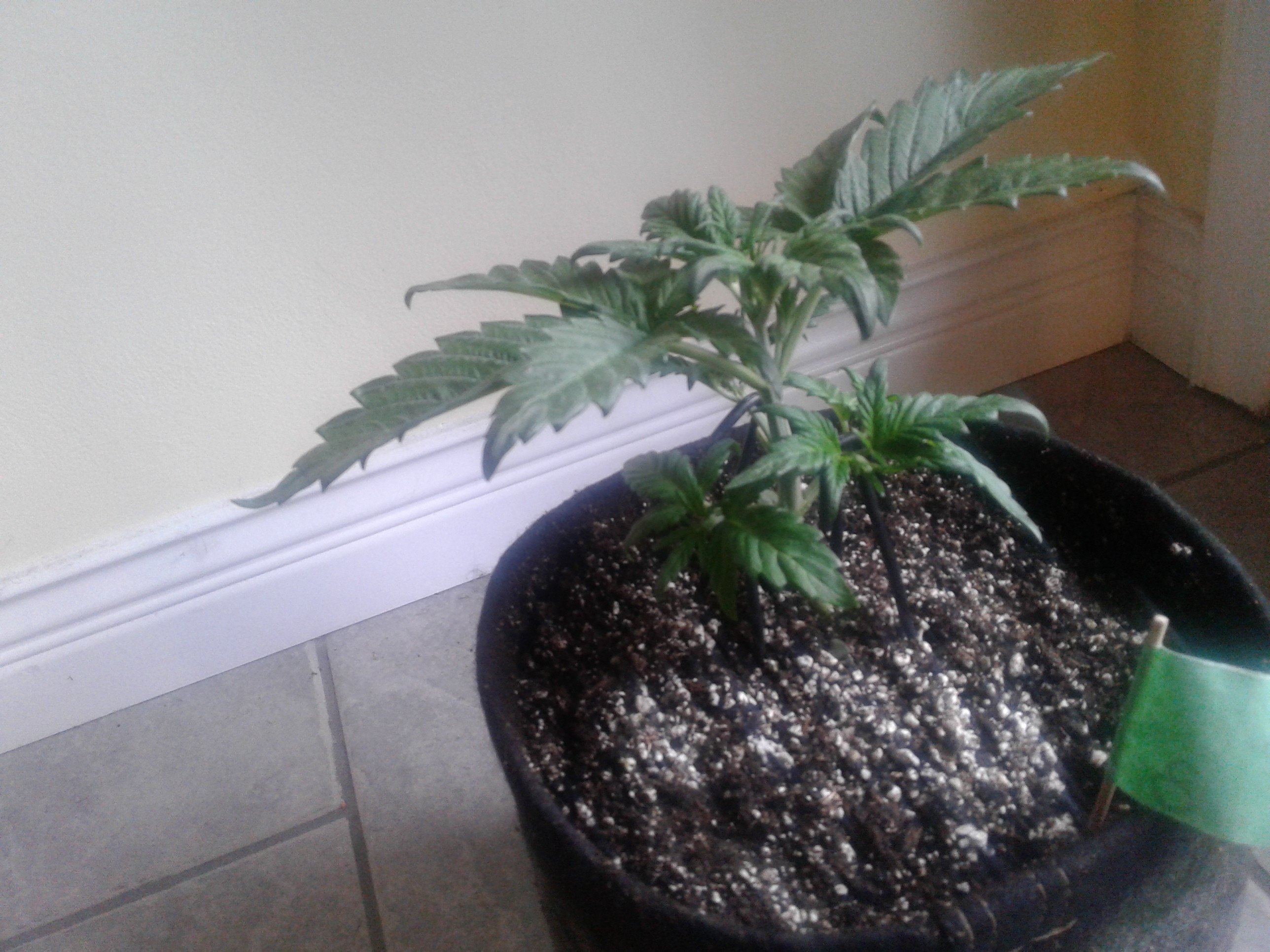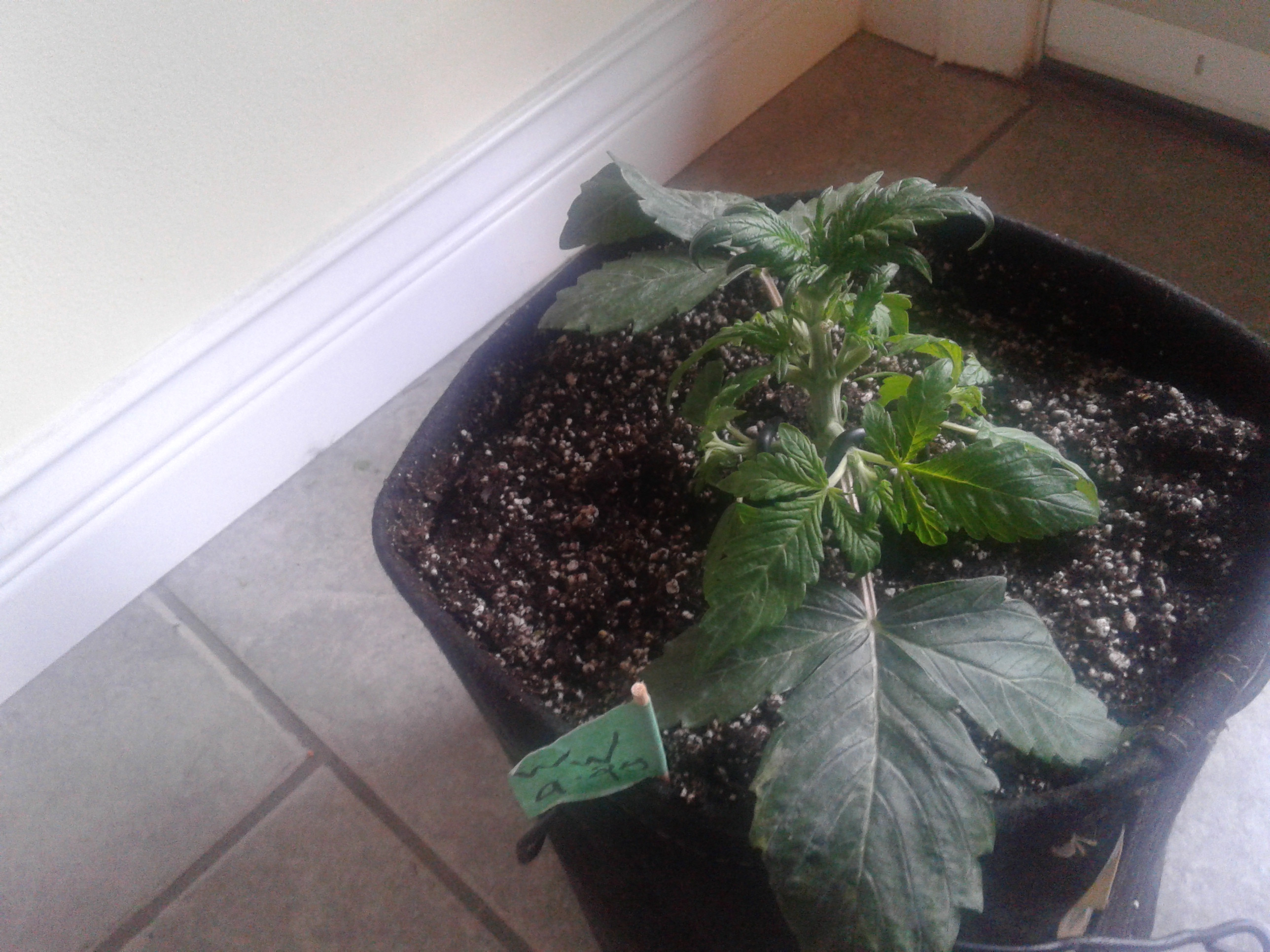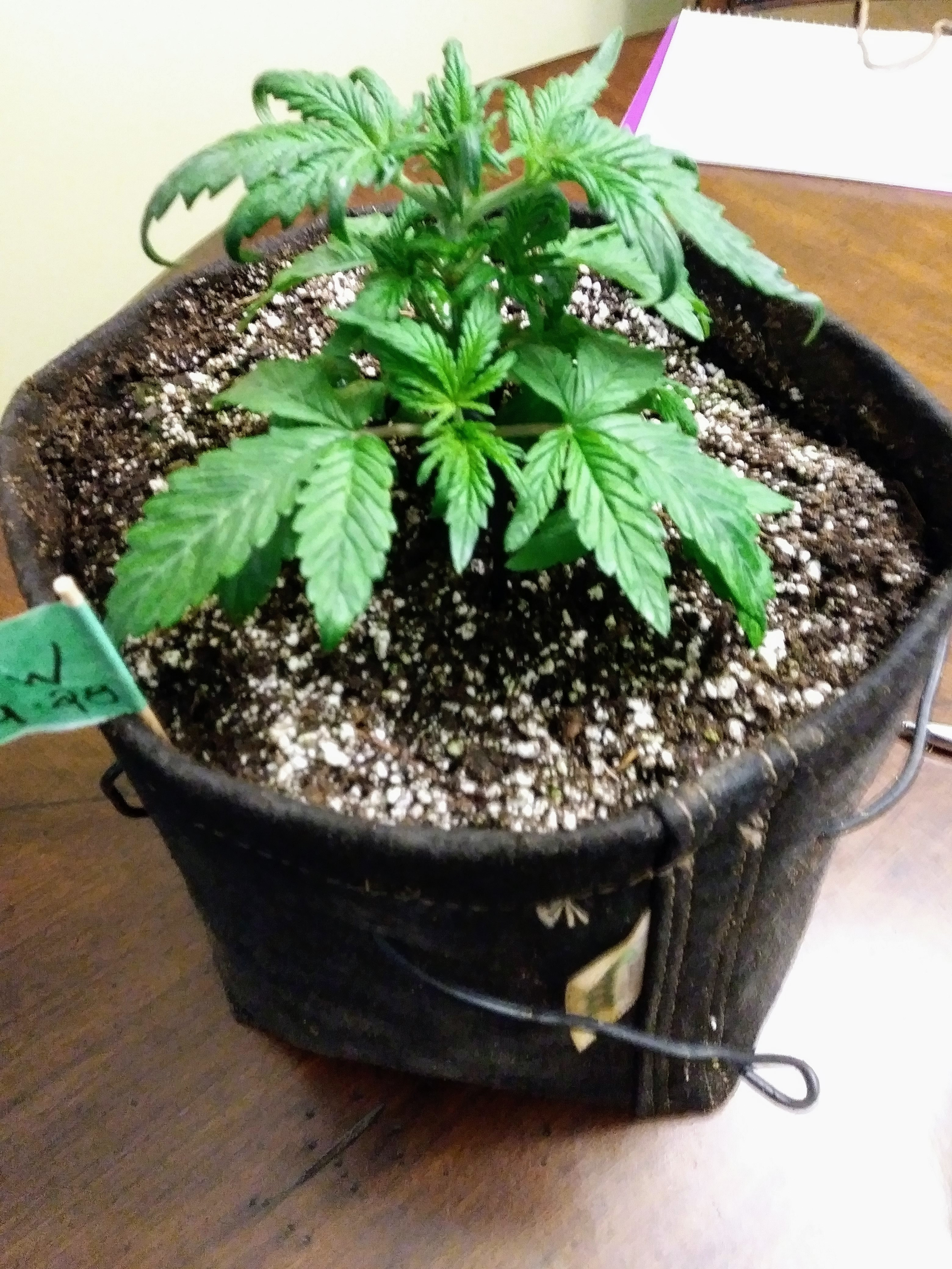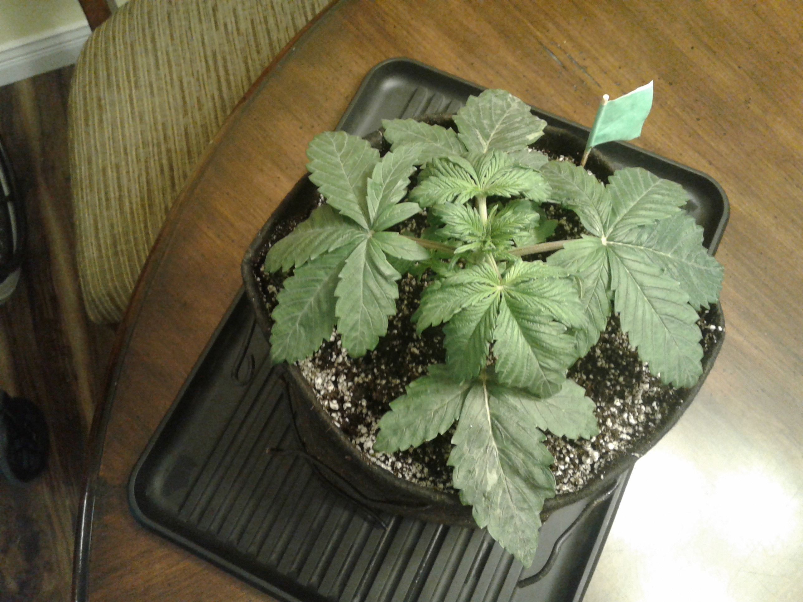 White Widow - not being topped - being let to grow on her own - well, that's what I tell her. I'll definitely have a say in how she grows. Right now I cut off 2 sets of leaves. Left the 2 ugly leaves on the bottom as they are not blocking anything but are almost laying on the soil. Once a bit bigger I'll encourage the branches to grow away from the center.