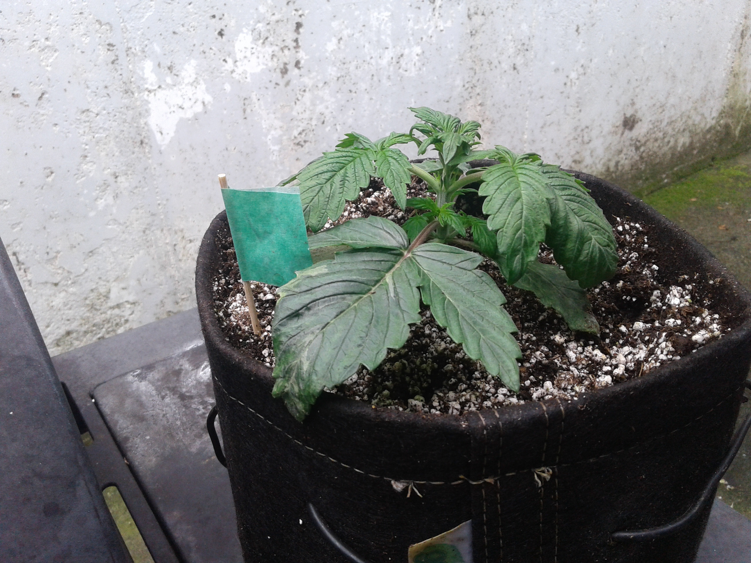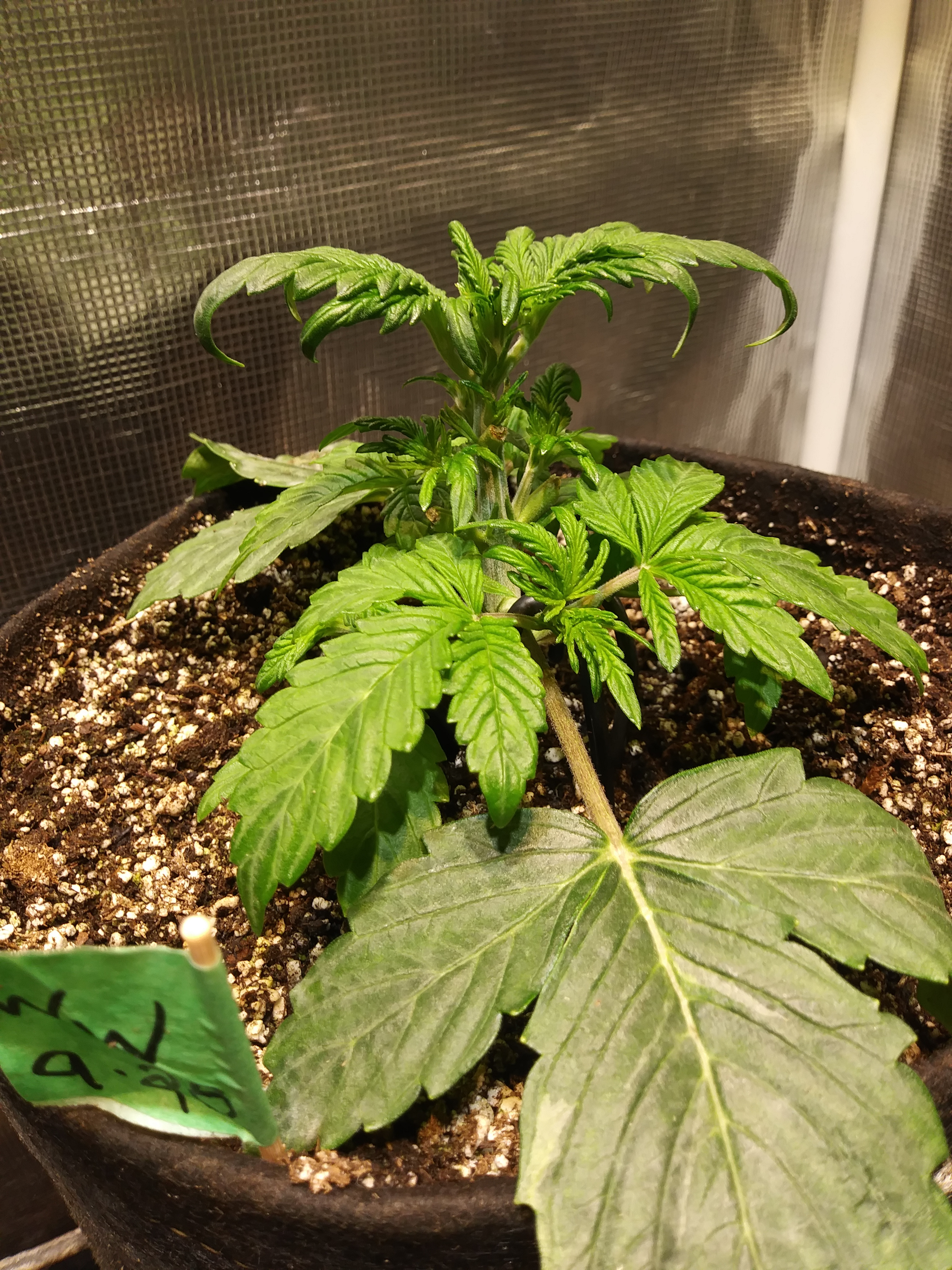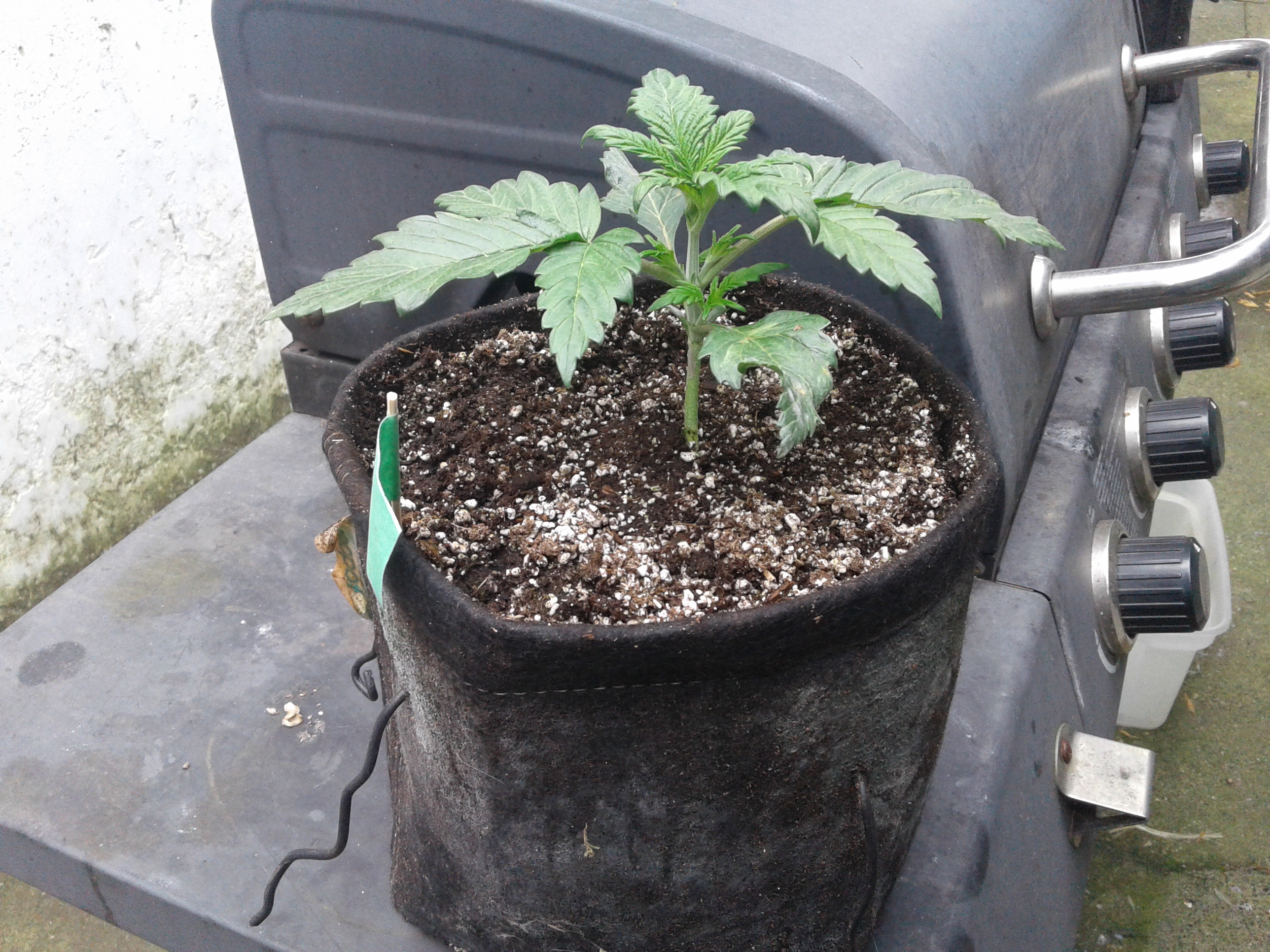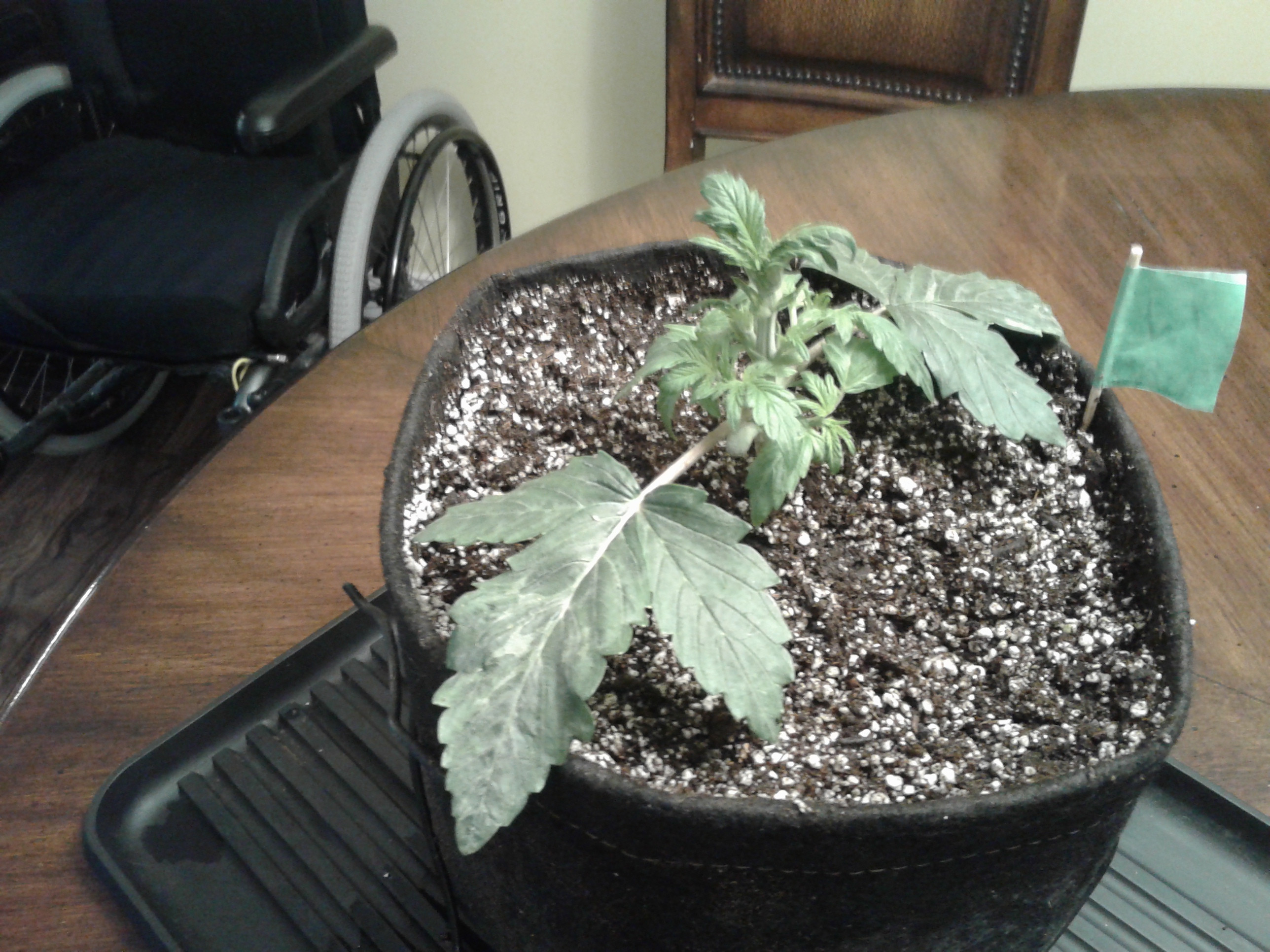 White Widow - not being topped - being let to grow on her own - well, that's what I tell her. I'll definitely have a say in how she grows. Right now I cut off 2 sets of leaves. Left the 2 ugly leaves on the bottom as they are not blocking anything but are almost laying on the soil. Once a bit bigger I'll encourage the branches to grow away from the center.