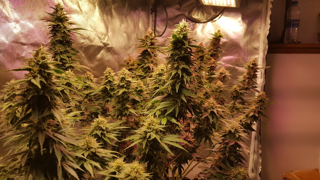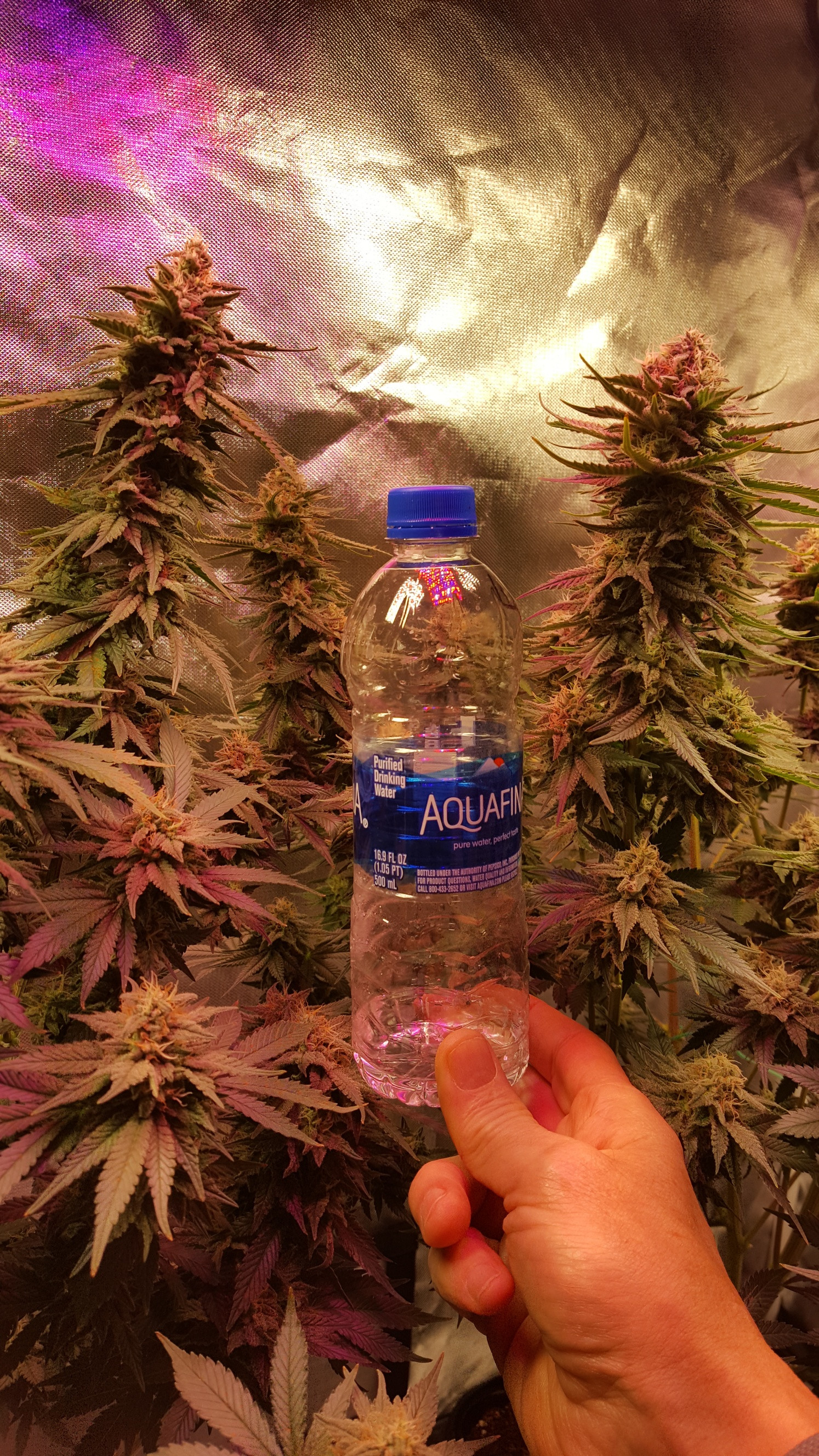 Thats a 2x4 tent. There are 2 white 1000w ONEO and 1 1000w blurple LED. I think they draw about 600w total. One of them is the plant I had the spots on. I seem to keep them right on the edge of having light burn. The photo perspective makes it look like the colas are bigger than the water bottle but they're not. But they are pretty big. I'll post some more photos in a bit.