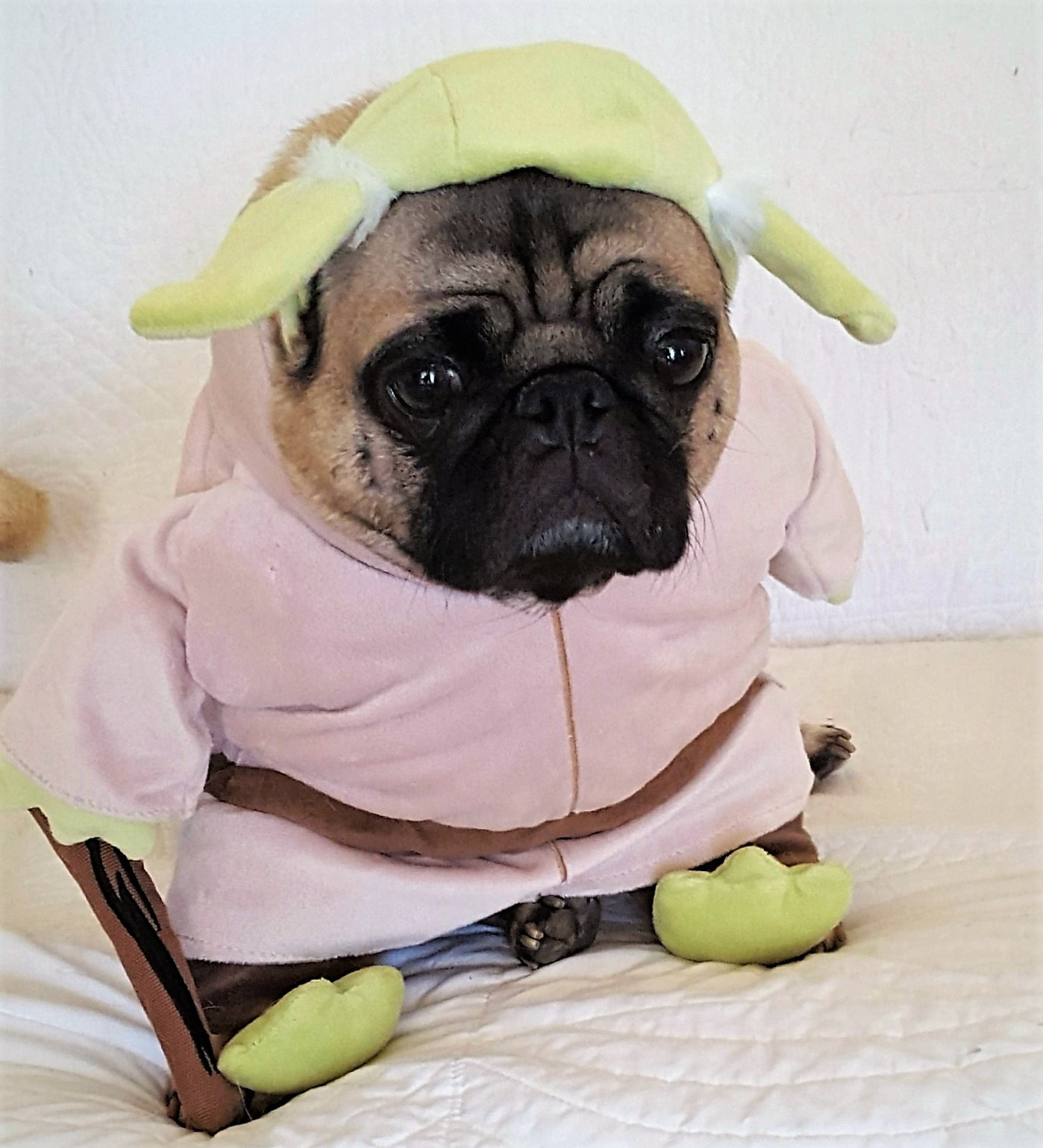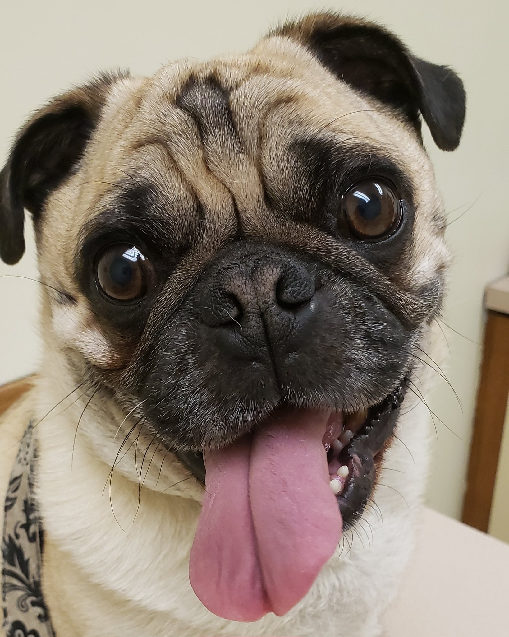 I'm a fair mom so this is Yoda (grumpy). he's the oldest, they're exactly 9 months apart but not related. Irish twins. he's the mellow, easier pug. Three pugs on freebie cards that year but old Otis crossed the bridge Dec 2019. and somepug just puked on the couch, crazy is taking care of it.