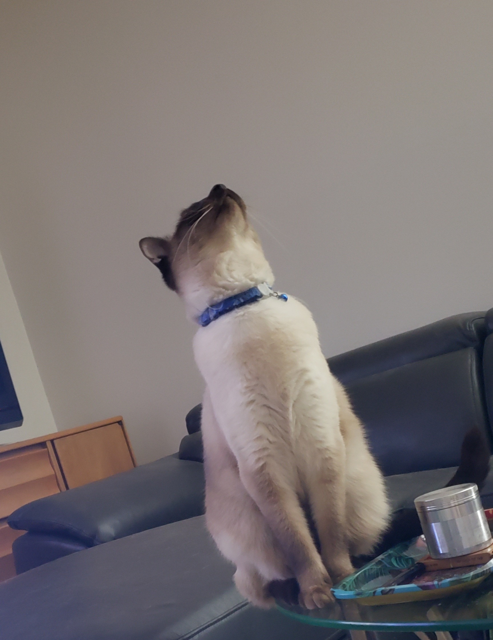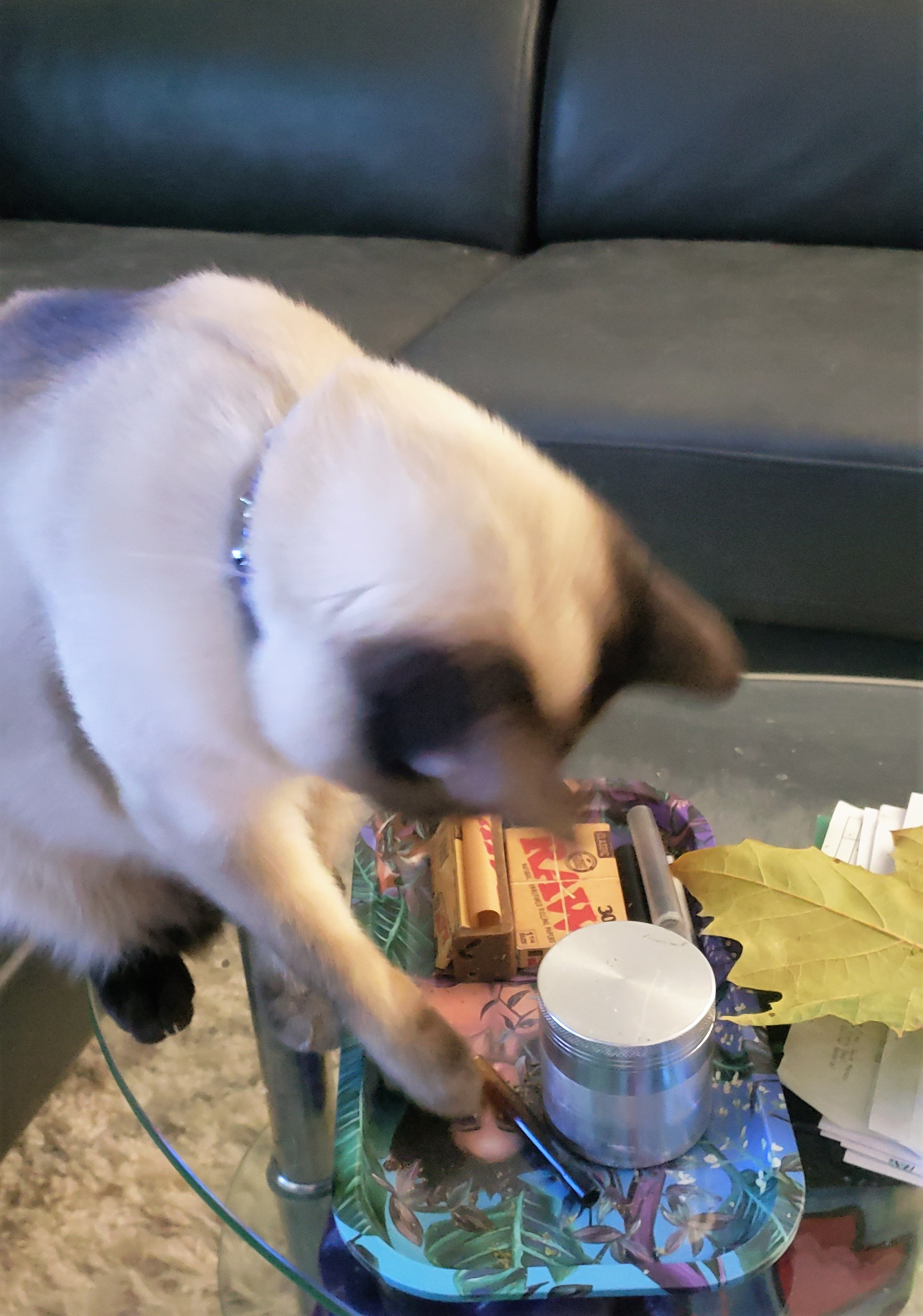 This cat was standing up tapping at my face while I laid on the couch. Second time he put his nose to my mouth, then sat back down and licked his lips. I had just taken two vape hits off a cart I bought last month. Was he Jonesin' for weed?