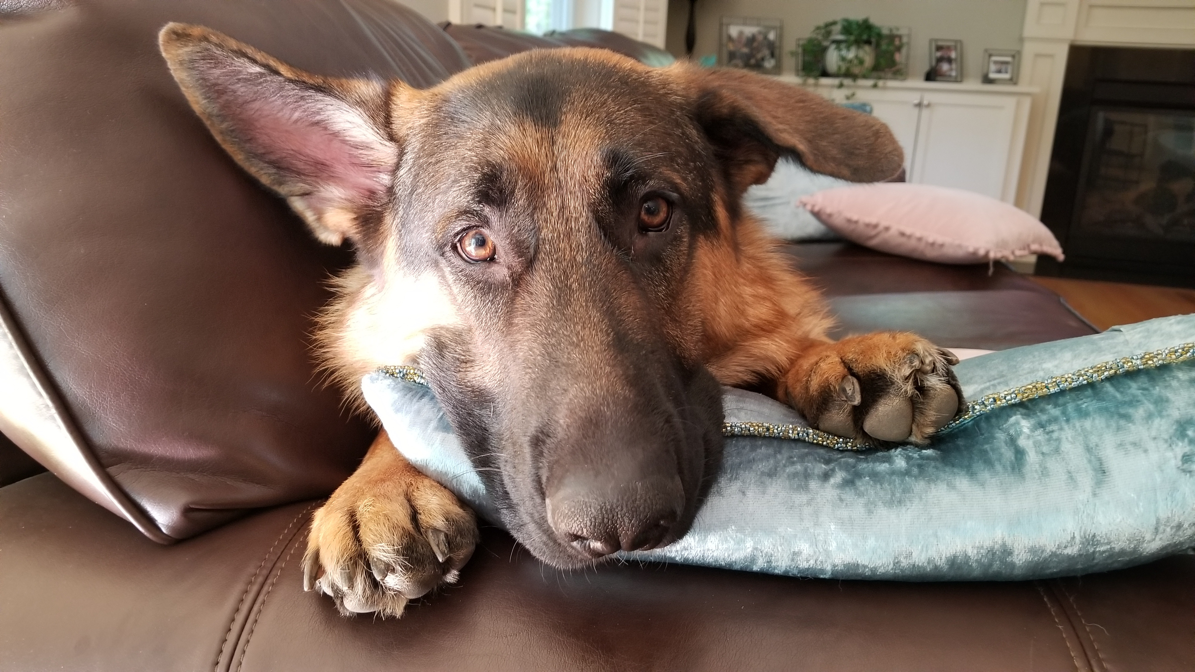 No pics right now but will see if I can post a pic of him and the husky youngster that is his best friend/bane of his existence.
