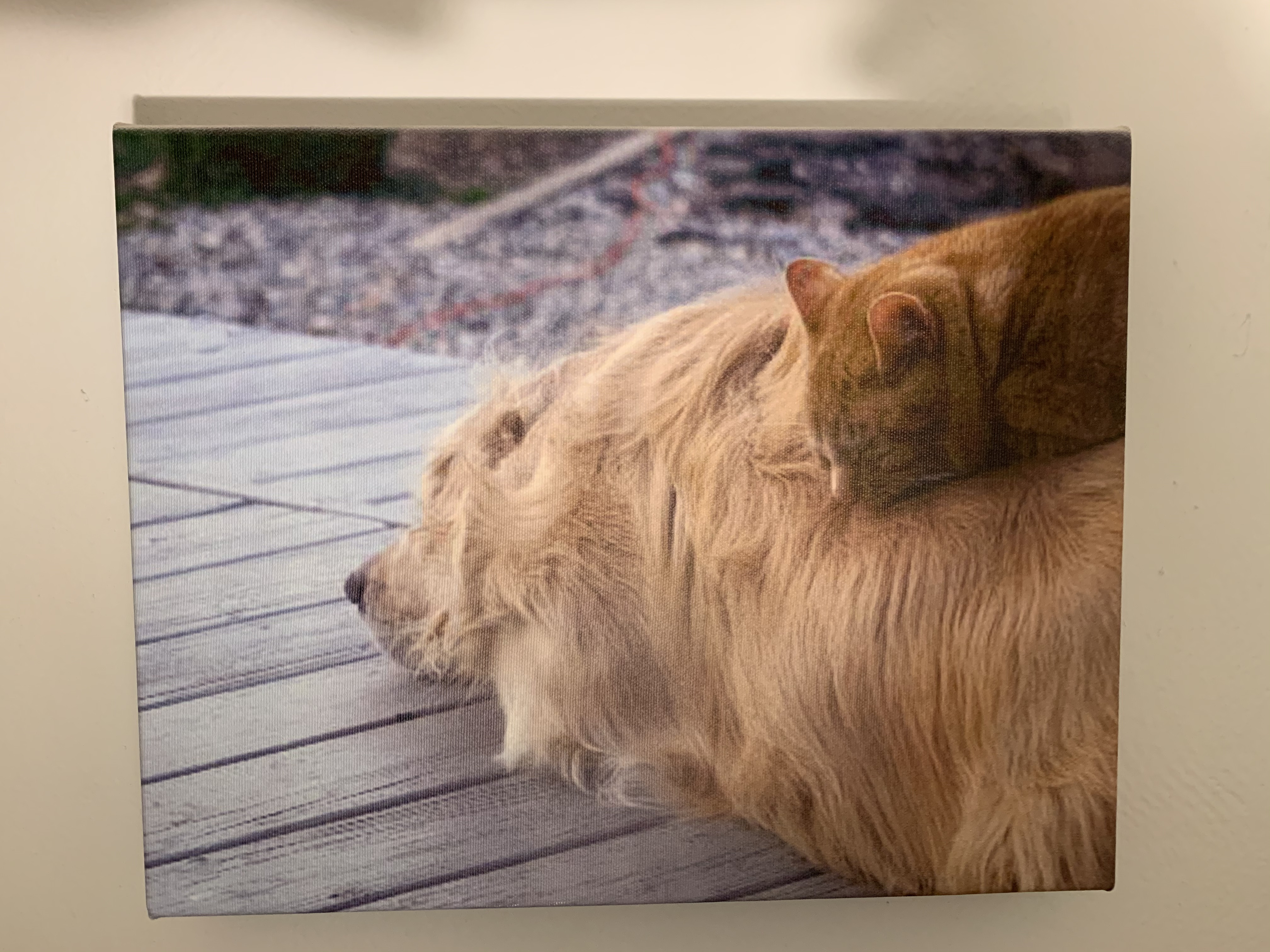 Ha, imagine the dog doing those cat-like movements? We’ve been in our house 40+yrs and have always had cats. The first year back in 1975 you could hear mice scurrying around the attic, so, we got a cat. We had on adopted cat from the shelter they called a Russian blue and he lived 18 yrs and our Holstein looking cat lived to be 22. We’ve really never had a mouse problem since. We had 2 Golden Retrievers that lived to be 17 and 16 which is remarkable. We took 1 vacation with the kids to Disney World for about 8 days and boarded them on a farm like kennel. Both of them would not eat. I felt like crap when we got home and heard that. . . never left them behind again. We’ve always had 3-4 cats and several of them would crawl up on the dogs back and sleep there. Our current k-9 is not a cat lover and chases them out of the back area of the house, under the deck, Up a tree or the roof of my truck. My daughter gave us this photo on a canvas print of Lani and a stray yellow cat that hung around here for a few years Click image for larger version