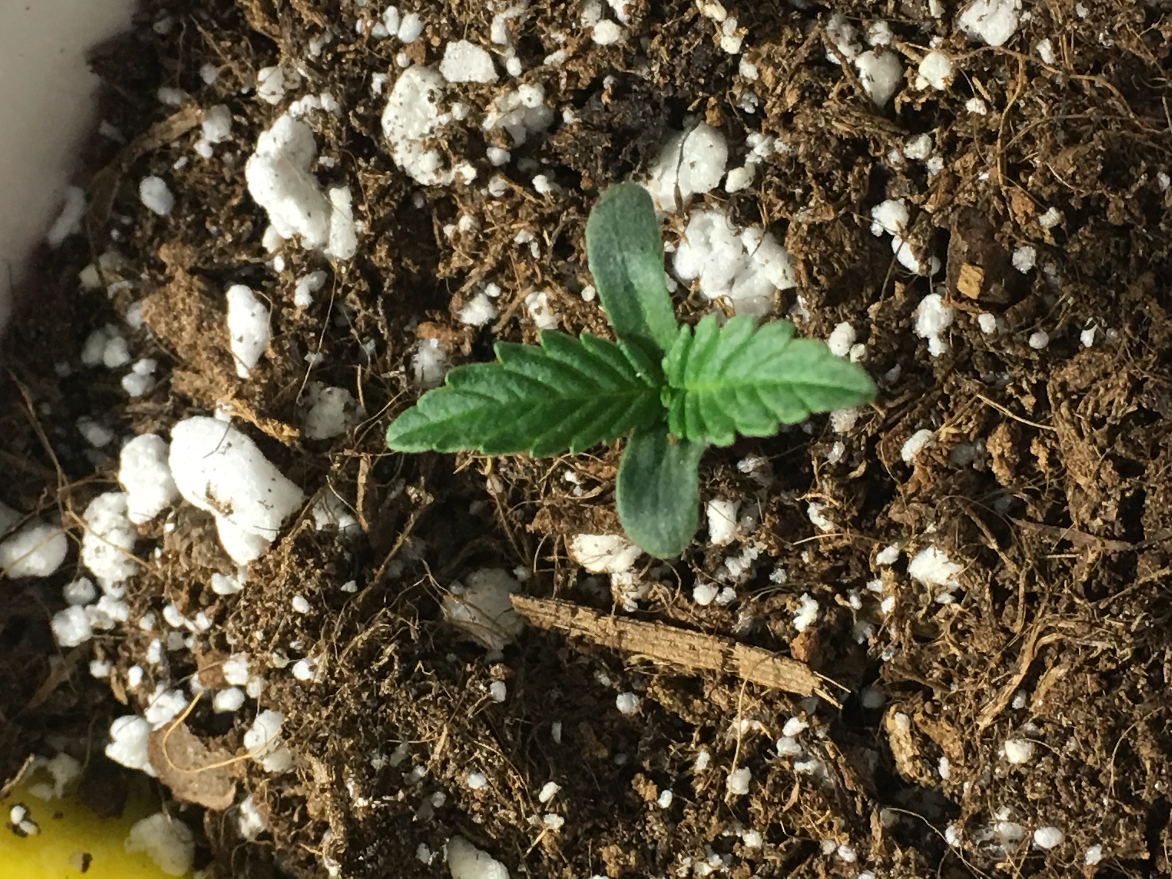 6000k cfl to start my seedlings for a week or two. Then i will be switching to 450 LED (actual watts 200 ish). I have a carbon scrubber with a 195 cfm inside with ducting going outside the tent, a 6" clip on fan and 3 seedlings. The seedling is a White Widow auto from i49. I placed it in distilled water for 18 hrs then paper towel for another 36. Then the tap root was about 1/2" long (it took a day longer then the other White Widow to get a tap root). It sprouted Oct 22 growing in 70% coco and 30% perlite. The temp ranges from 22 C to 26 C with an RH of 40% TO 46%. Now my question is should try to crack that seed without damaging the leaves or let it be?