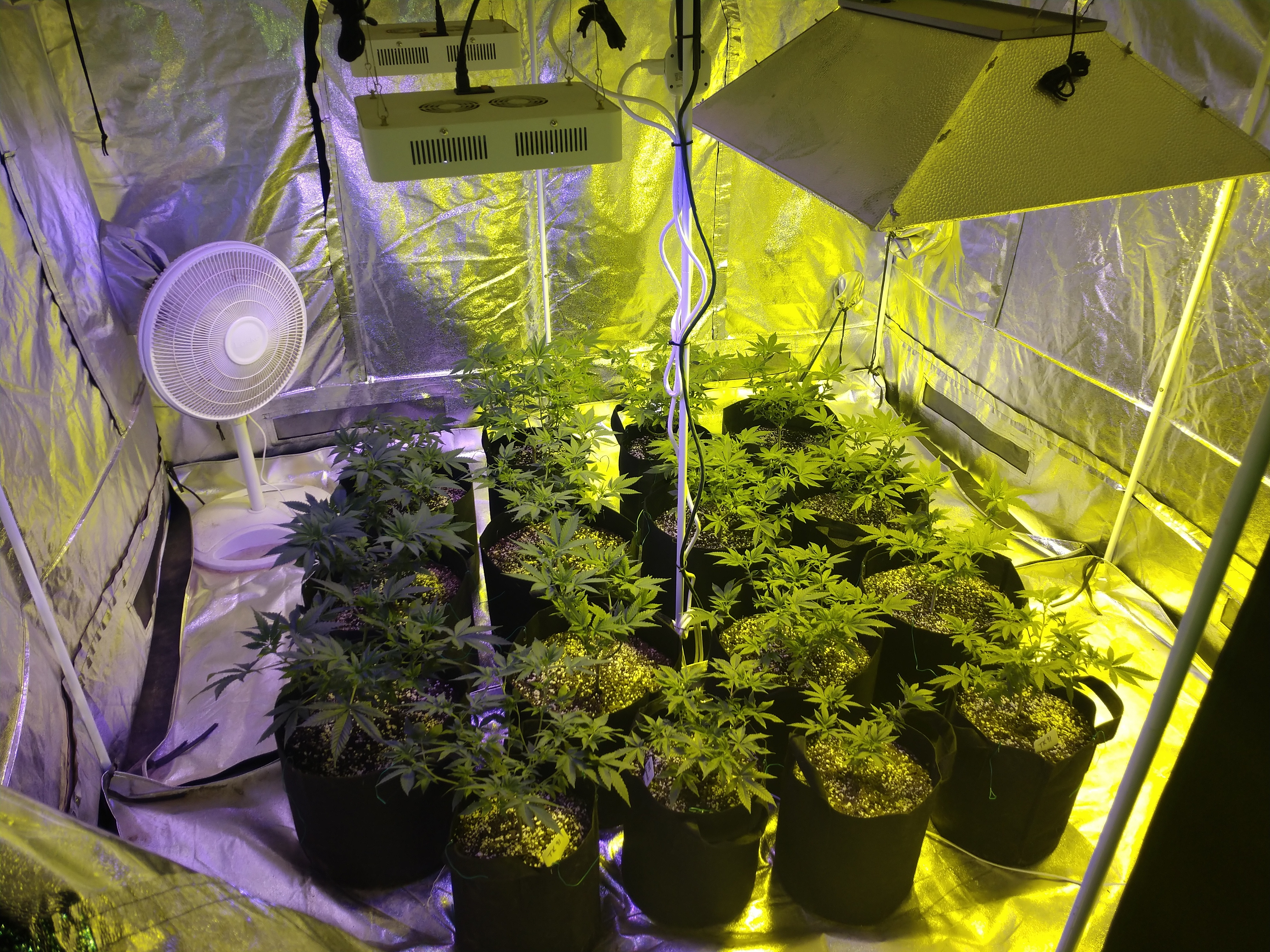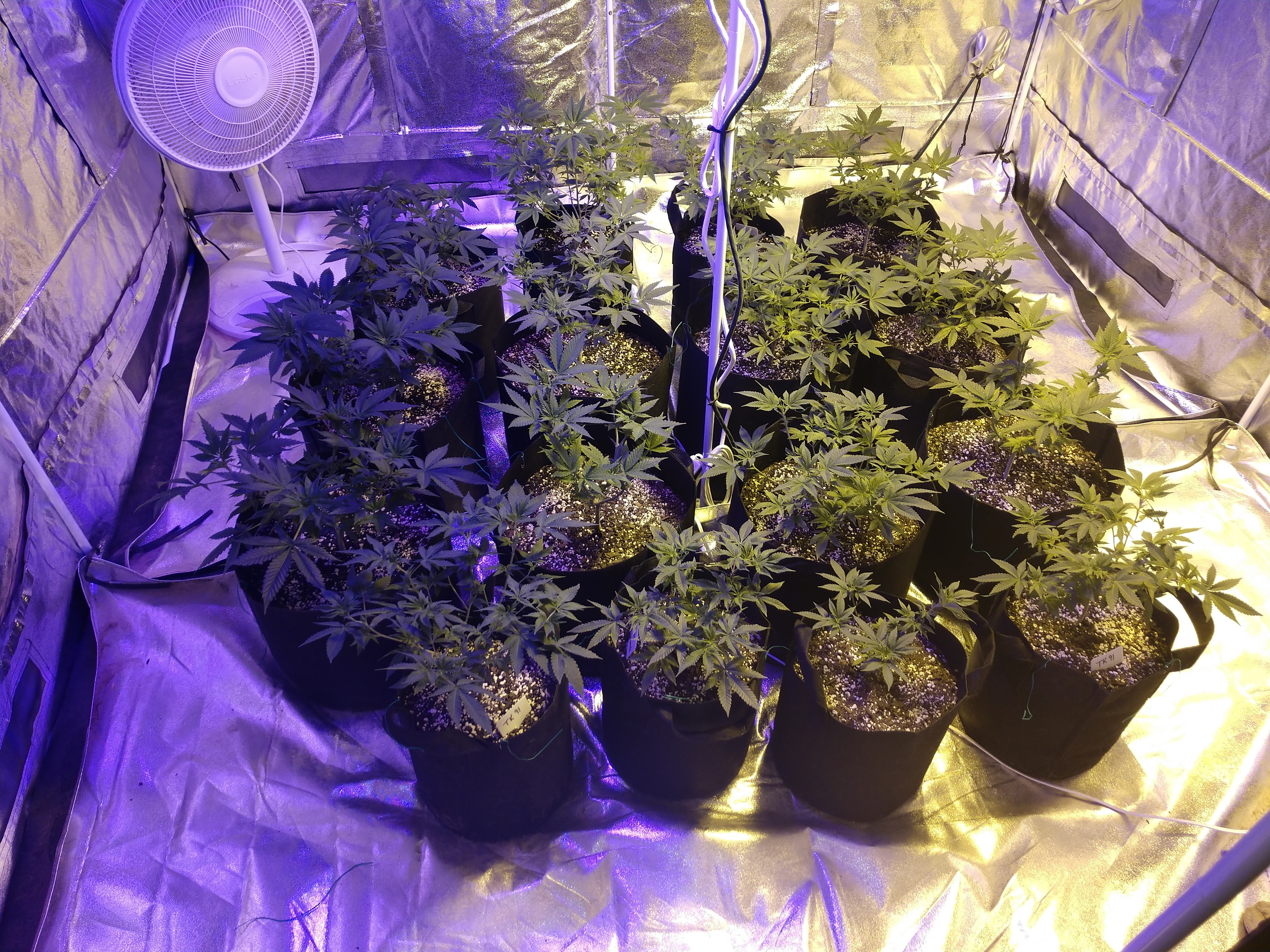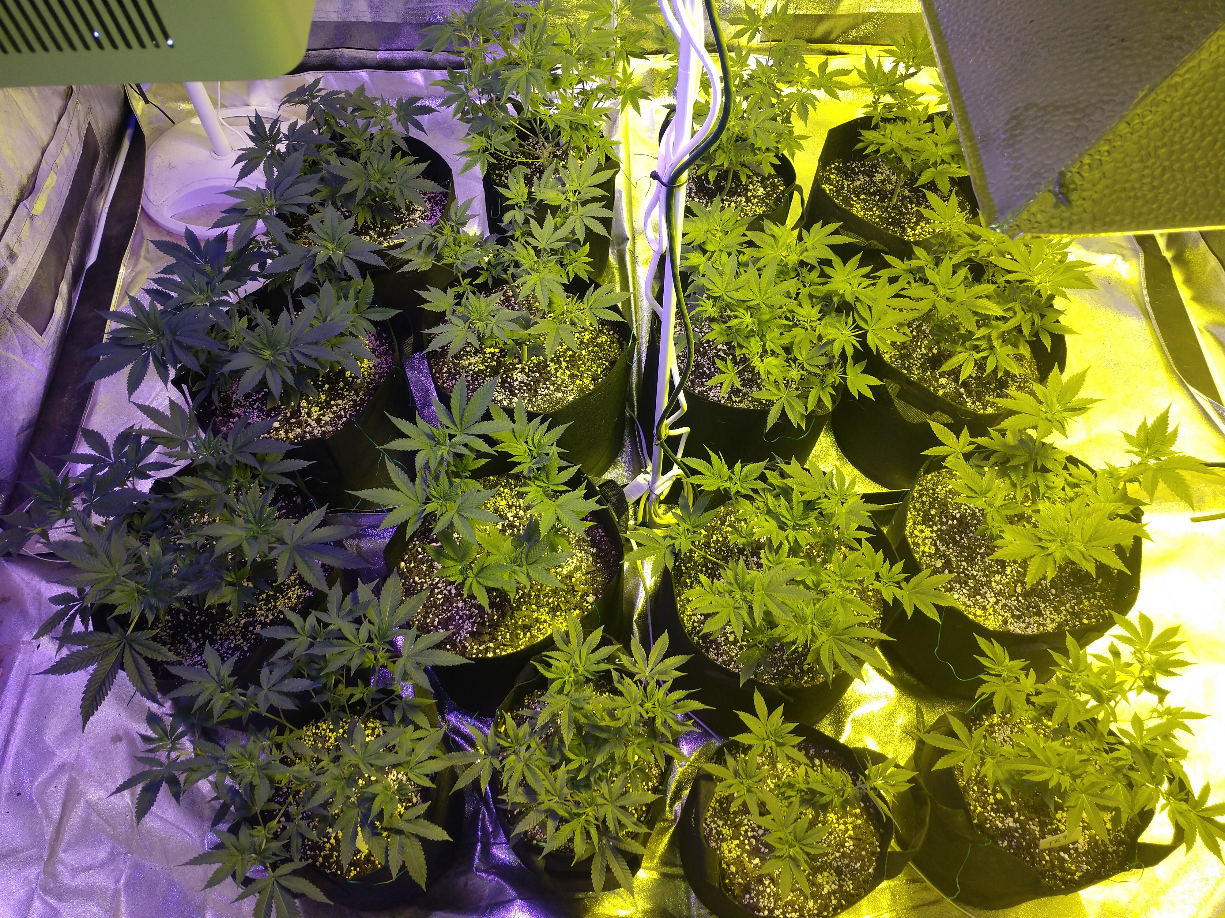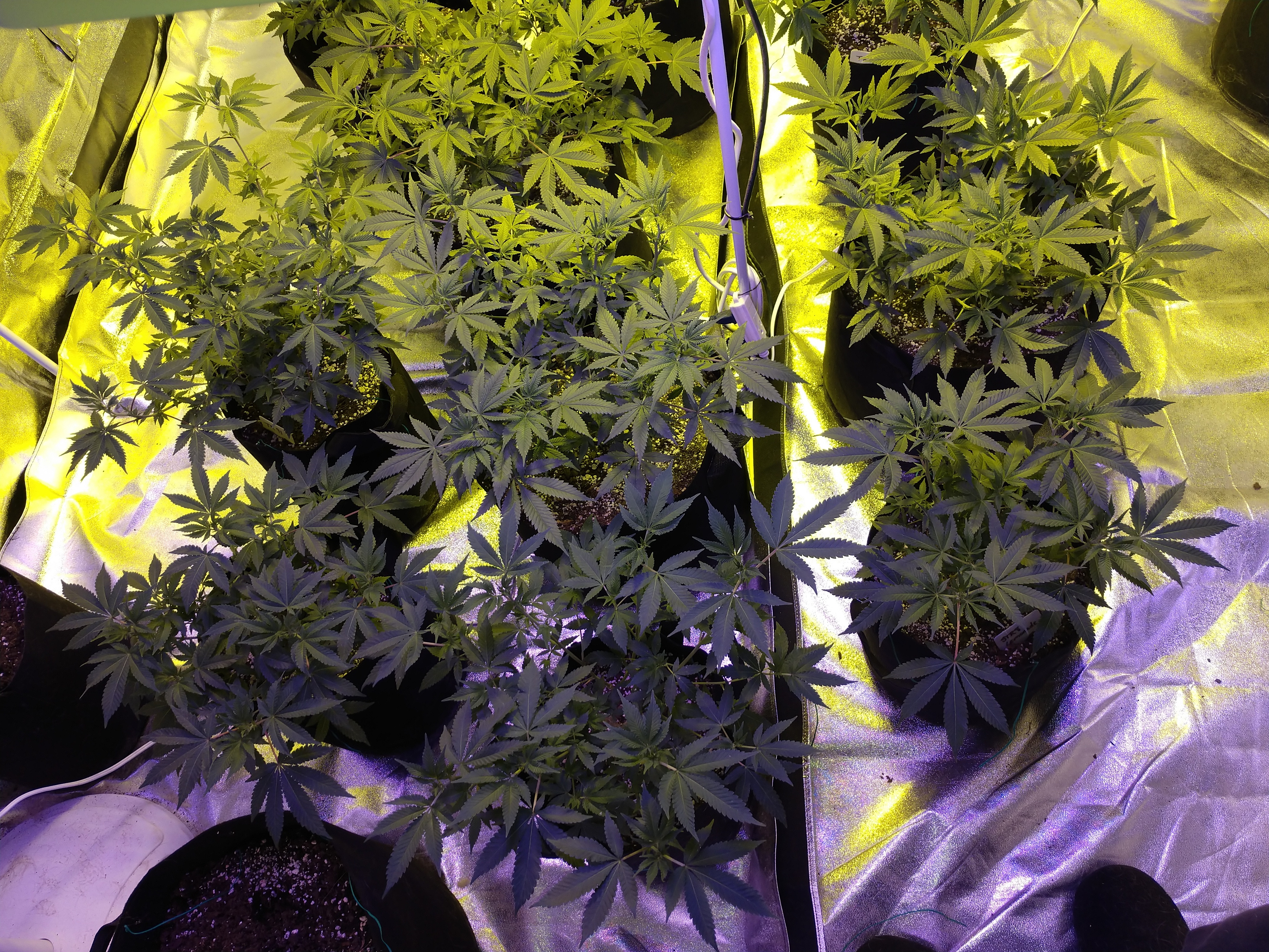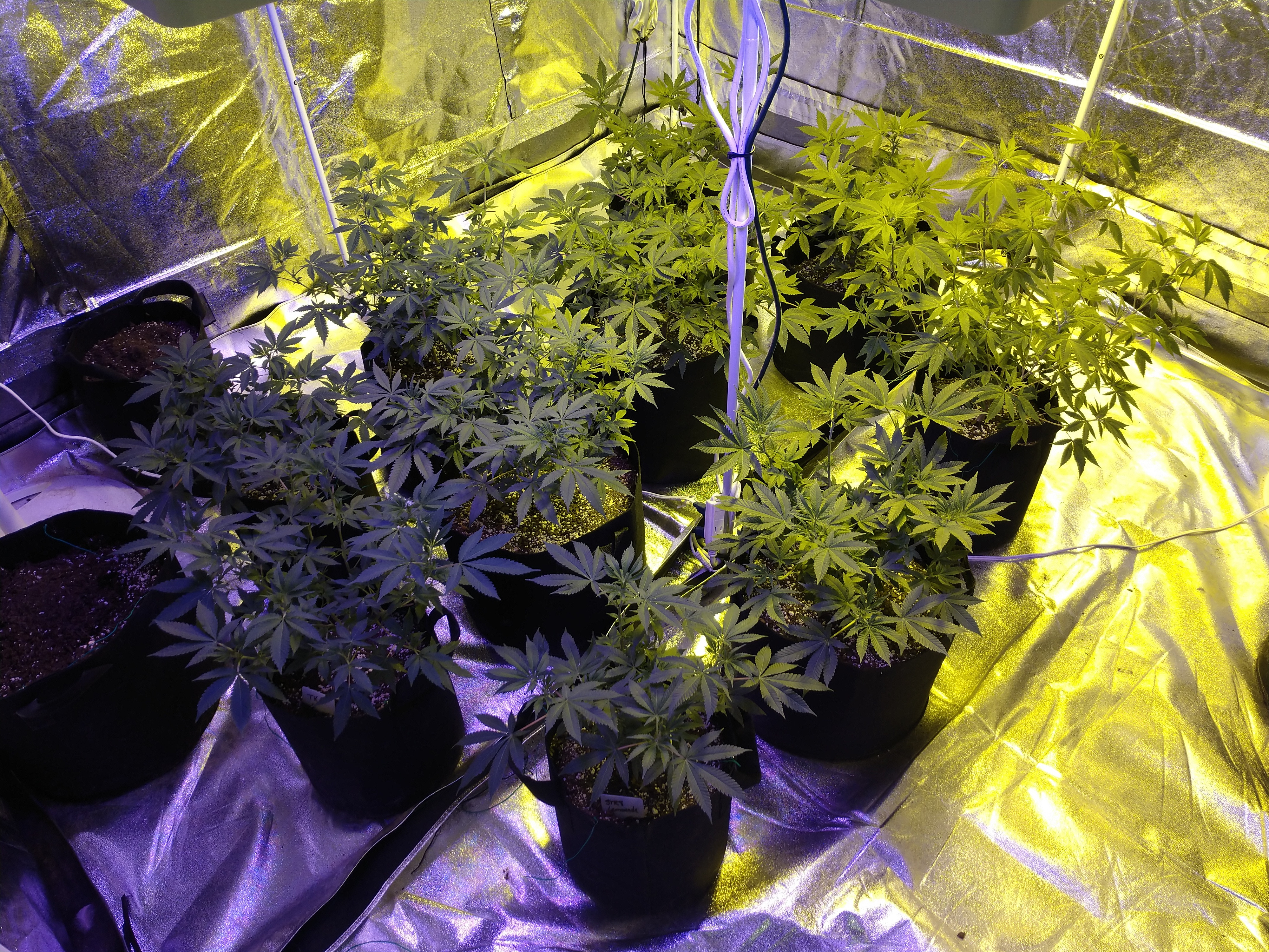 So I'm switching these over today. They're a little shorter than I was hoping for by now but I have to make sure to have room for more in a couple months. Just put the HPS light back in and have it set at 750W (1000W dimmed to 75%) and still have 2x1200W LEDs in there still. Growth was stunted at the beginning but once they started going, they really took off. So now I have 10 ladies in veg and already have the topping done on them for 8 mains. They're currently in a single 4x4' tent and will likely be splitting them up in about 3-4 weeks as I have 2, 4x4' tents. Using Fox Farms soil, combination of Happy Frog and Ocean Forest, with amended soil underneath. Only watering about every 3 days and so far going great. This is my first soil grow, for those of you who don't already know. Super excited about how well it's been going and can't wait for the finished product. I'll try and keep you all updated as they progress through flower. I have 3 strains going, GG, Str8 Lemonade and TK91. All but the GG were found in bags from the dispensary, the GG I got from a grower way back. Have had great female/seed ratios from the dispensary but may end up with a couple GG males. Crossing my fingers there but we'll see. Anyway, here's some pictures of my 8x8' with both kinds of lights and the ladies of course.