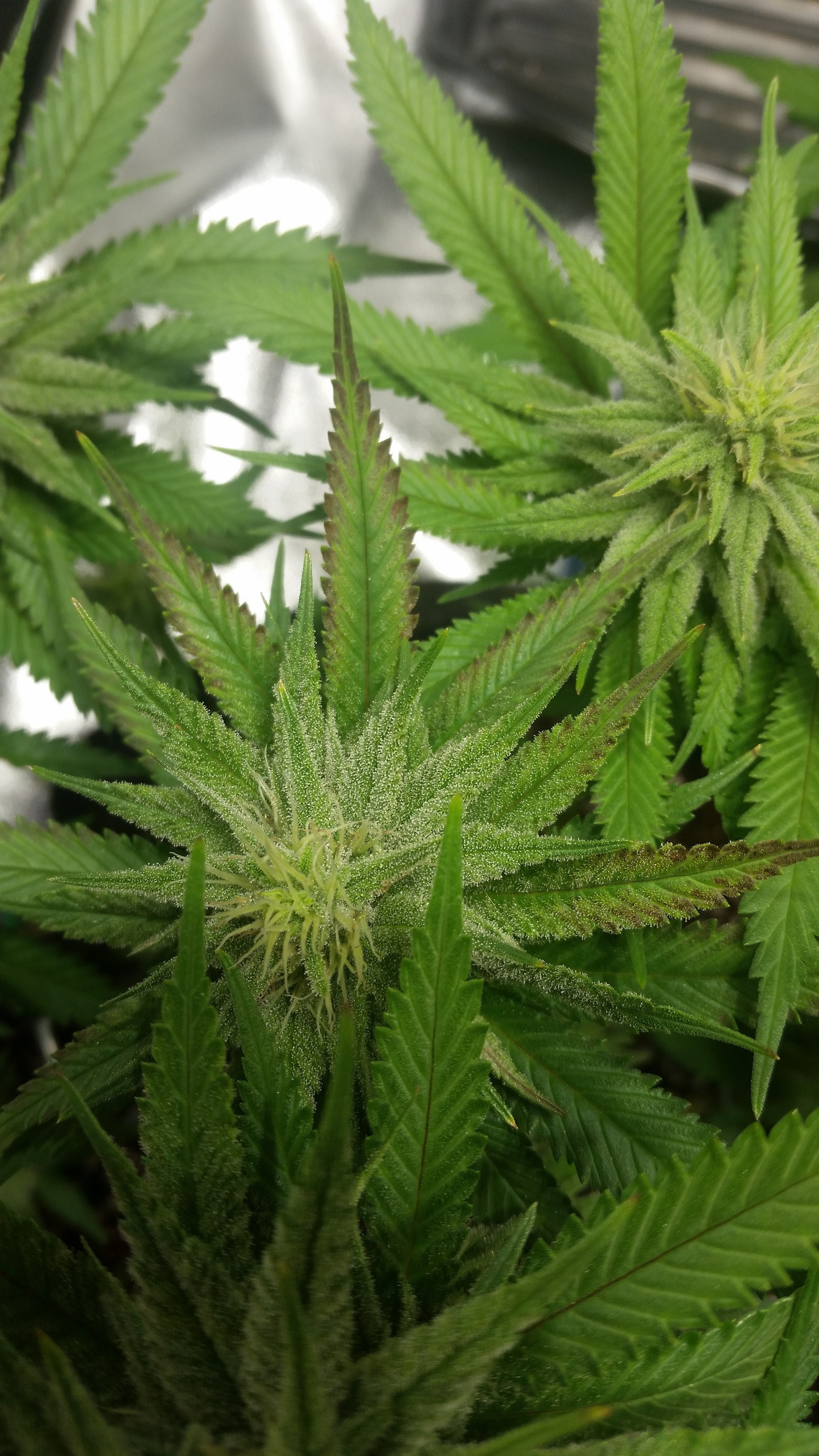 Just noticed it on another plant. I mixed 2x 1 gallon jugs of nutes with the same ammt of nutrients in each. Those 2 plants were watered with those nutrient solutions so im pretty confident it's nute burn now. The question is, how bad is it...do i need to flush? I'm gonna keep an eye on them and if the seem to get worse i'll flush. I forgot to half the dosage on the liquid kool bloom i think is the problem. Well, oopsies...