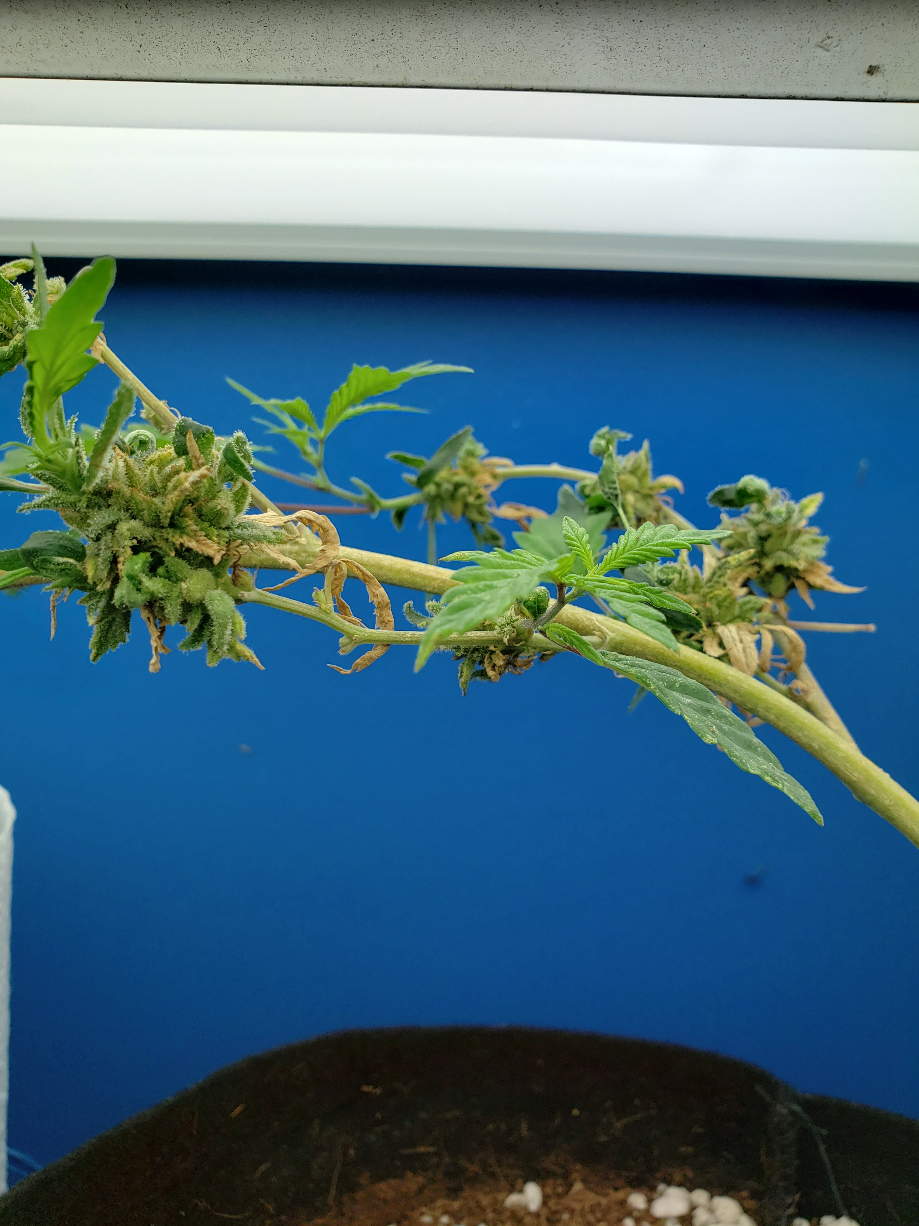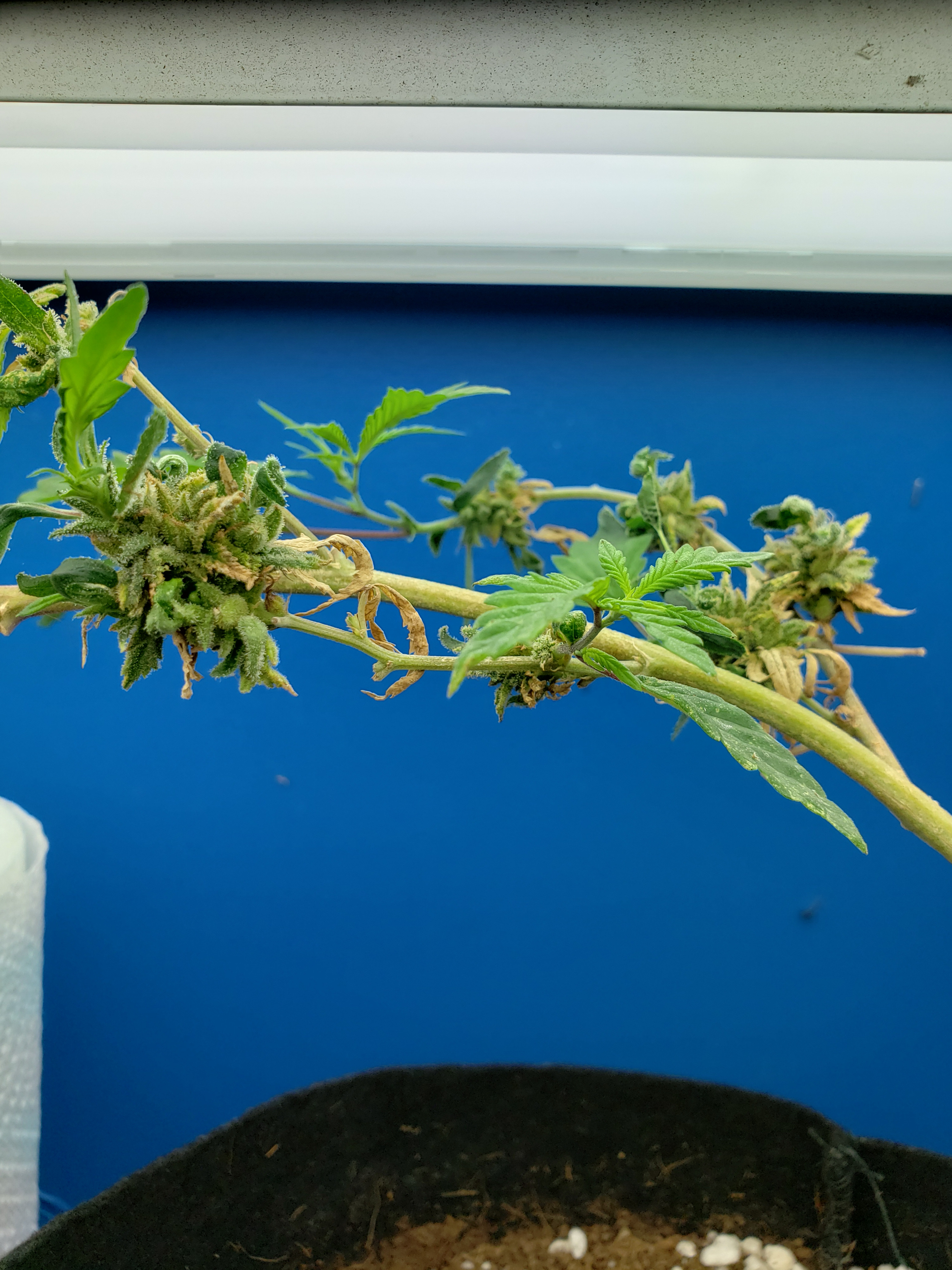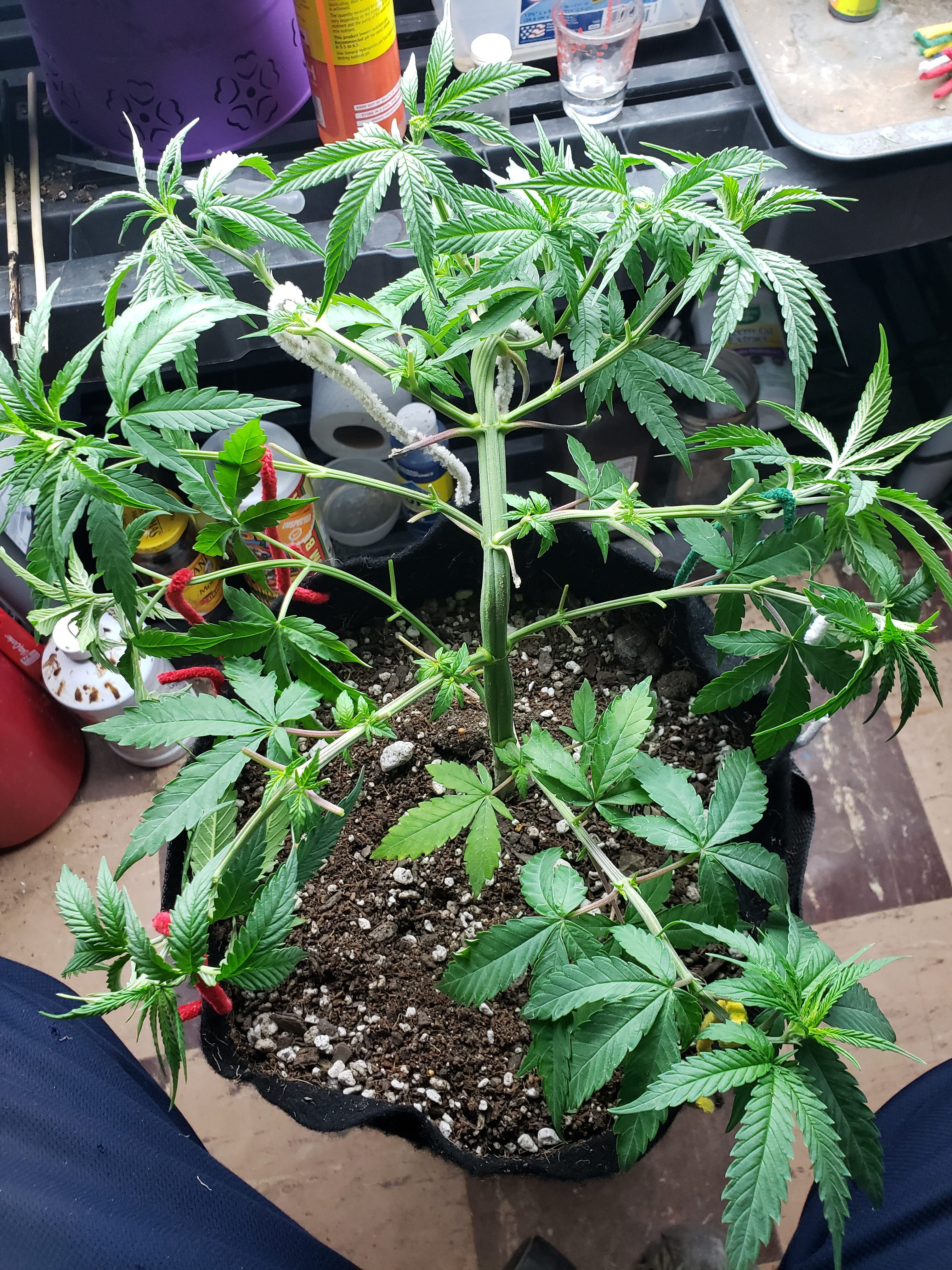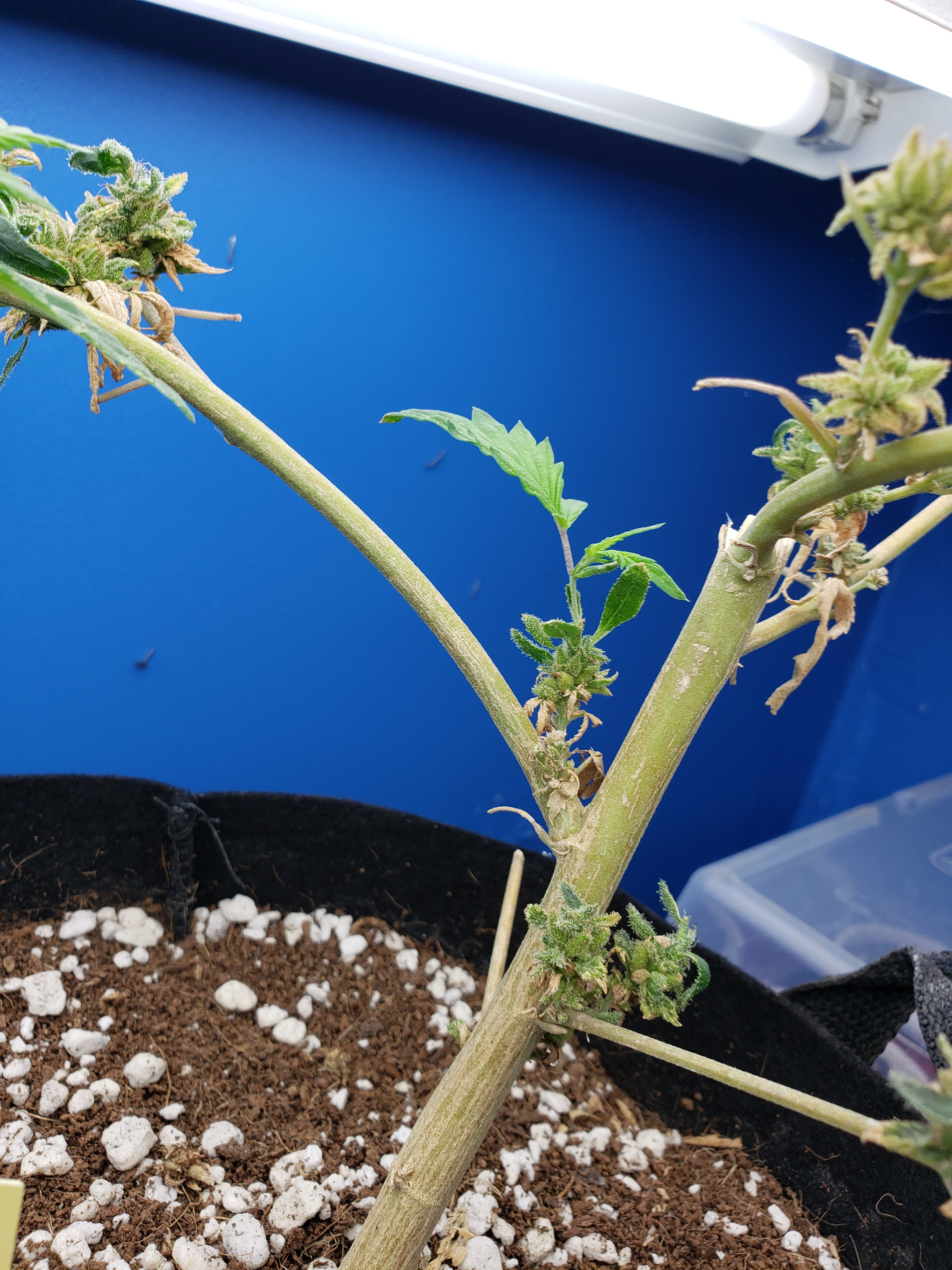 With my son home for the first time in months and getting my fill of Grandkids, my garden has gone with way less attention than normal. Just in the last week a few spider mites have blossomed into hundreds, so wipe down with soapy cloth this coming week for all my plants, but especially this revegging female. This is an important plant for me to preserve so it will get alot of attention in the coming week. But look at the new growth! Mr.furley looks like I will have cloning material for the solo cup grow!