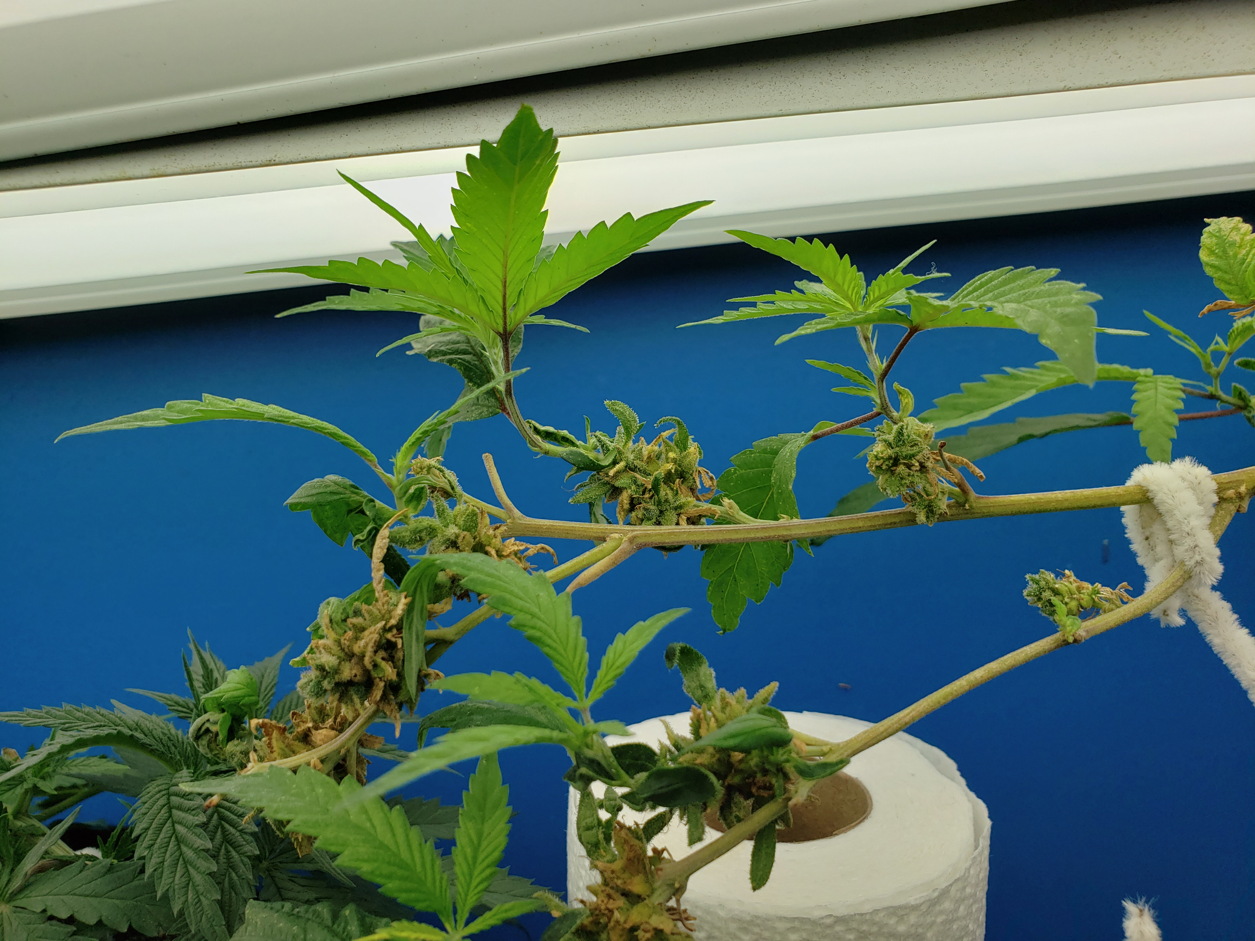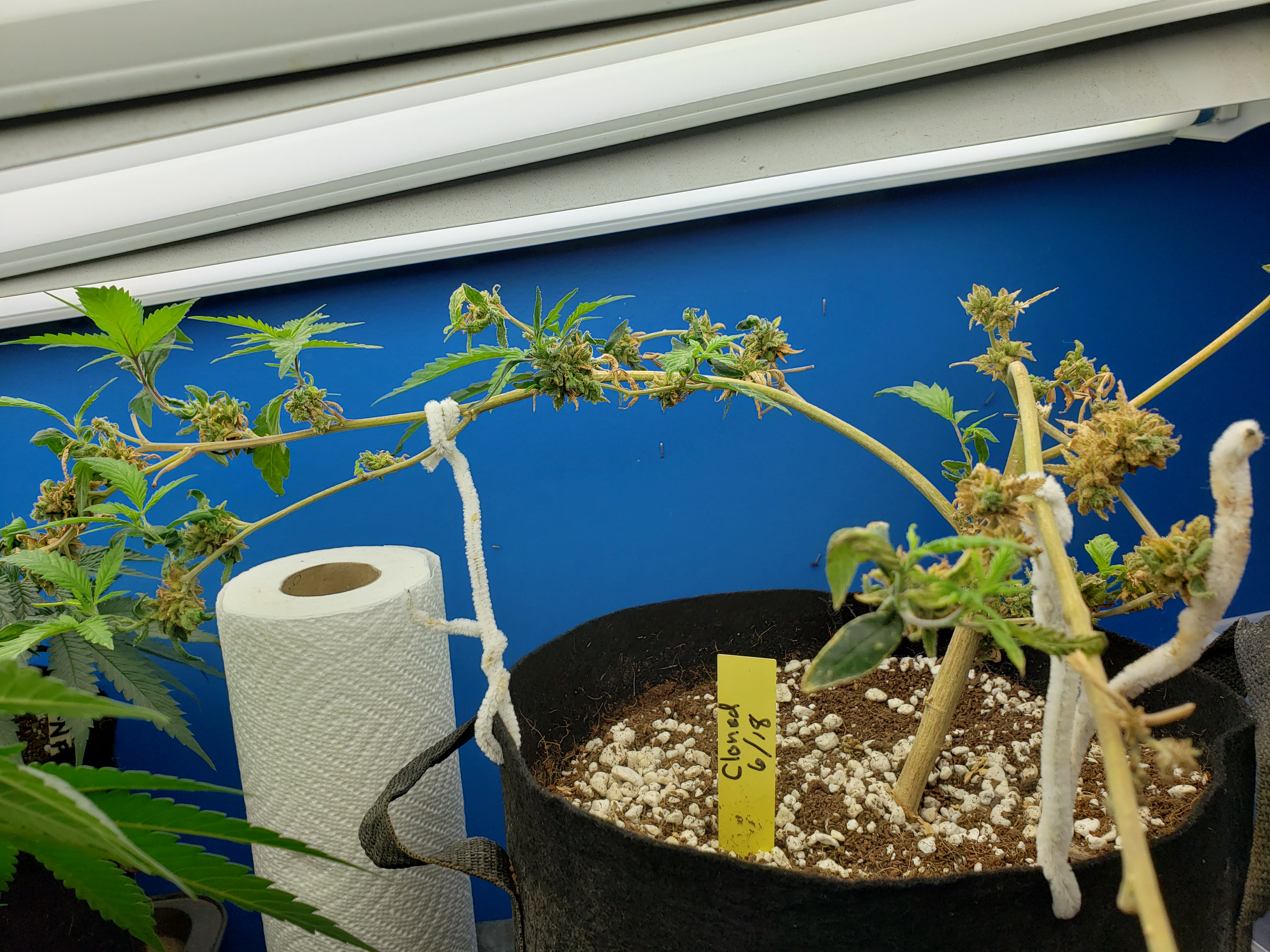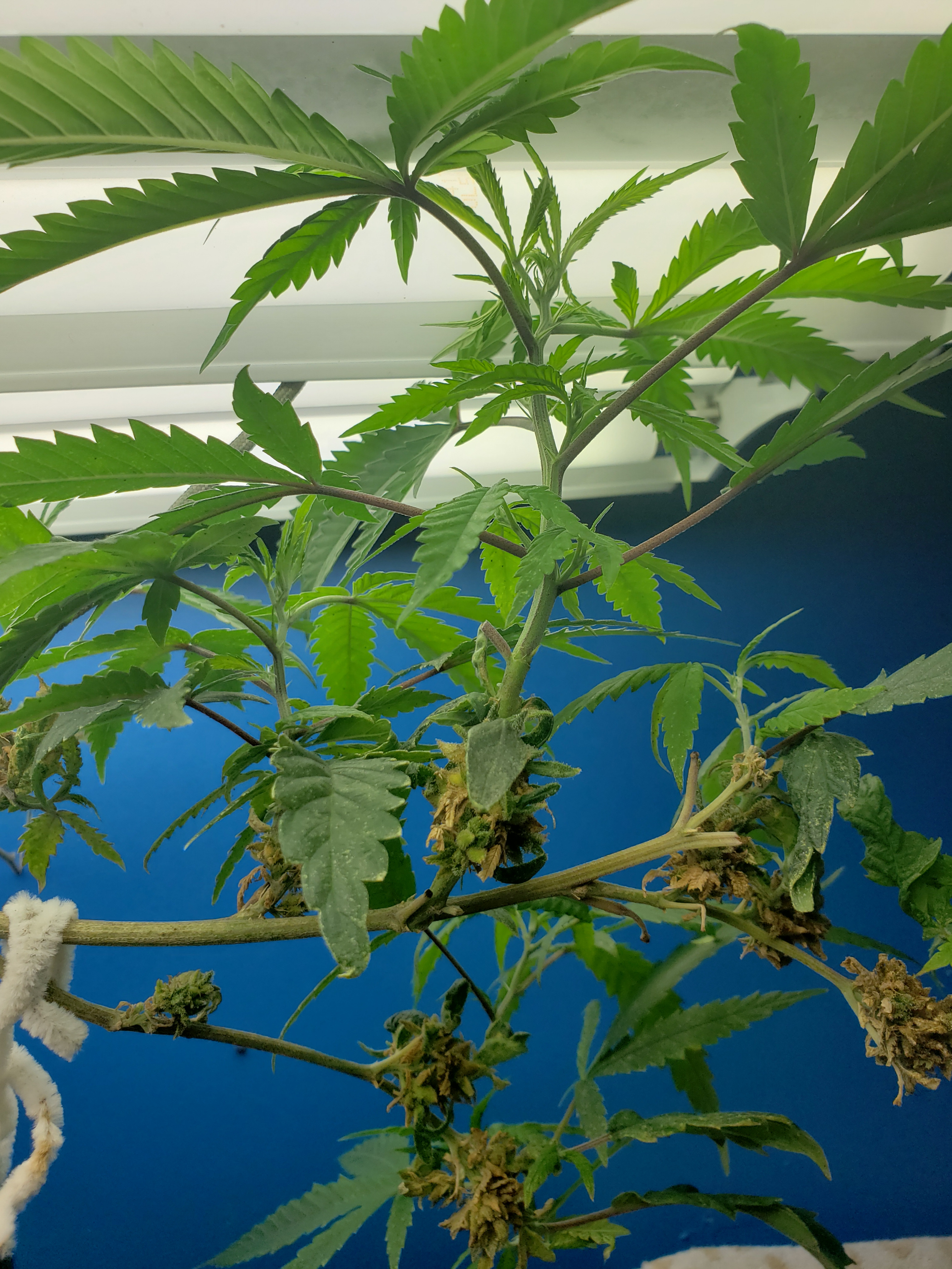 With my son home for the first time in months and getting my fill of Grandkids, my garden has gone with way less attention than normal. Just in the last week a few spider mites have blossomed into hundreds, so wipe down with soapy cloth this coming week for all my plants, but especially this revegging female. This is an important plant for me to preserve so it will get alot of attention in the coming week. But look at the new growth! Mr.furley looks like I will have cloning material for the solo cup grow!