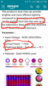 Just looked up on amazon and found a prime example. In this listing they say 1000w led grow light but then in the description it says 110w. This is bullshit. Its a 110w light not 1000w. You can tell cause you couldnt get a 1000w anything for that cheap. A true 1000w led would cost several hundred dollars. https://www.amazon.com/Sale%EF%BC%81...3939080&sr=8-6