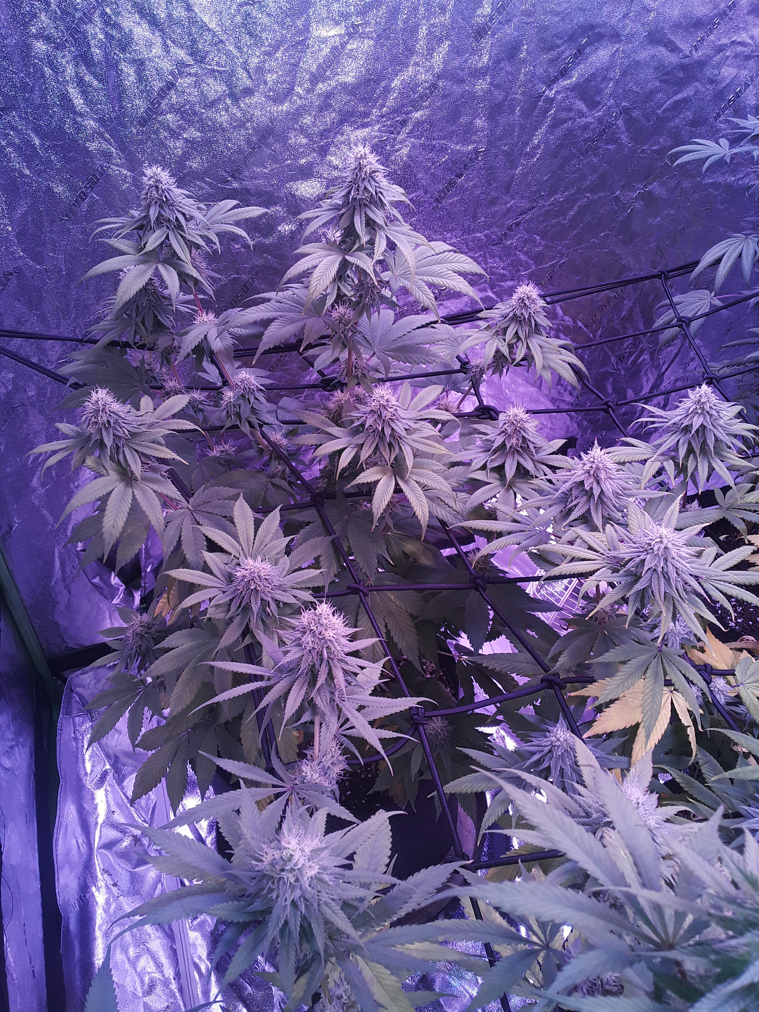 Day 49 of flower. My most mature plant has like 5% amber tricromes, so pretty much I saw a couple turning on the most tippy top buds.the rest of plants are just starting to get milky or still clear but most tricromes have heads at this point. A few plants are starting to drop leaves now and some are barely starting to yellow on the bottoms. My two most finicky plants, which have seemed to claw and just overall not like anything have done are still producing nice looking flowers. I have fed the least mature plants what I think will be their last feeding of big bloom with a little blackstrap molasses and the rest I gave water with molasses. In 4 days half will start ph water flushing and the slow girls will get a little more sugar water. My weakest plant will yield at least 35 grams of final product. As of right now I am looking at an overall yield of well over a pound from 11 plants, but less than 2 for sure. Hard to tell at this point because some buds swell every day and others have stopped growing bigger. I am so happy with this but also know I could have done better. Next time I'm going to kill it.