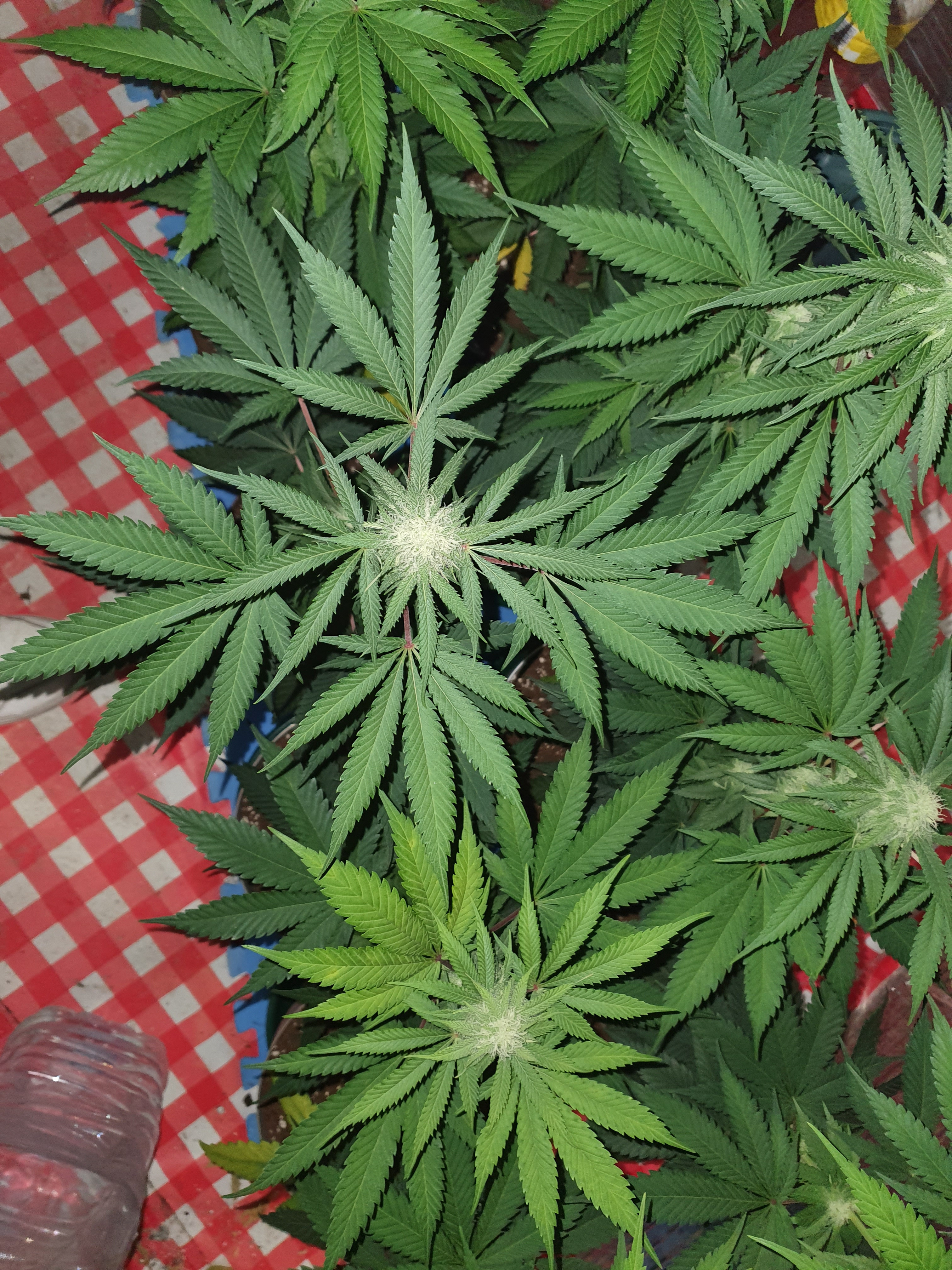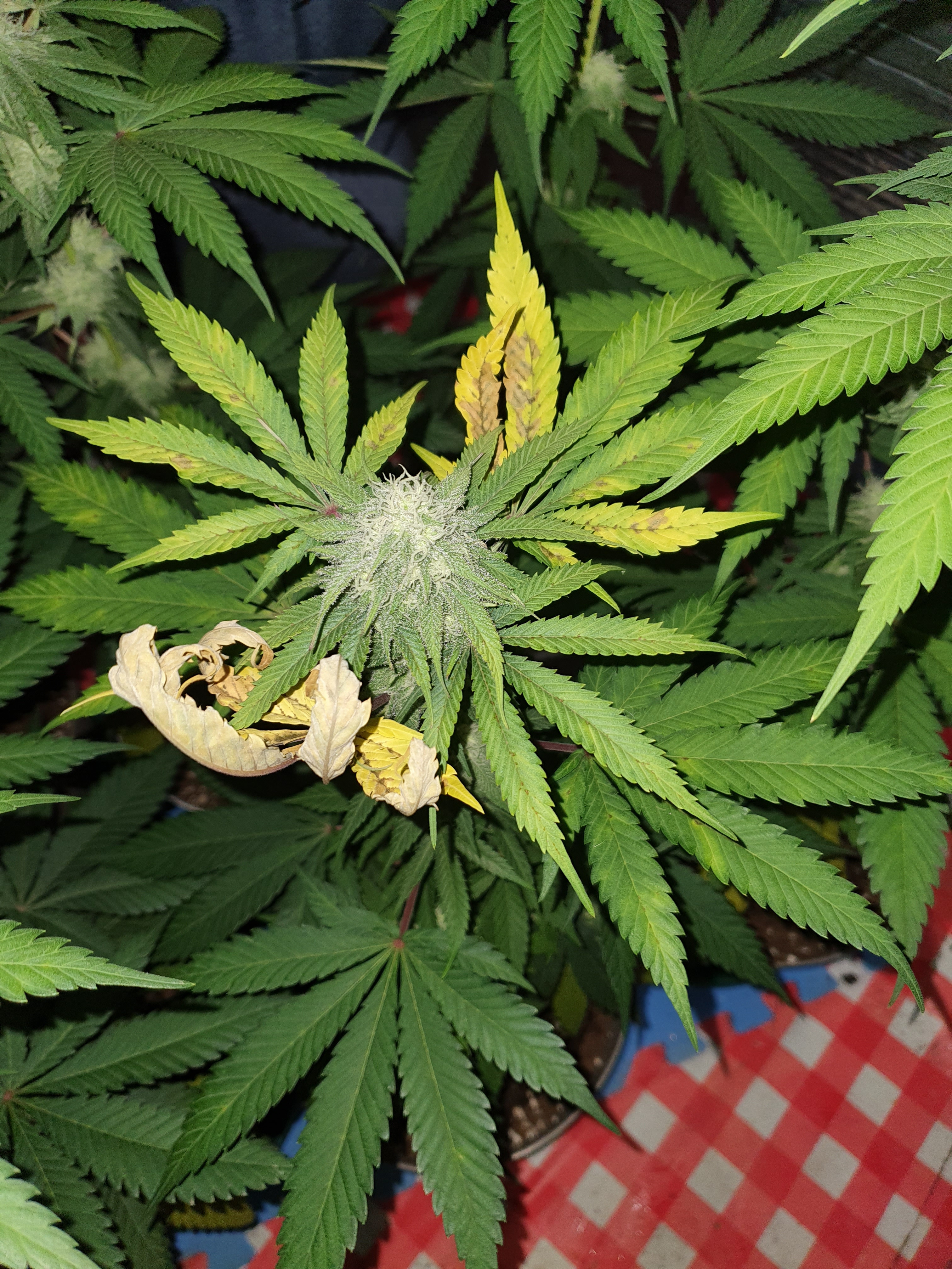 Some of them have yellow leaves( likely to drop) in the bottom first too but i read thats normal when they start flowering..