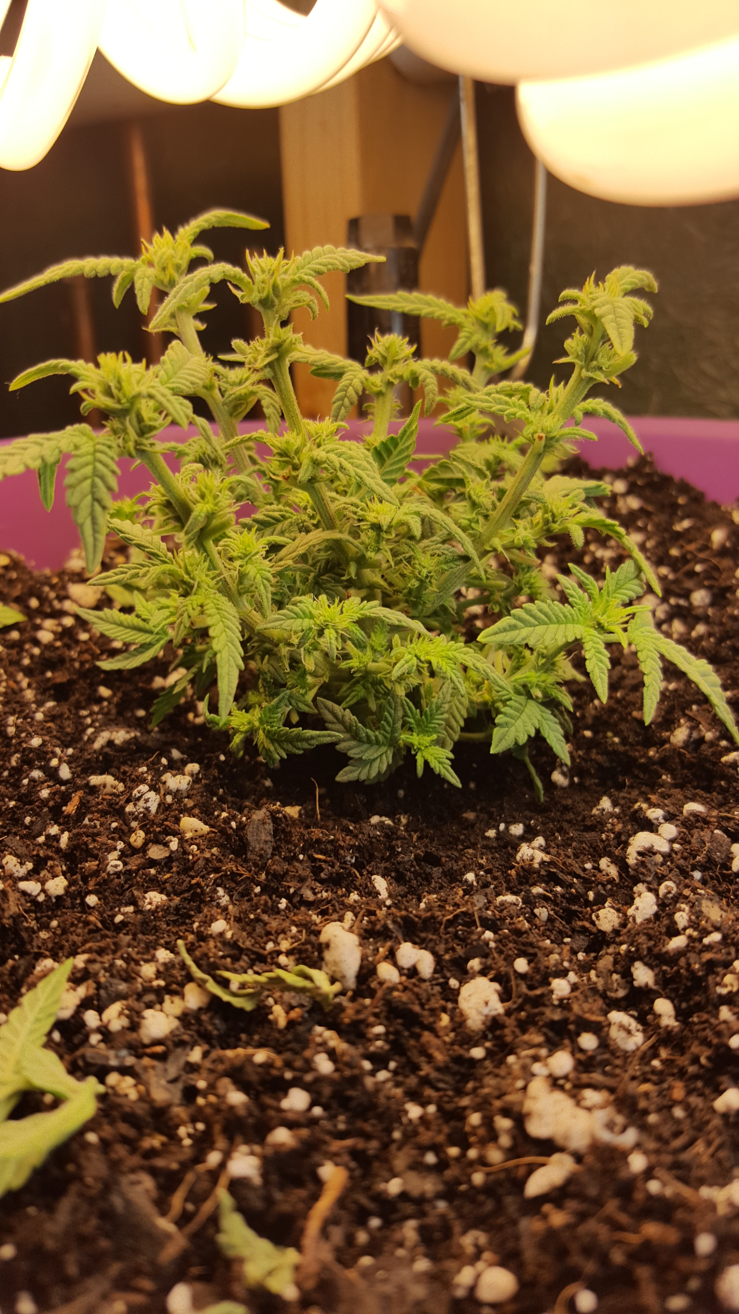 Well the wife said...Hell no you ain't killing that baby...so here it is...Day 34...I have never had a tiny plant like this...little runt deformity... little thing is full of three-finger leaves... when it's all bud it will look pretty cool I guess...pure waste of energy...no tie-down training.. only defoliation which she actually likes... she is grown tons nodes and Bud sites she's just a small Little runt.. probably only will get a dime bag out of her...lol