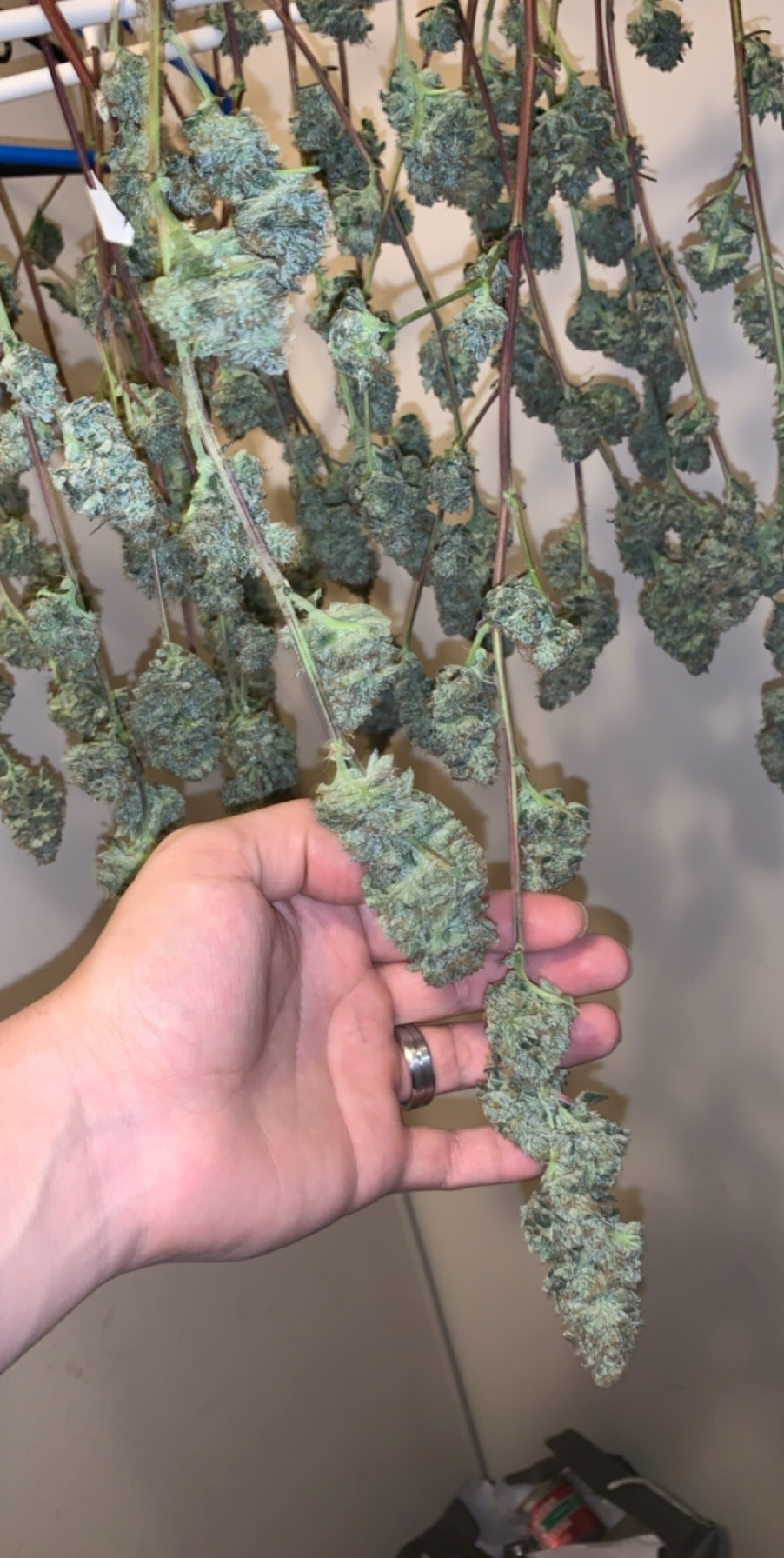 weigh it when its cut and multiply that by .25 you will loose 75 % weight in drying when its on the stem try to break a small stem off if it snaps easily its readynew grow room built summer of 2017 ,argo max tent for veging ,big kahuna reflector, 1000hps with added leds for the full spectrum . 15th indoor grow ,5 years outside gorilla grows(stealth is the key),veg under t5s growing autos under 300w leds