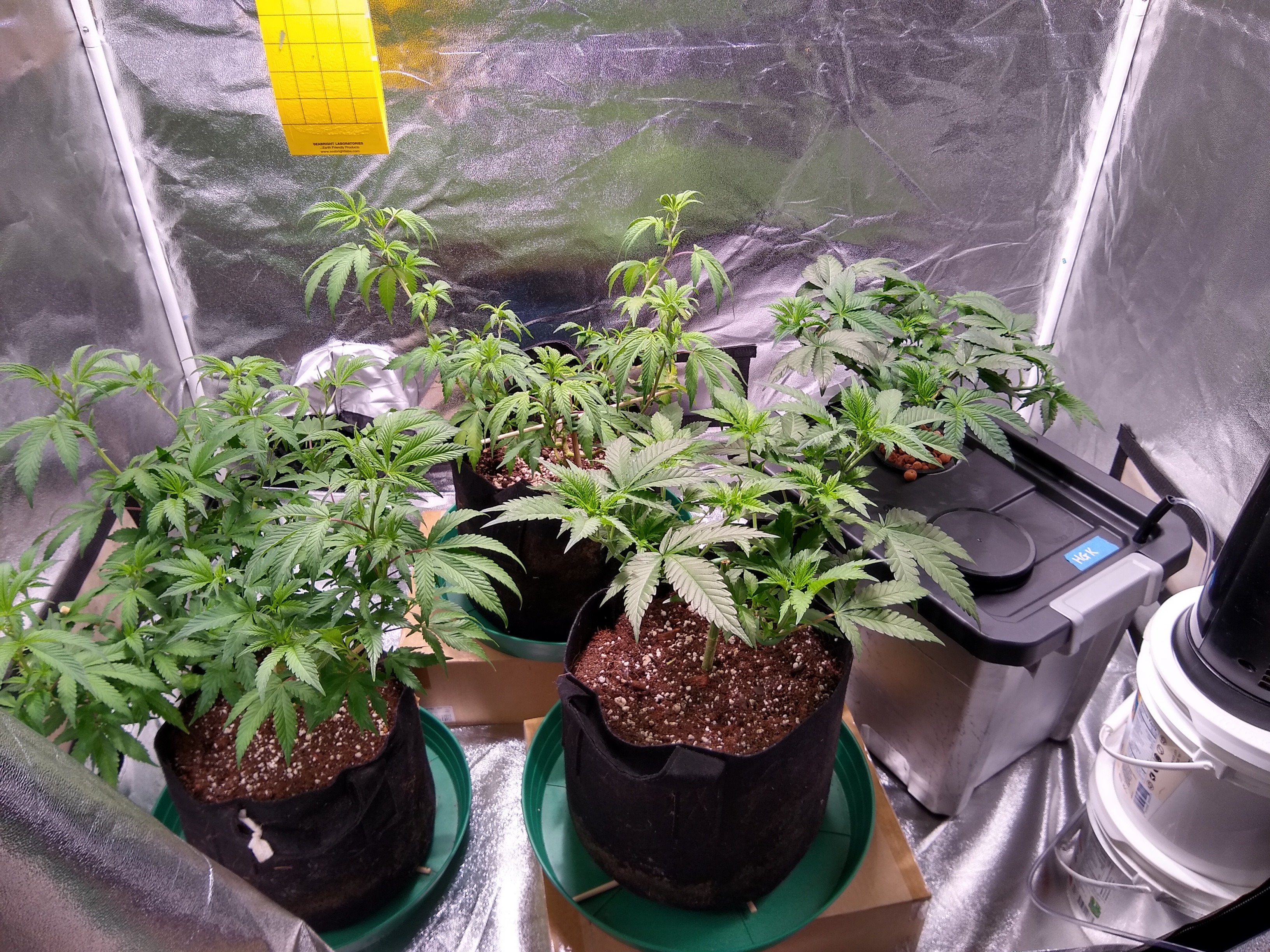 In the tent, getting close to flip, possibly today. Mango are the two on the left, and left rear. Front center is Big Bud which has being quadlined. Her top is the clone, the first nice big roots out of the New Year's Clone Along and Solo grow, although that BigBud top clone is going into a hydrobucket with one of her side clones, might see how fast a two-header gets ready for flip.