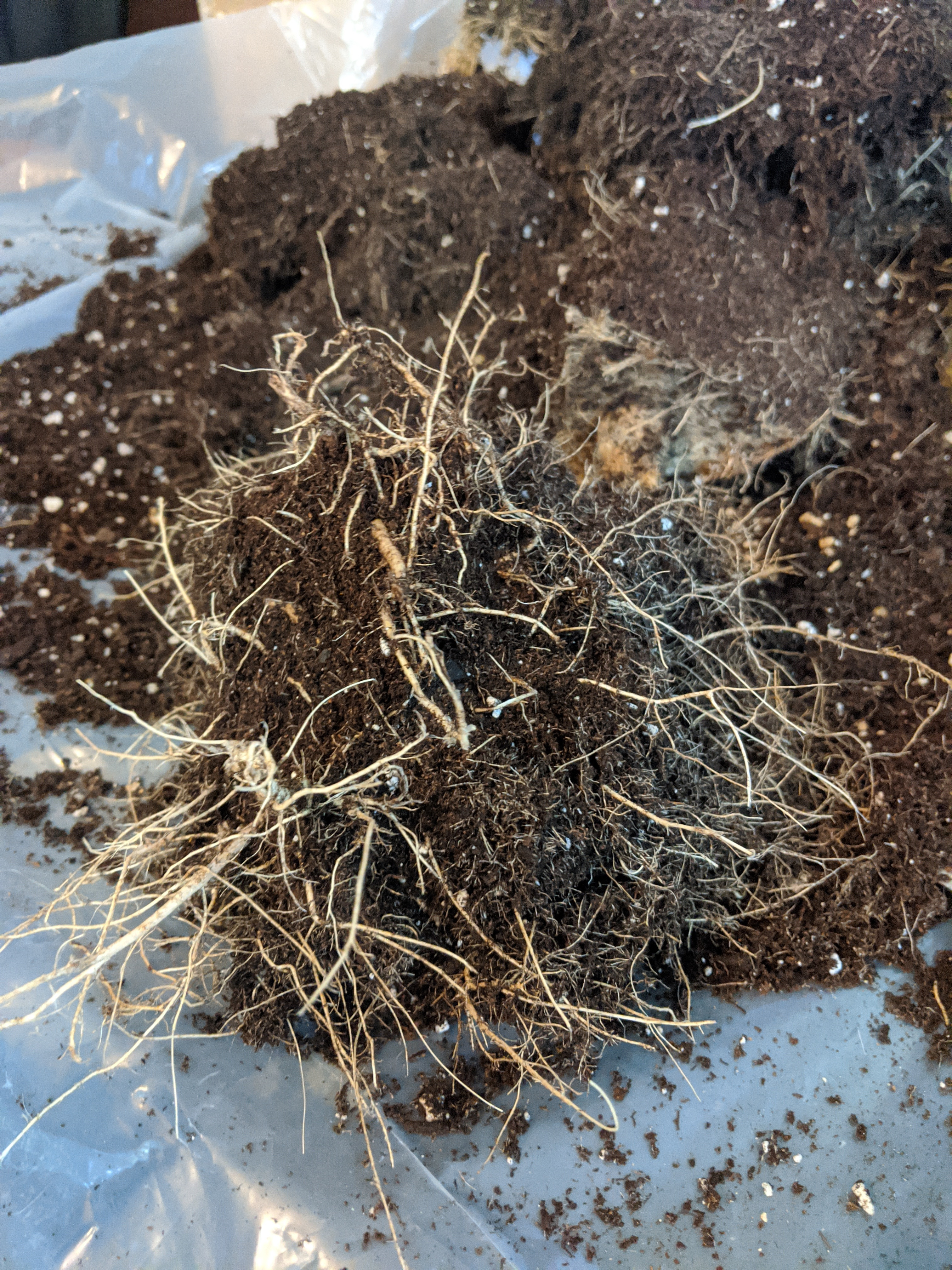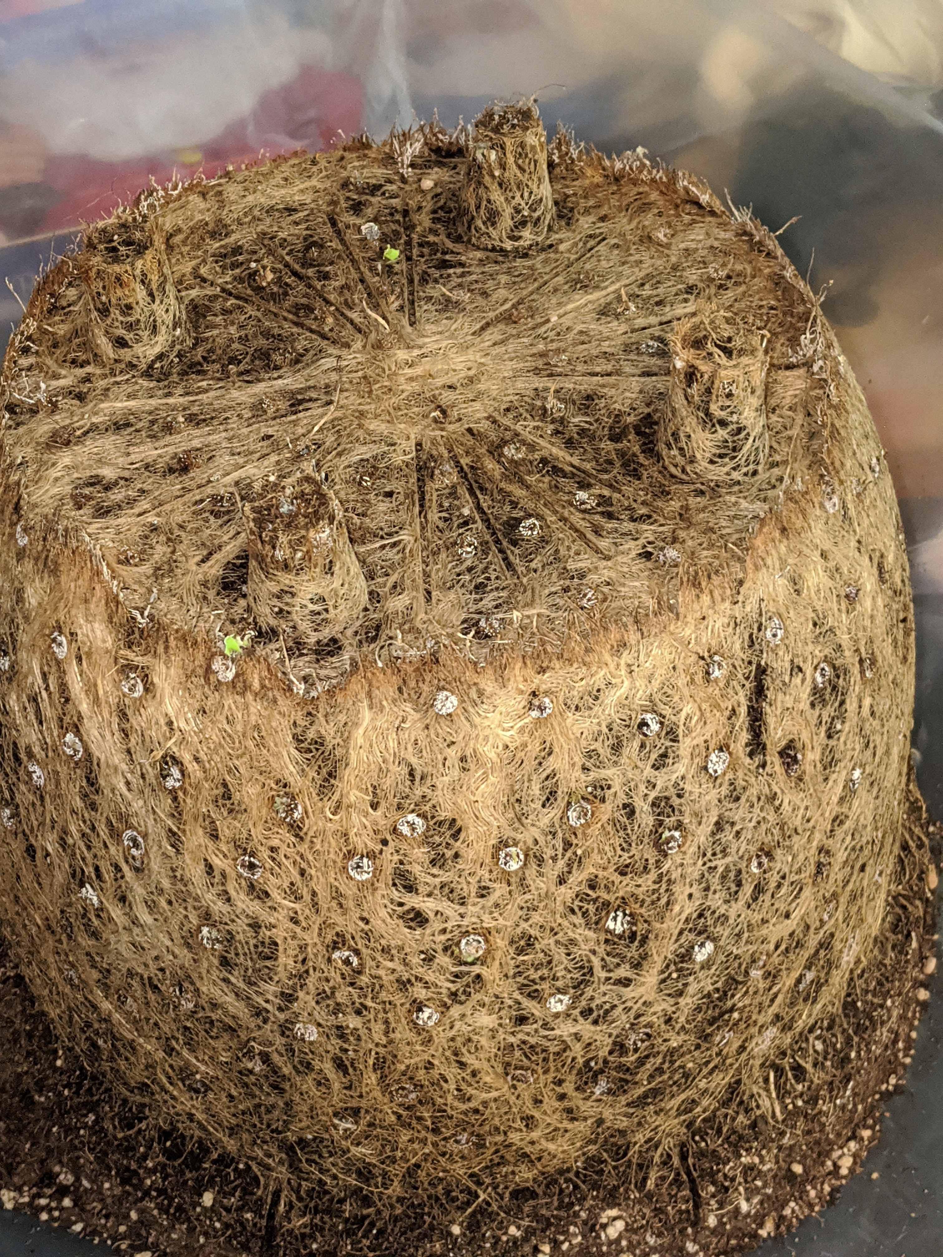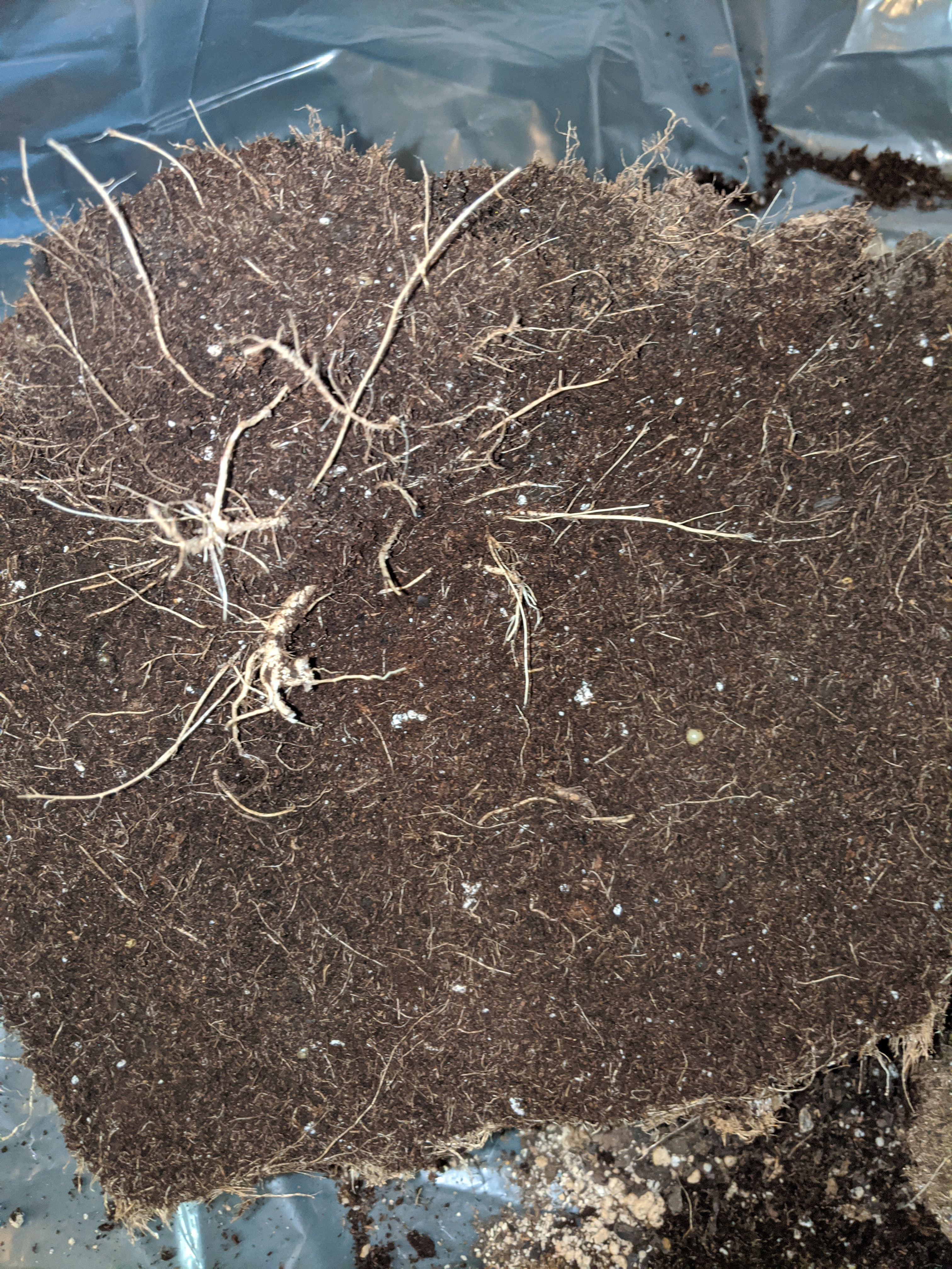 My first grow went far batter than I could have imagined. I never saw any issues with my grow. I was curious about my root structure, dumped the pot - wow. Very root bound. Decide to dissect it to see what the core looked like. Comments on root structure or anything in general are very welcome because other than a massive ball I don't know exactly what I'm looking at . It was very dense and spongy while cutting in half , think of a cake made from moss. I gently brushed away dirt trying not to destroy roots as I did. I made a diy air pot, that is why it looks polka-doted - why are they white , any one know?