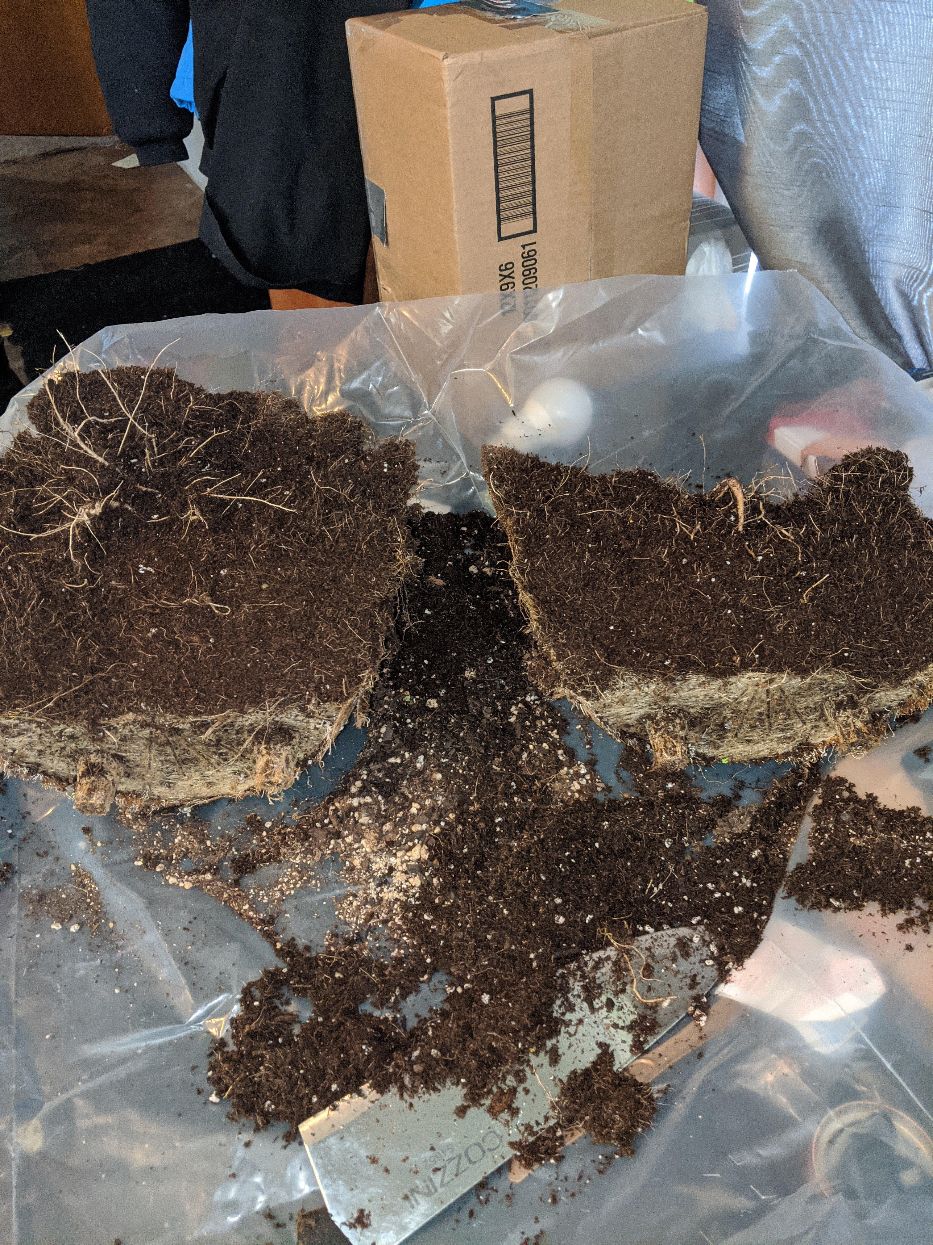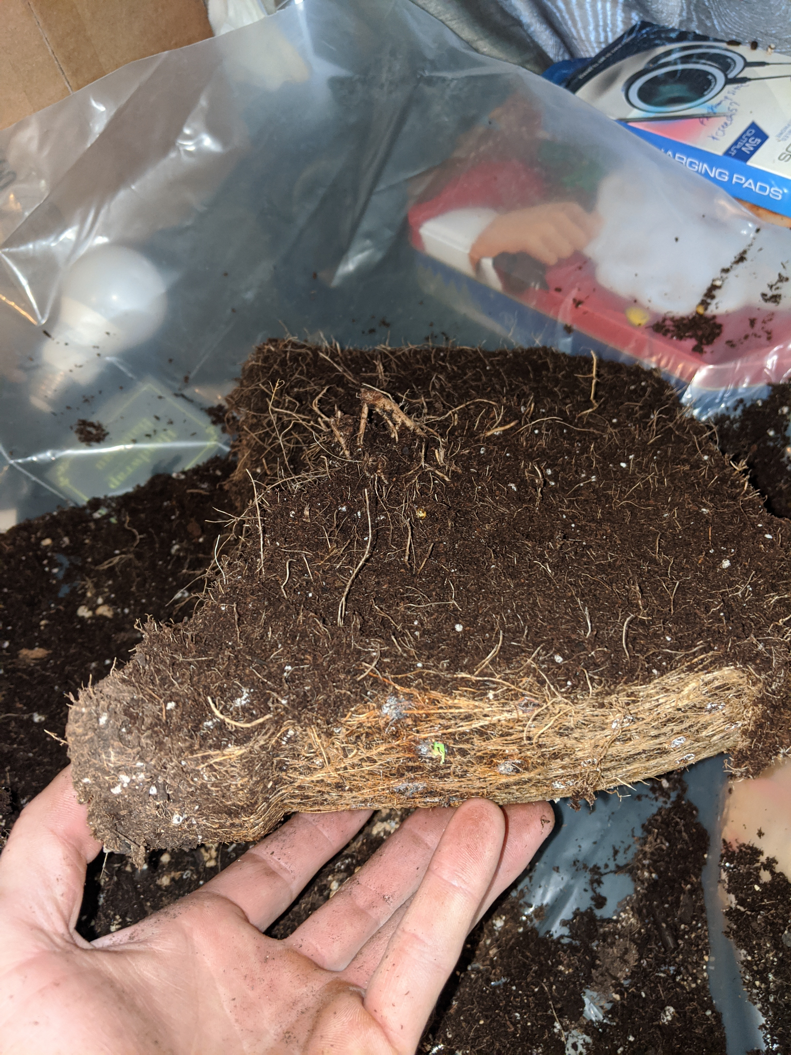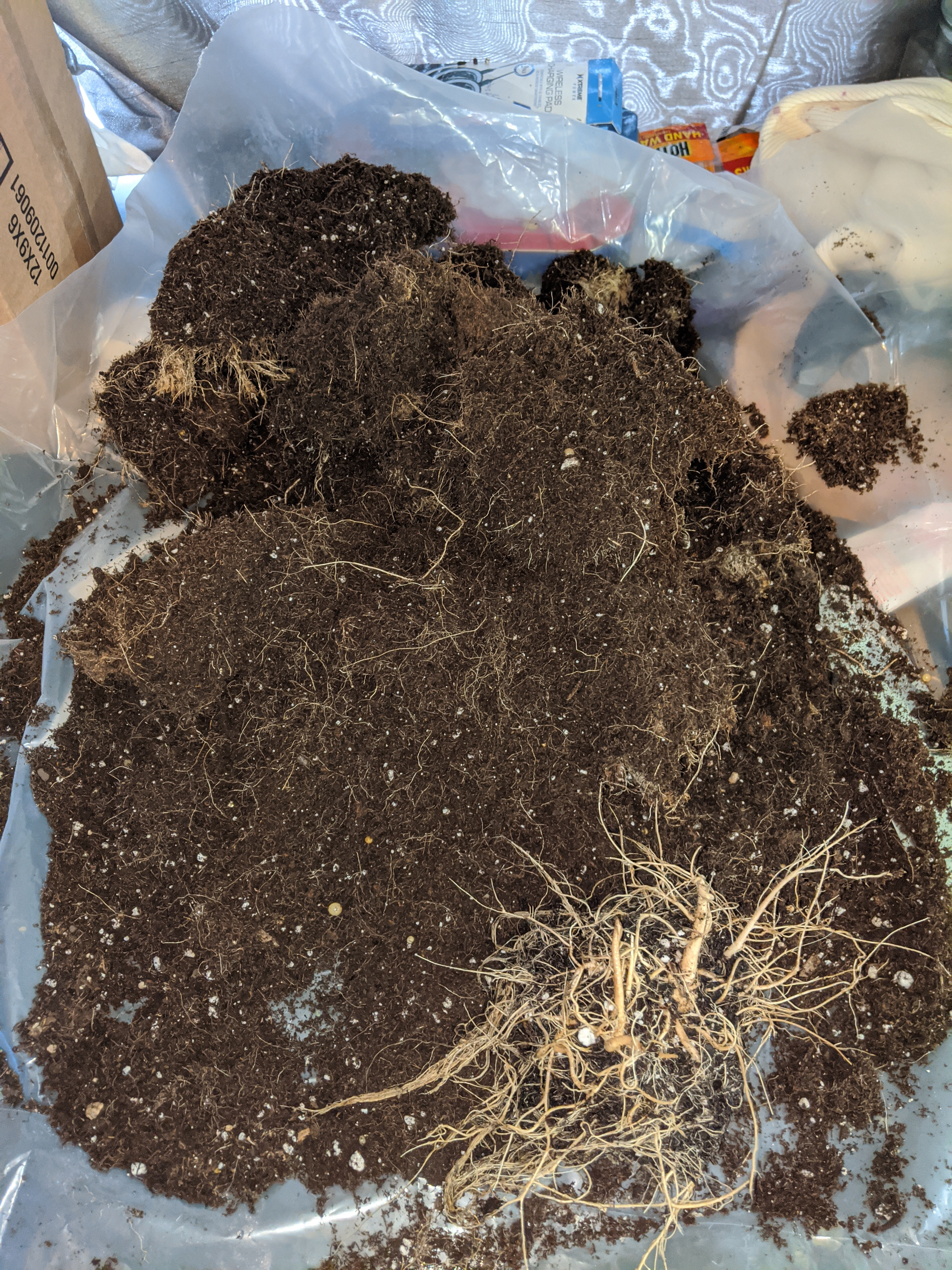 My first grow went far batter than I could have imagined. I never saw any issues with my grow. I was curious about my root structure, dumped the pot - wow. Very root bound. Decide to dissect it to see what the core looked like. Comments on root structure or anything in general are very welcome because other than a massive ball I don't know exactly what I'm looking at . It was very dense and spongy while cutting in half , think of a cake made from moss. I gently brushed away dirt trying not to destroy roots as I did. I made a diy air pot, that is why it looks polka-doted - why are they white , any one know?