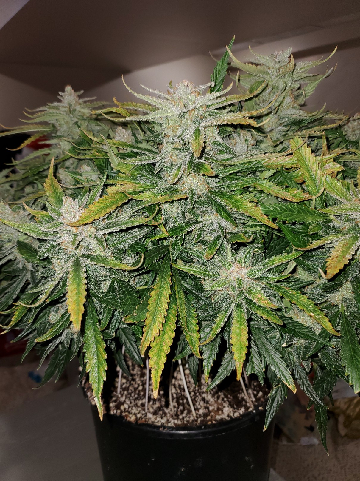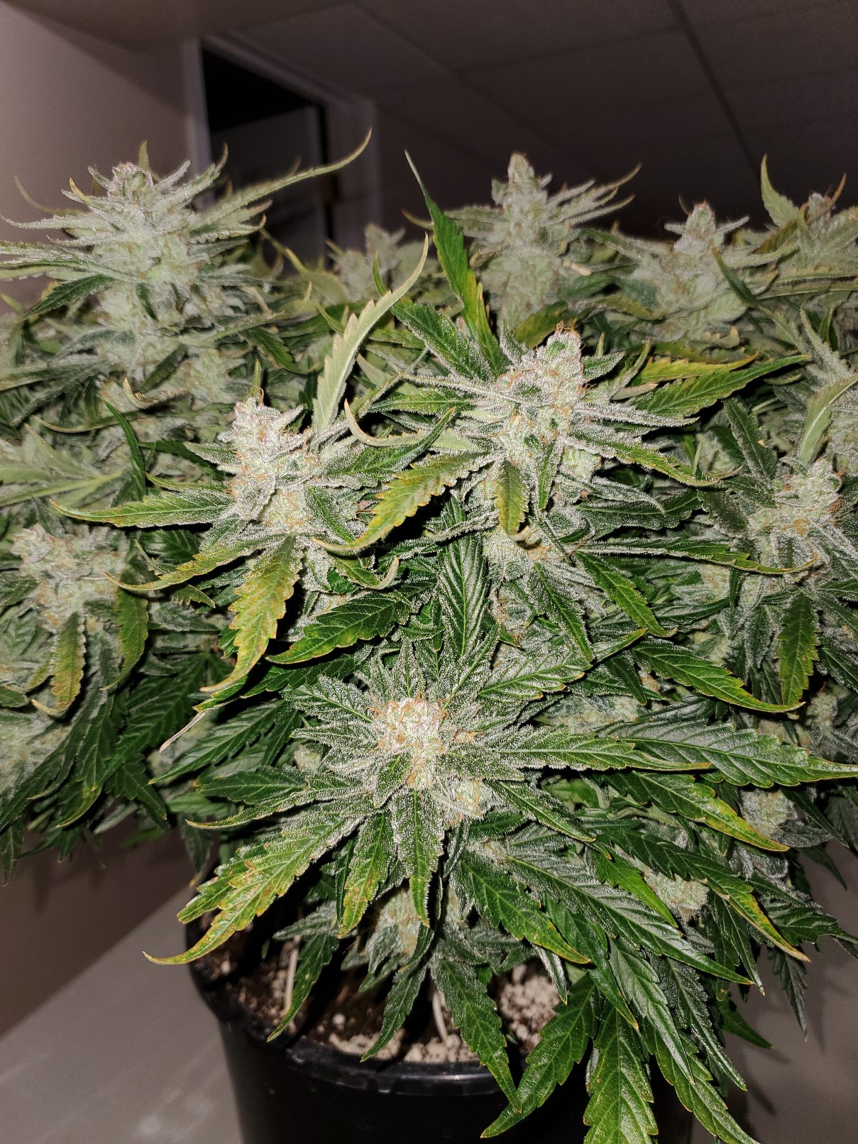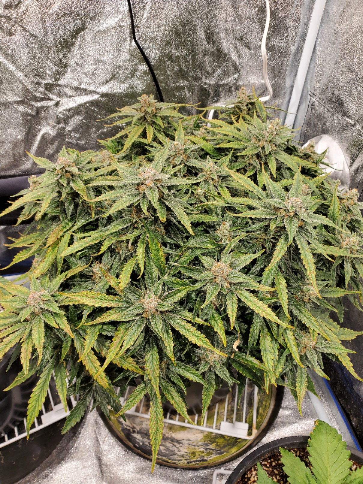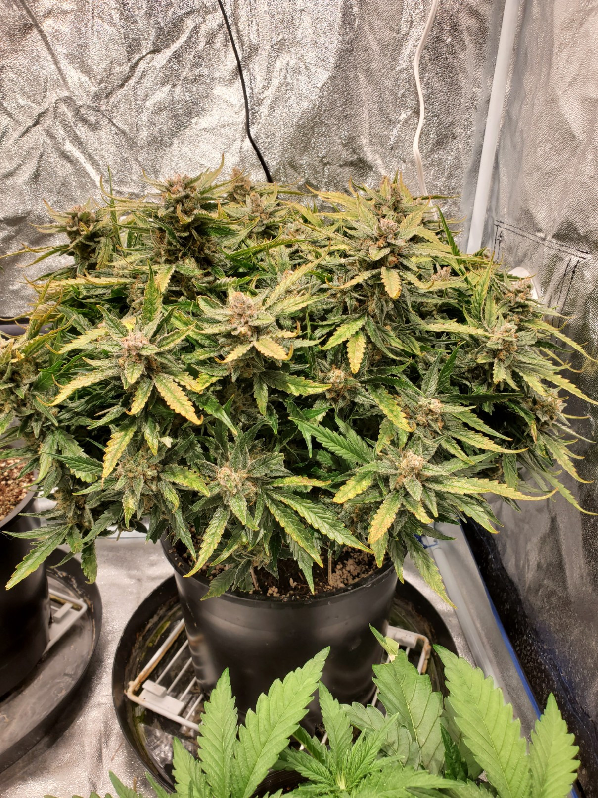 That's a fine looking plant 👌, love the colors in the buds4x4x6.5 tent, (2) 18"x46" LED Strip Fixtures 440w?? 🙃 (2) Solacure UVB T8s, Infinity T6 fan, (4) 5gal DWC res.GH Trio, Calimagic, LKB, Armor Si, Sweet, Hydroguard, GH pH