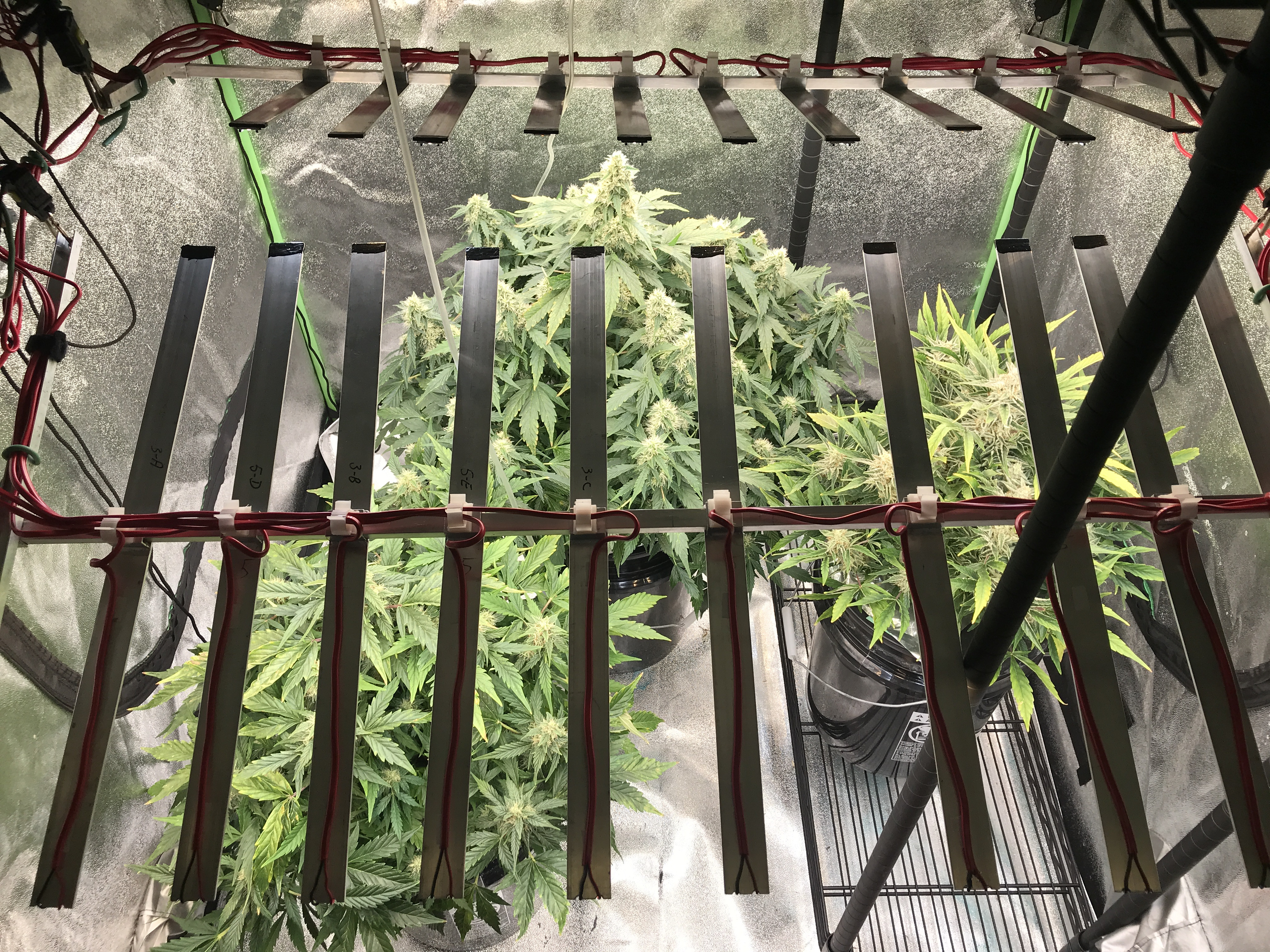 JohnEmad COBS are certainly a great way to grow. LED emitters on strips, or packed into COBs, will do their job just fine. I decided to use strips because I can keep them close to the canopy, and they run cooler (temp and amps). You will see in my pics that the strips are about 8-10” away from the plants and I’m running them at 600mA. I could put those strips up at the top of the tent, and crank up to 1200mA and get the same results. Only difference would be heat waste, and shortened lifespan of the emitters.