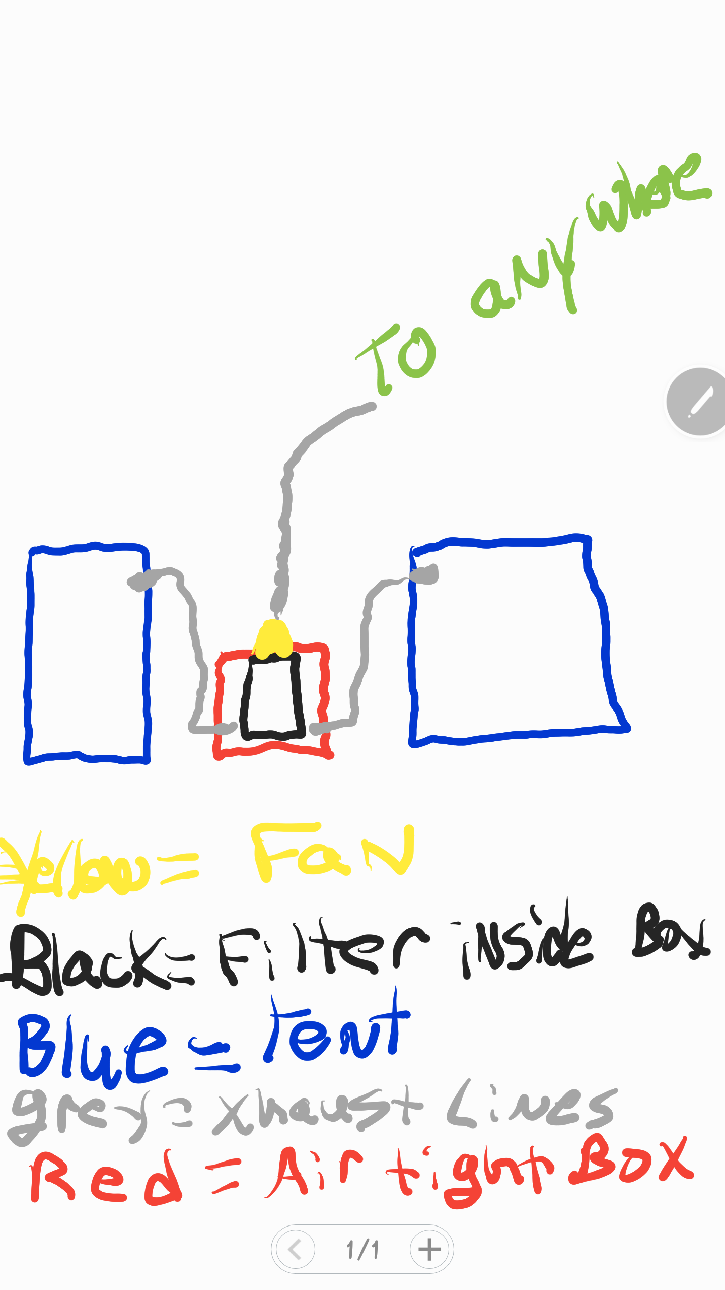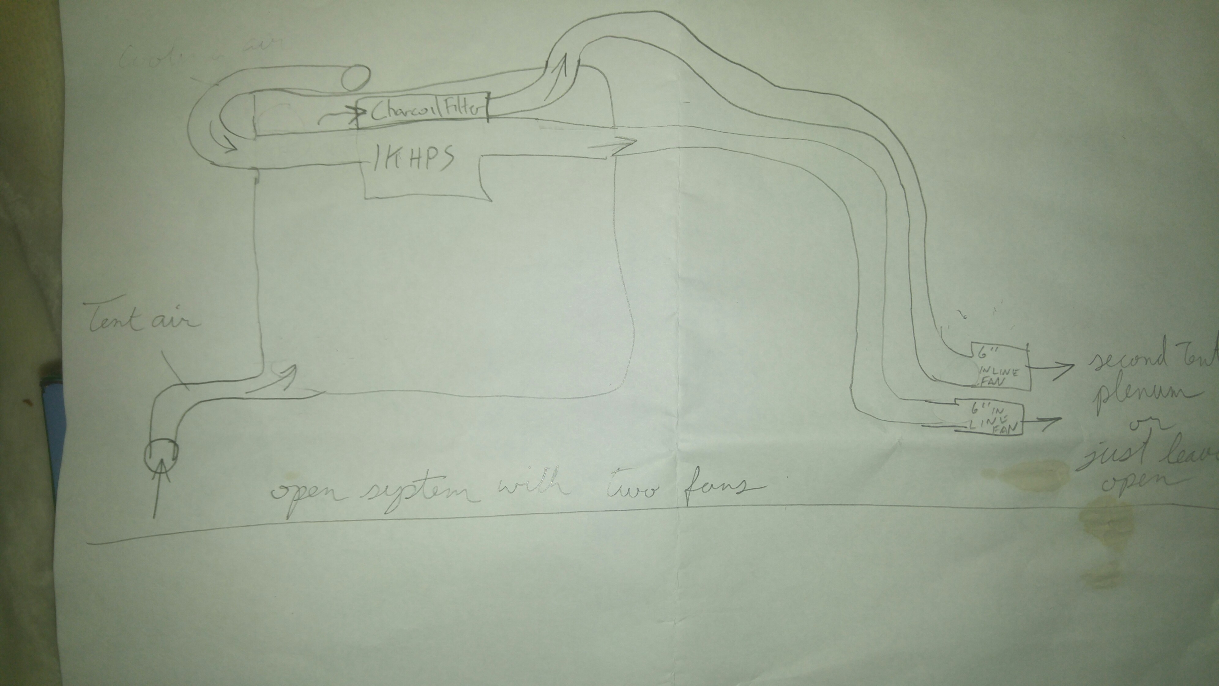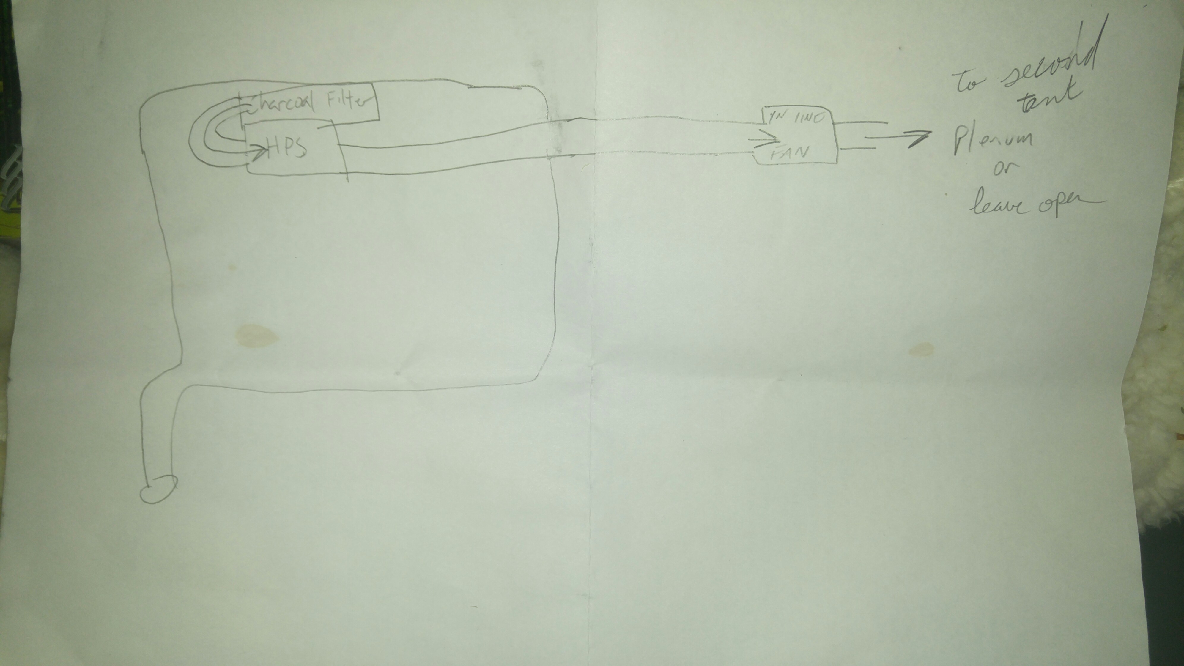 Initially, this is what I was thinking about doing (I'm no artist, sorry). My setup is inside the closet of a spare bedroom. The idea was to place the carbon filter in the flowering tent to keep the temperature cooler than the veg tent. I couldnt really come up with any other way, and I've never seen done the way described above. Not a lot of room in my closet after having to put 2 tents in there, but I suppose putting a box like that could work in there.