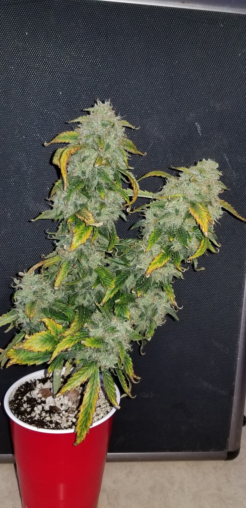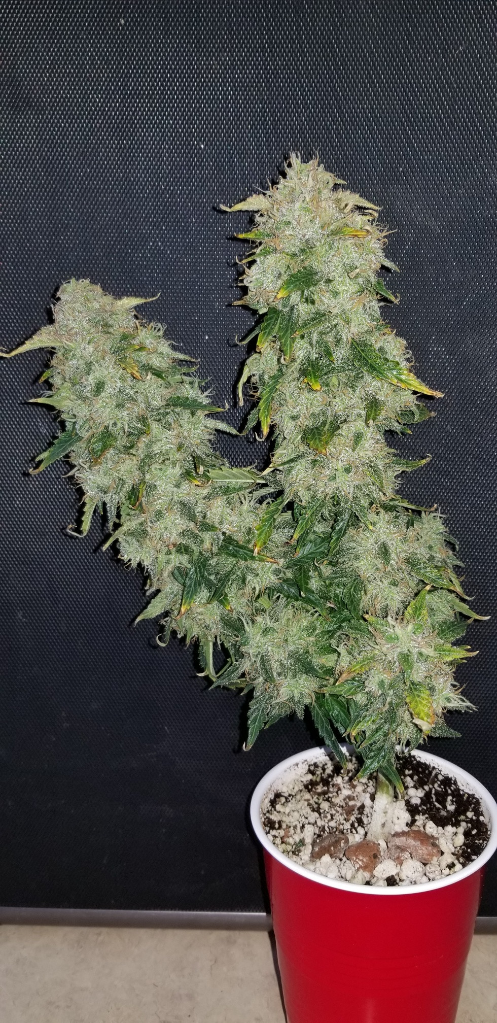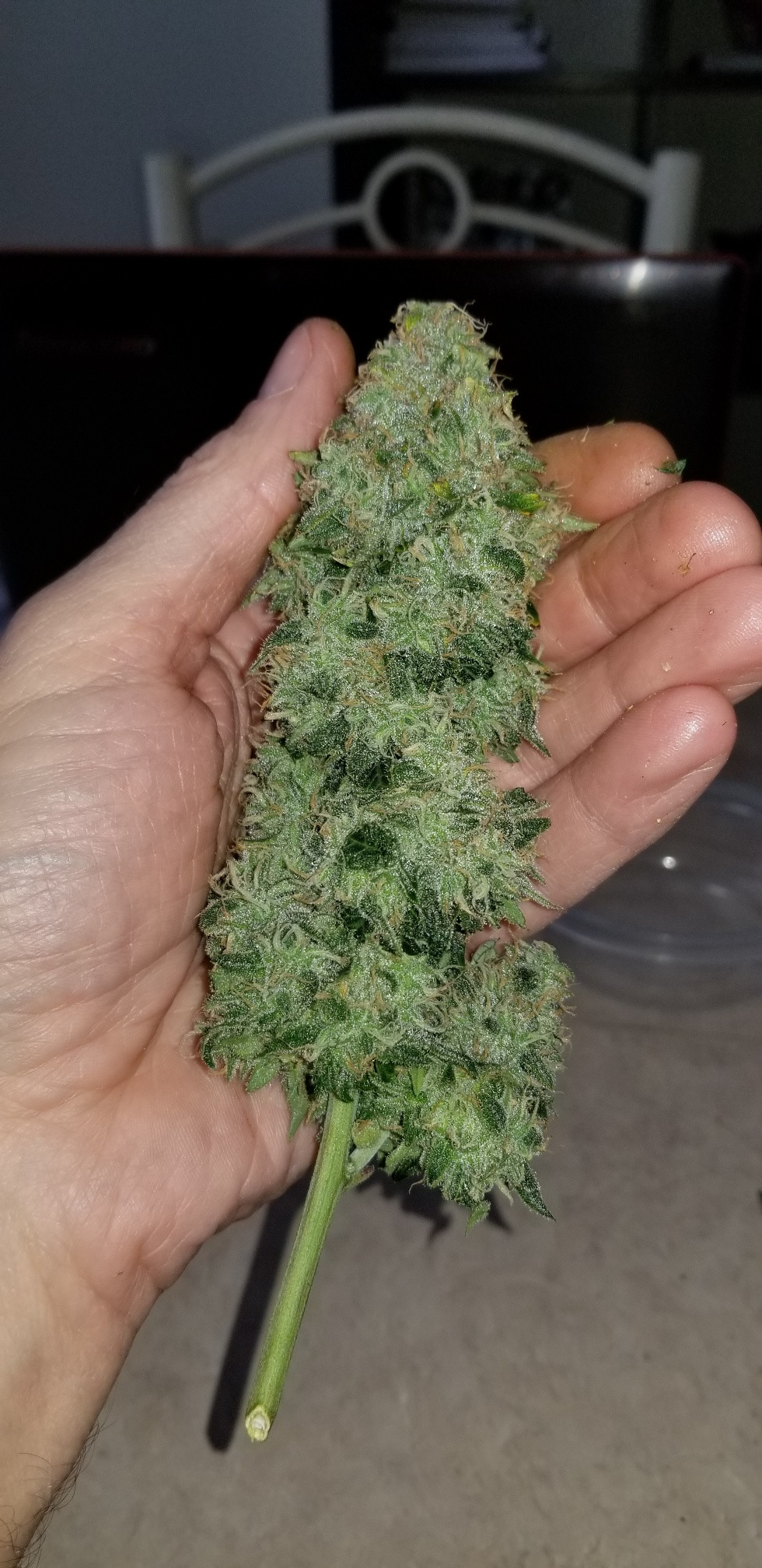 Day 73 / 2nd solo wannabe harvested. Beary White x 3bog had 2 main colas naturally so just let her grow. Same as my last one this plant was a stunted dwarf at near 30 days when I transplanted and added root hormone and kelp extract to. She then took off and ended up far better then expected. Total wet weight of 81 grams. Fat little colas and smelling strong. Not as frosty as her half sister 3BOG but still very sticky. mmmm! Can't wait to sample them both.