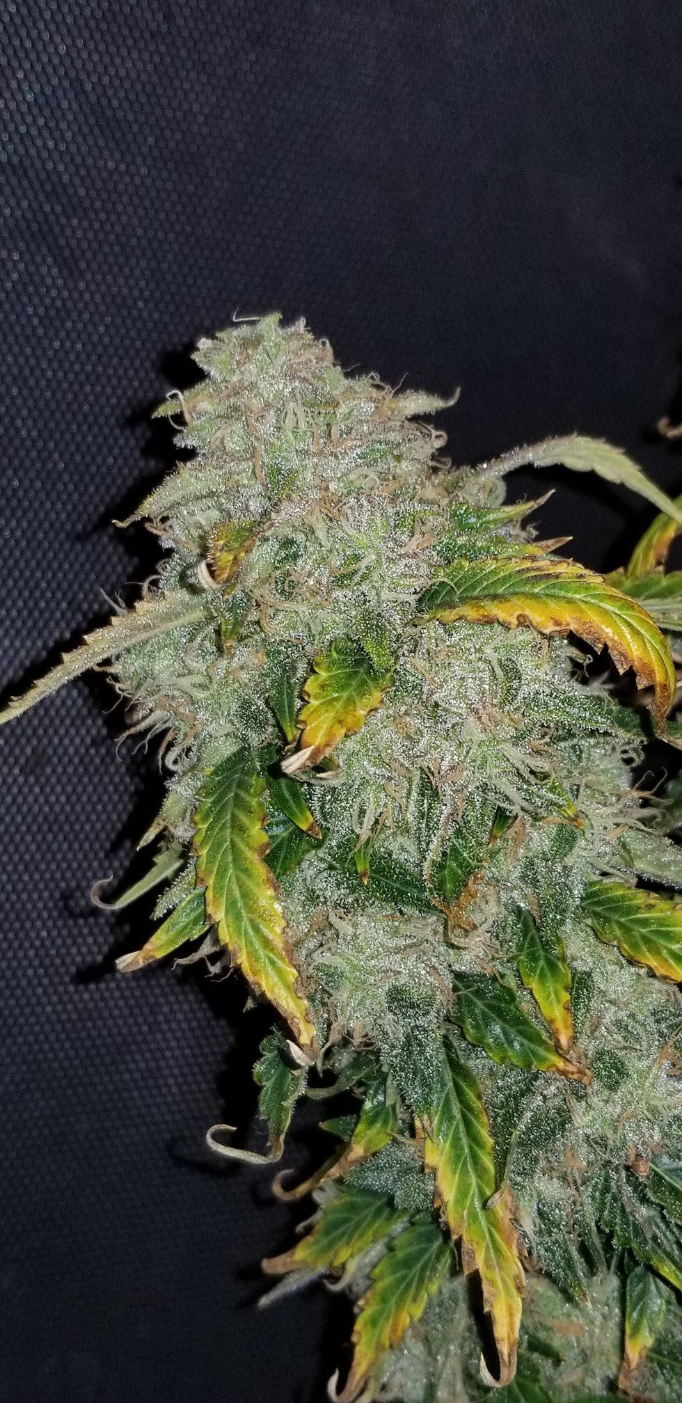 The Main Contestant - Walter White is building lots of frosty flower and will be well over an oz I think. She is trying hard to finish but lower fan leaves are yellowing and dropping fast. Hand feeding all I can to help her along. This plant sparkles all over in the light.