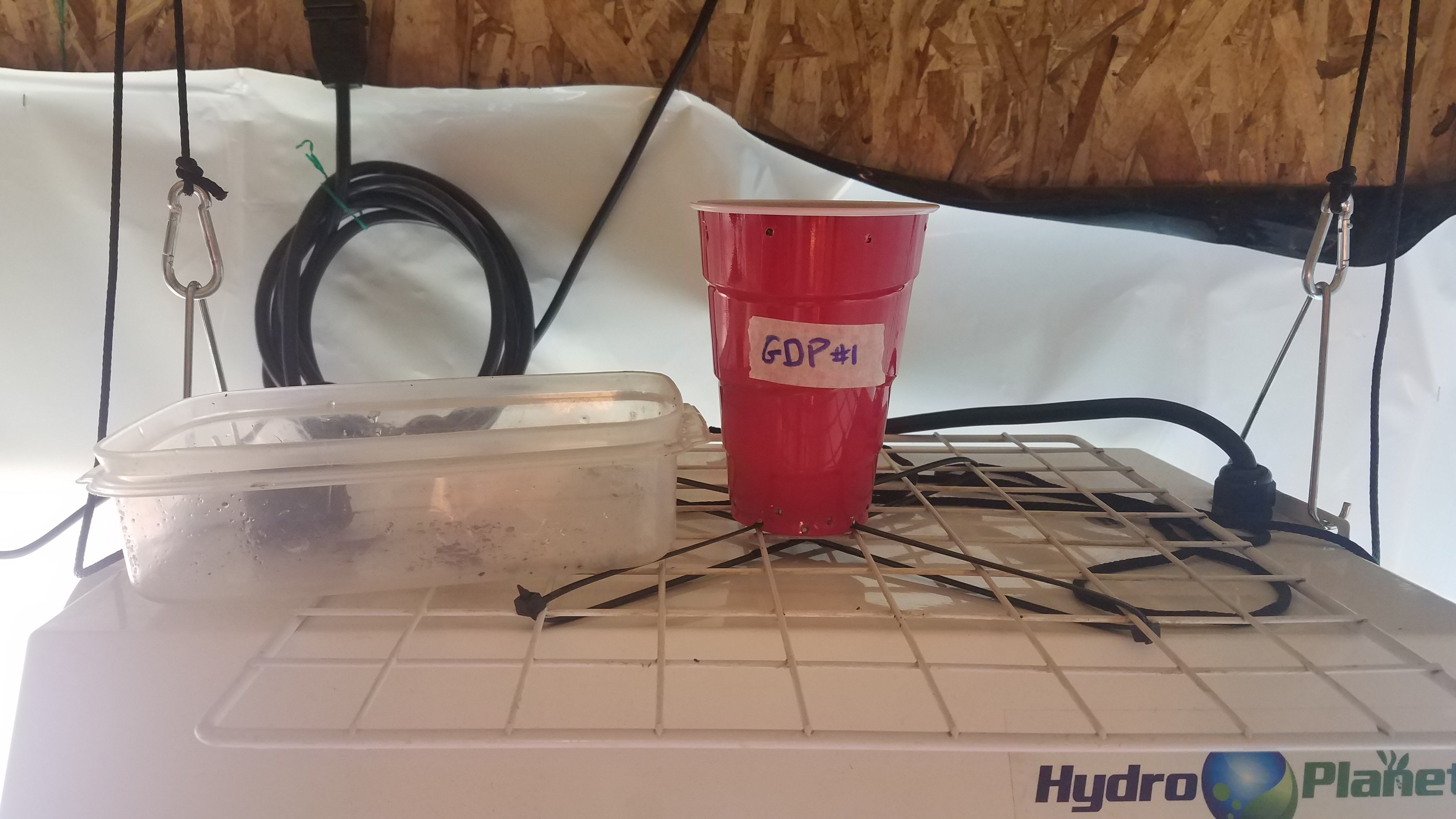 Ok, 2 of 4 seeds cracked while soaking in water(put them in solos tonight 1in coco and 1 in Berger grow mix). other two(GG#4) are now in paper towels in baggies on my router. Went back to work on my set-up. Here's pic's of my Solo Cups evolution this past month. and my final set-up!