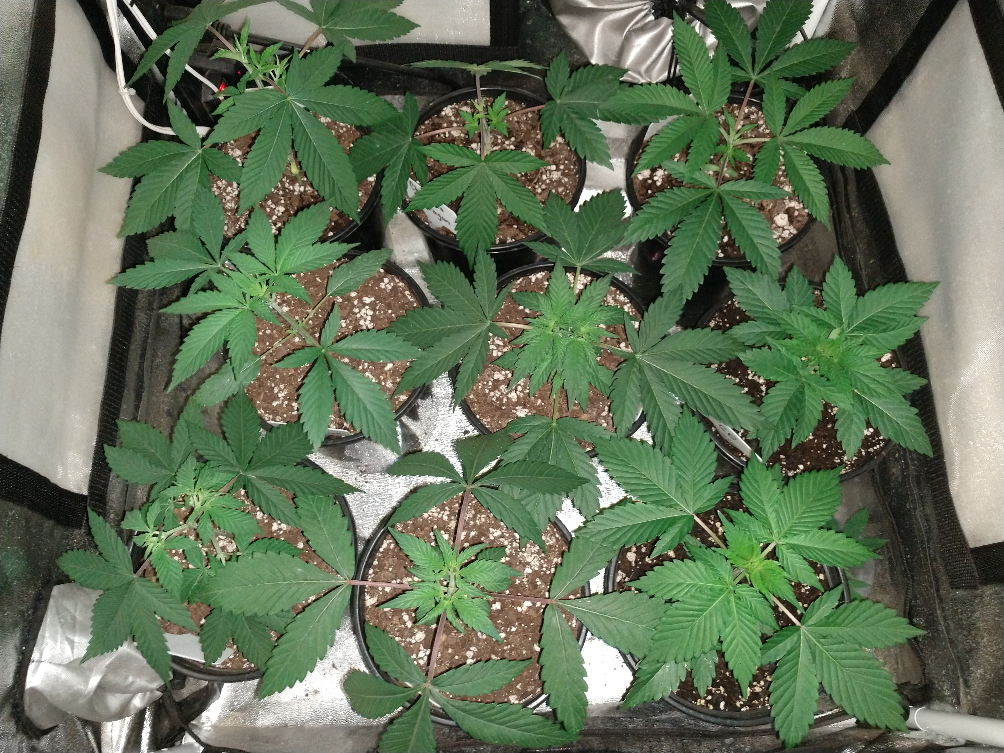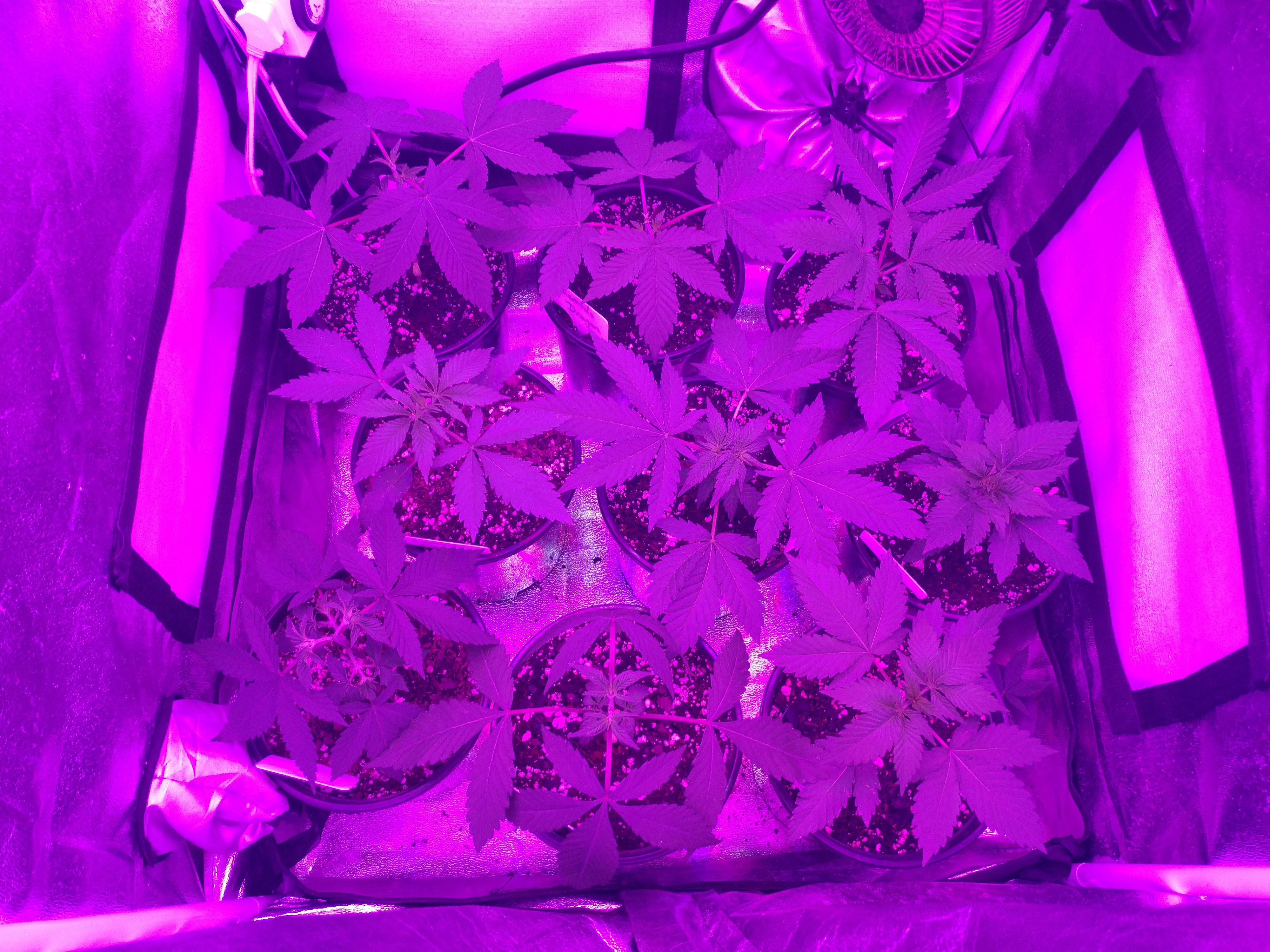 Thanks. Yeah they're about to overtake that 2x2' tent, going to have to switch tents very soon but I have to move a few ladies to the flower tent first as all my tents are full. Just cut a couple ladies down and cleared up a little space last night so today I'm going to figure out which ones I am ready to flower and move them over. All bag seed - flowering: TK91, Str8 Lemonade, and GG; veg: Str8 Lemonade; seedlings: Blueberry Headband, Under Dawg, Lemon Poison, Mocha OG (smells and tastes like coffee), GG, UK Cheese, Lemon Meringue, Chemodo Dragon, Guptilla, and an unknown seed. Lots of variety, for sure. Just took more pictures since the lights are off and I opened the tent for strain names anyway, I'll add them to this post.