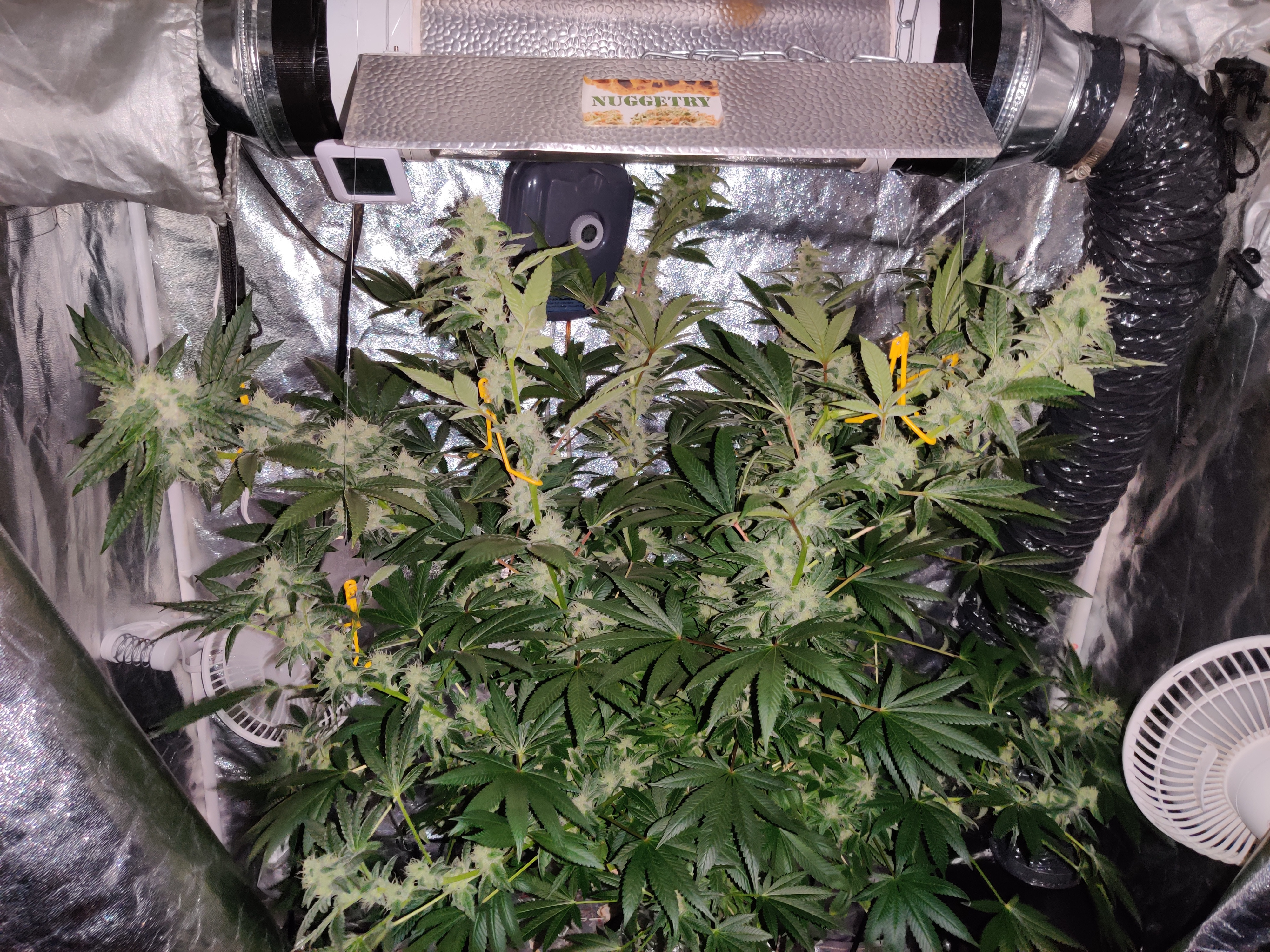Should I do a defoliation? It's week 6 flower. I know it's a controversial subject but I would like some and opinions please. You see how much leaf cover is in there I feel like it's covering lower buds too much.