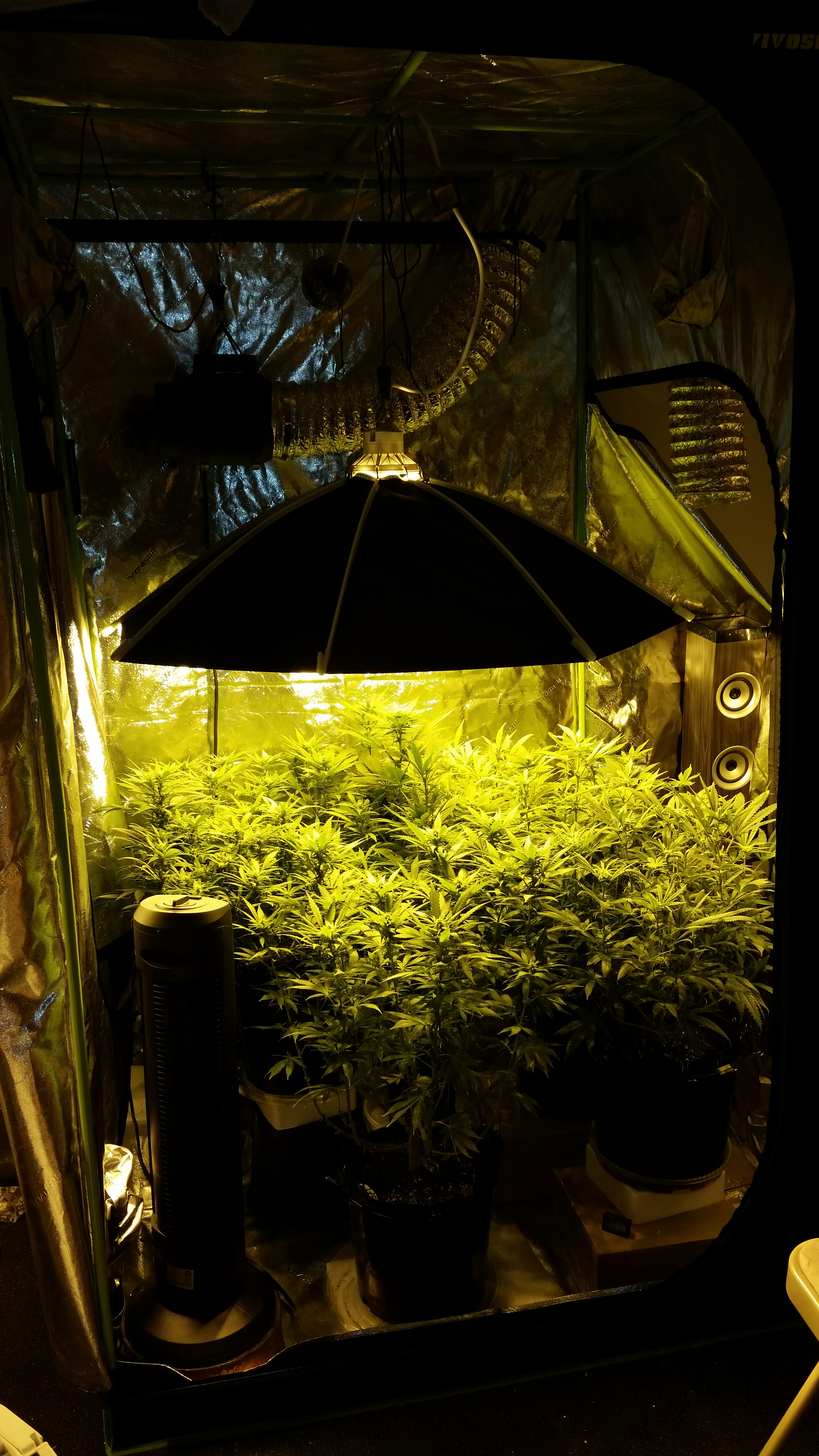 How about a frontal photo of your tent opened up so we can see the whole interior from floor to ceiling? How tall are your pots and how tall are the tallest tops from soil? I think you have a lot more room than you think you do but it's hard to judge by the angle of the pics. Our tents are the same height I believe. If you want to for comparison, I wall take pics and measurements of my pots/plants/lights/etc. and post them here in 1 hour when the light comes on to give you a better idea of how much vertical space you really have to work with. My plants are on risers, my light/reflector is 16" tall and about 18" above the plants, I'm 2 weeks into flowering and I still have a lot of height left.