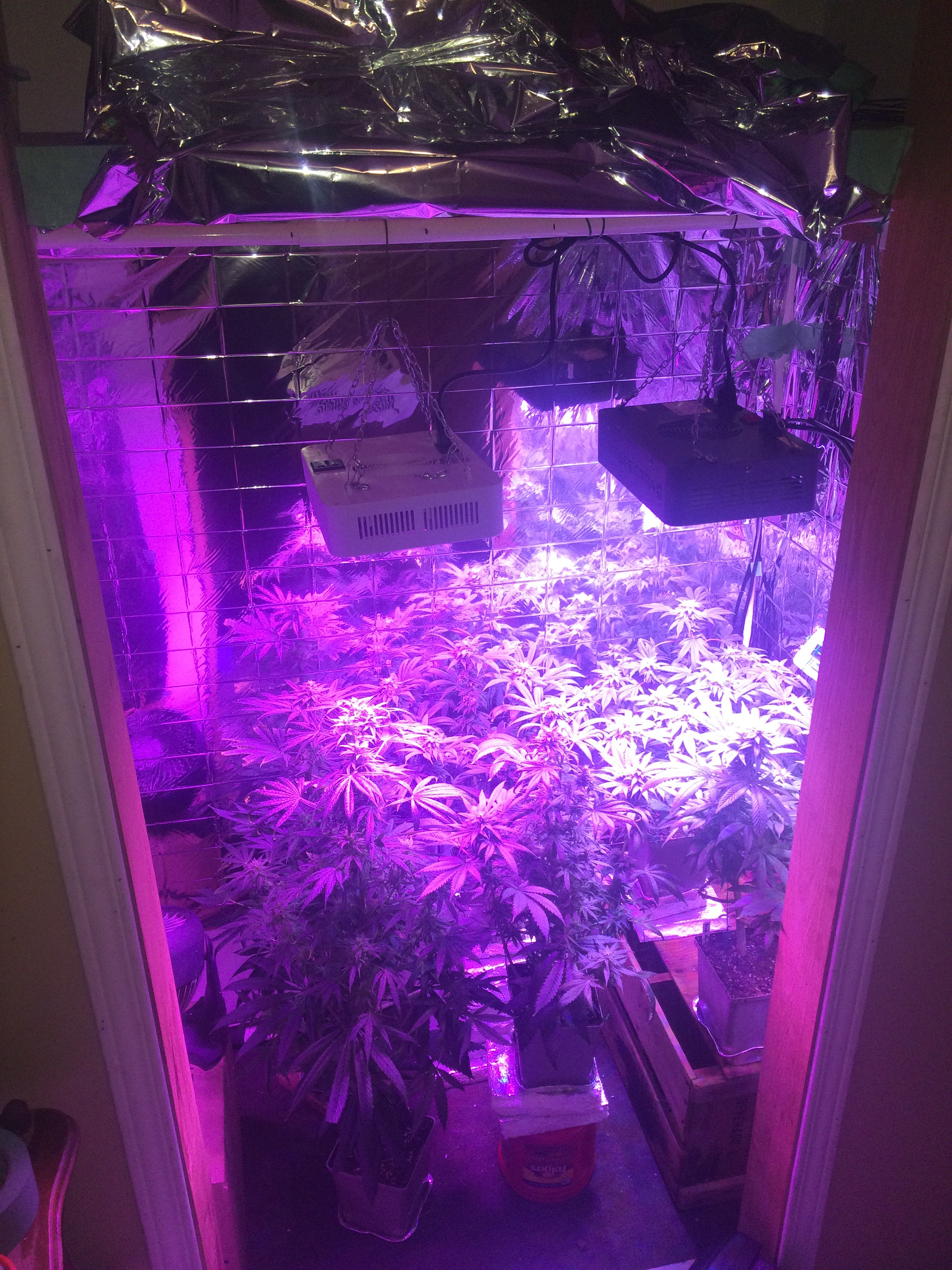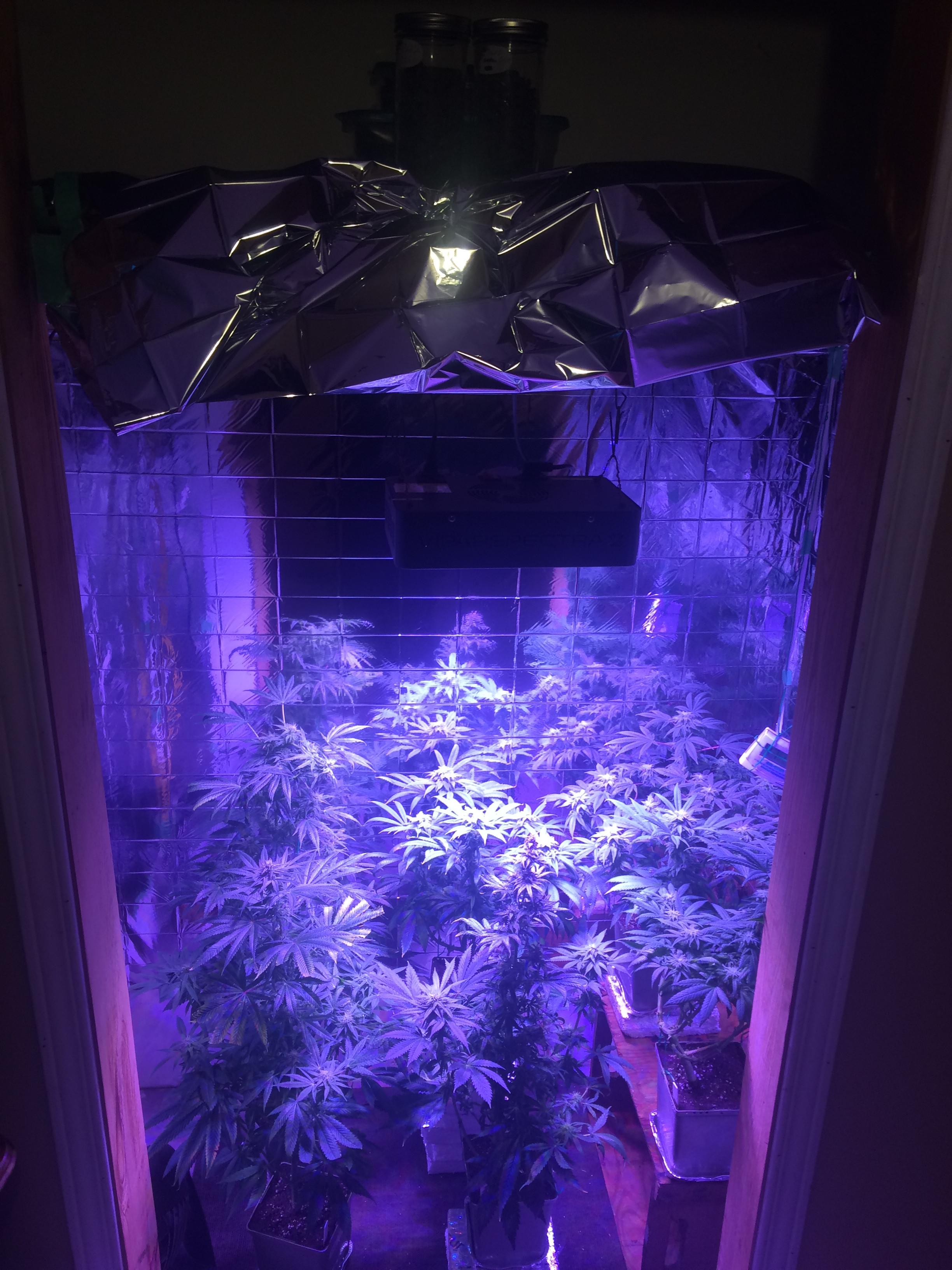 I'm running 3 black mambas, and 3 sour kush autos in my 2x4 closet. It's just lined with reflective film and powered by a Vipar Spectra 300w (130~) It's not much but I'm hoping for some sort of yield out of it. I have a second light arriving in a few days which I think will help a lot.