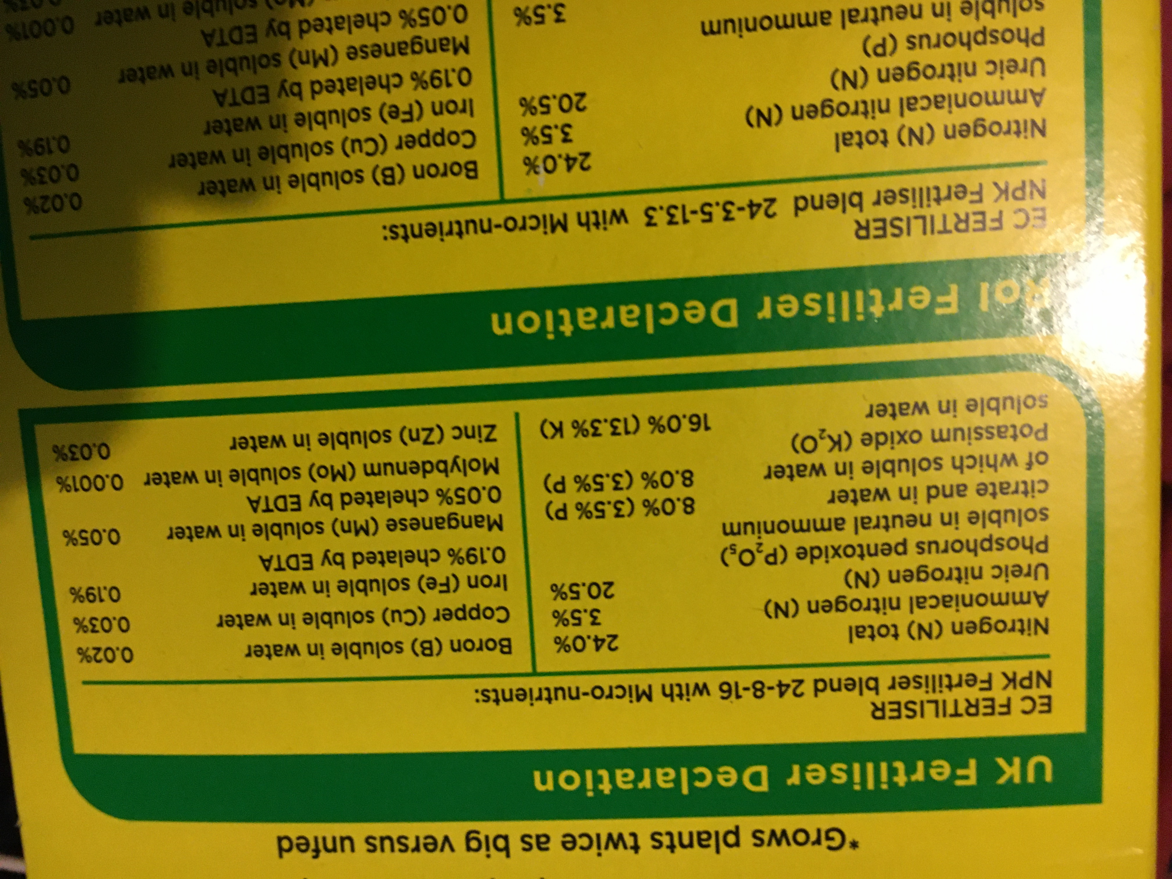 Canna Coco Professional Pro Soil 50L https://www.amazon.co.uk/dp/B008BHXY..._rKRiEb5EFPS45 this is the stuff I’m using. So is that down to the miracle grow? I’ve posted a photo of the miracle grow contents. I figured nutrient burn a week ago so flushed them and tried feeding a more diluted solution but still had leaves like this grow. Those photos were just in a lit room not under there grow lights or do you want me to take em outside for a photo. Thanks again for the help
