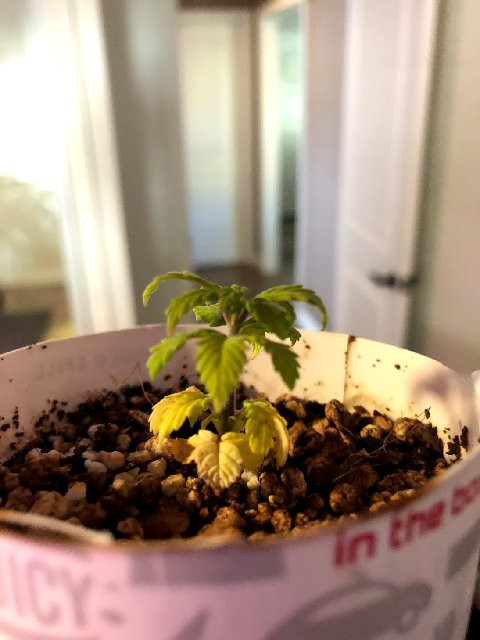 It's been 3 weeks since the seed popped and I planted it in coco coir + perlite. (it looks like a lot of perlite, but I think I did 30% perlite, 70% coco coir) I've been giving it 1/4 teaspoon of Dyna-Gro Foilage Grow per gallon of water every other time I water it.