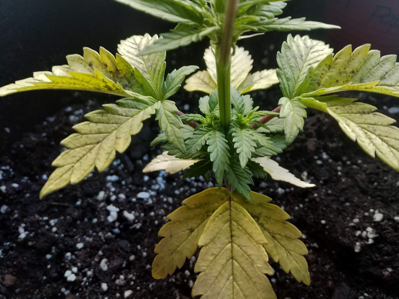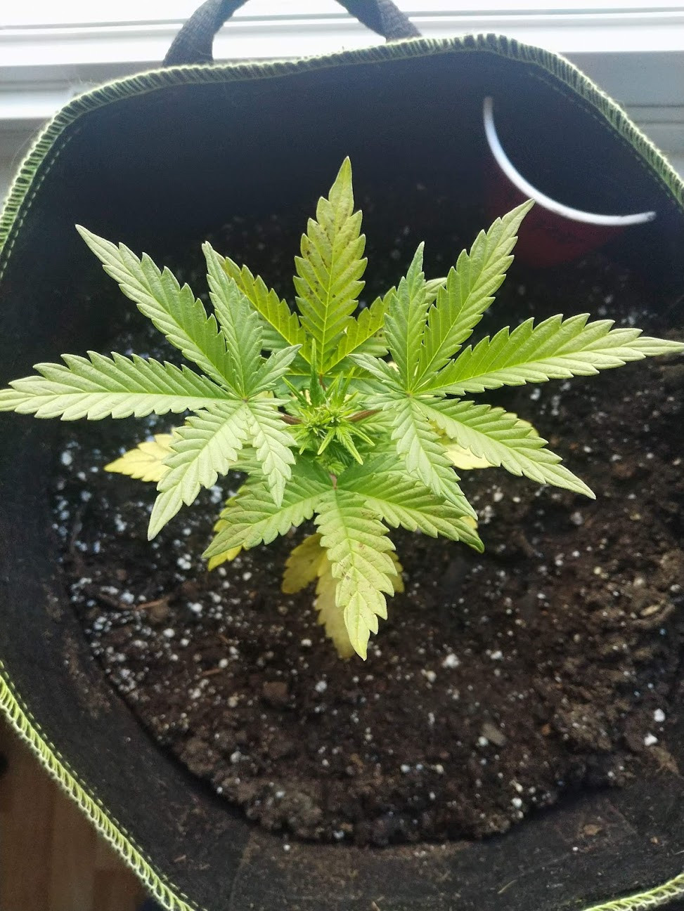 Joined up just to start asking for some guidance. I've grown in closets before but nothing fancy, one plant at a time mostly, nothing great. Trying to do this one right. I've got 3 plants - 2 of which are a week behind this culprit - the only one of a 6 pack of seeds I got from BC Bud depot that actually sprouted. Very gentle feeding so far with AN's 3 - part grow micro bloom, in soil (potting soil + perlite) in cloth pots. Plant started showing some yellowing leaves with slightly reddish/purple stems low down - I did give it some nutrients the other day but I'm scared to overwater.