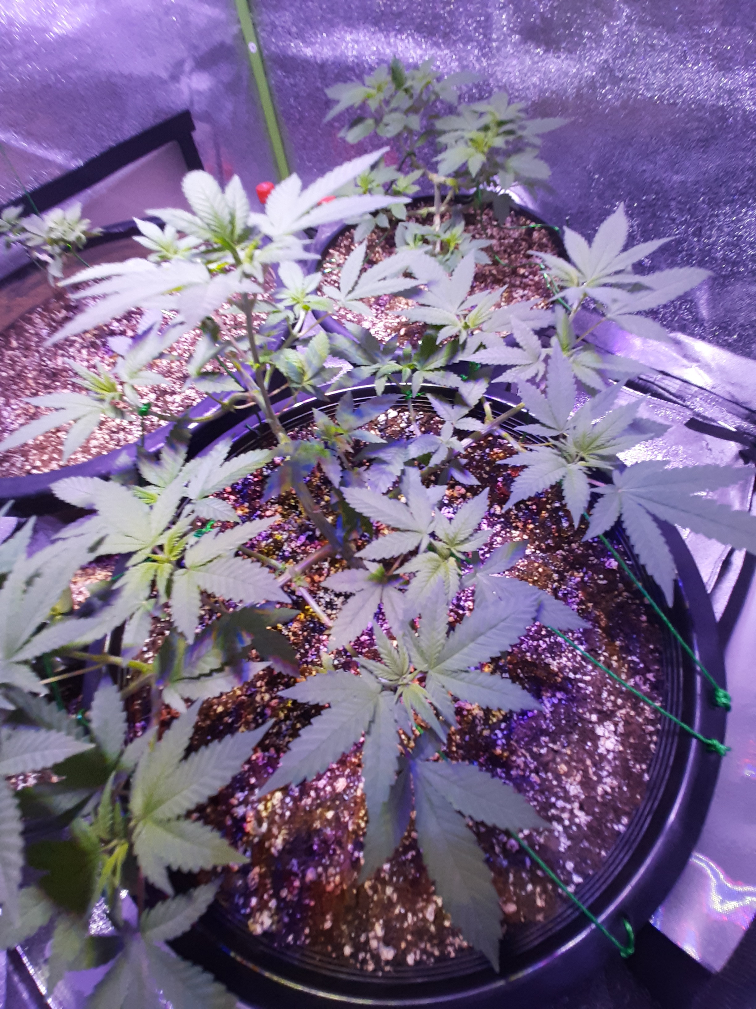 So I followed Nebula's and Nugg Bucket's tutorials, which went very well on my wife's Bruce Banner clone. When I topped the white widows, I left the 3rd node with the intent of cutting them off in a few days when they had bounced back from the first topping. The second white widow, I broke a branch when I went to bend it. I took a piece of wire as a splint and wrapped in duct tape, which worked like a charm and has healed beautifully (This was also a first for me). I pulled the humidifier out at this point as I was able to maintain at 45% to 60%, This is when I broke a branch clean off on my 1st WW (change of plans on that one lol). Remember I said I left node 3 untill it recovered. Well I'm glad I did, I bent the two branches at node 3 at 90o along with the one remaining branch on node 4.