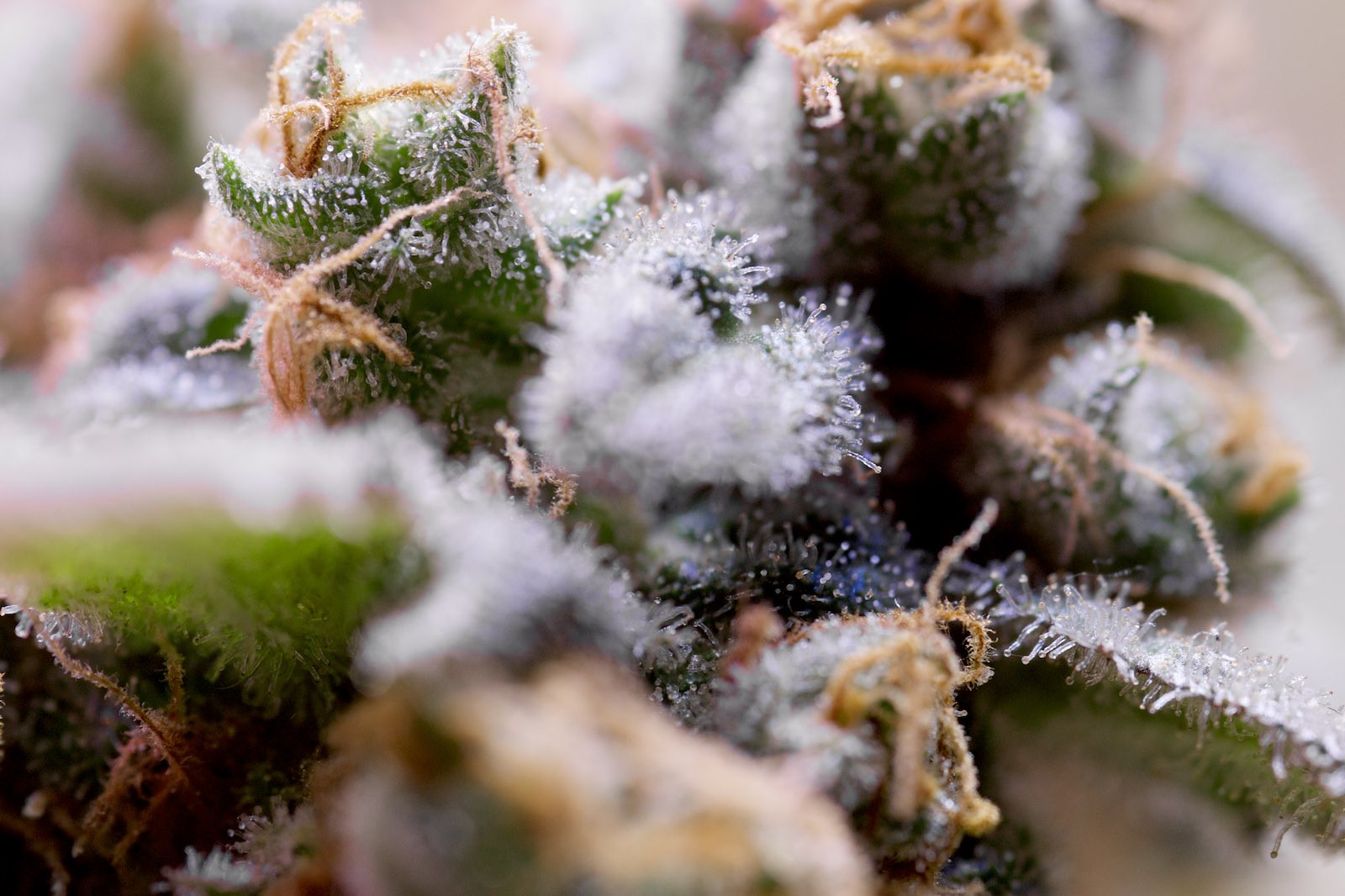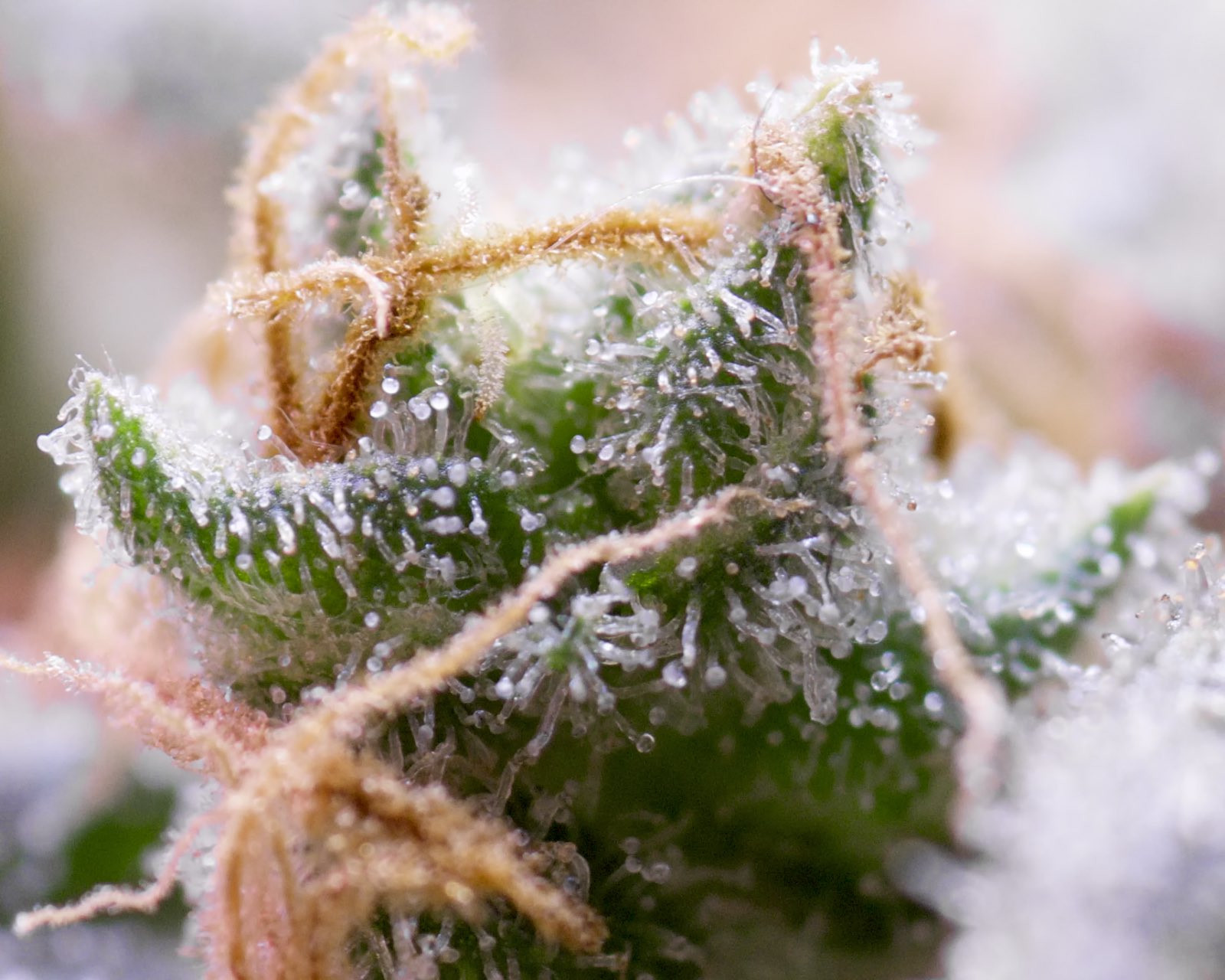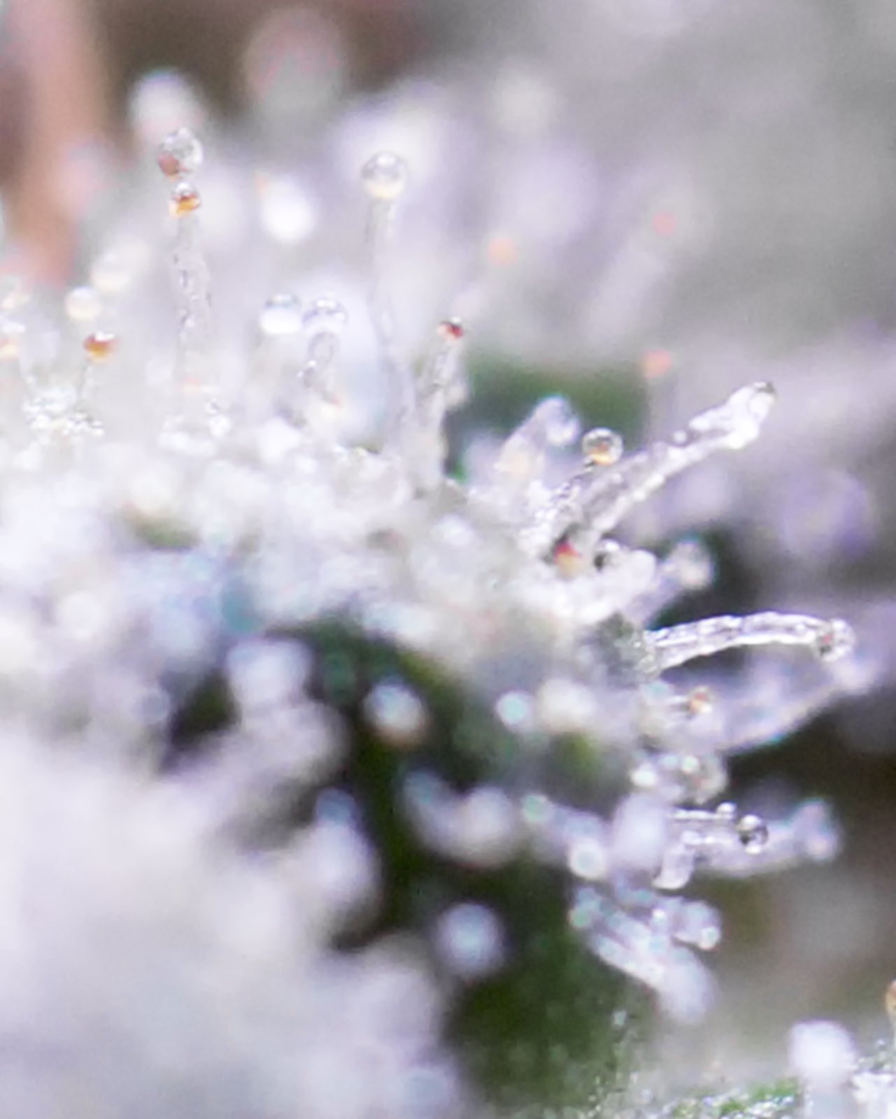 These close ups show trichomes that are still fairly clear, but amber tops are common. When I look really close I see these amber and red specks that could be refractions inside the trichome globe.