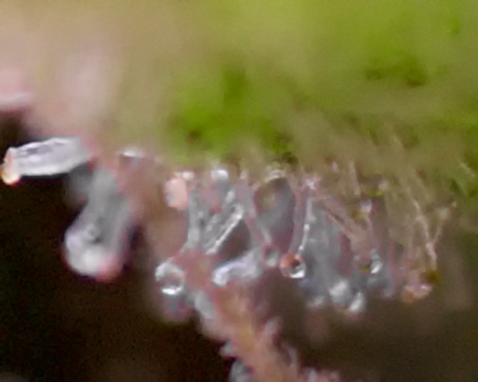 Halfway through flowering the trichomes were quite clear, but many of the tops seemed amber. I thought, first they turn cloudy, then amber. Along the way I took a close look at the trichomes and thought I saw that maybe they weren't really amber, but mini images, like what you see with an extreme close up of a drop of water. Like a lens.