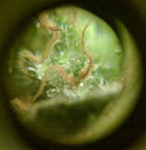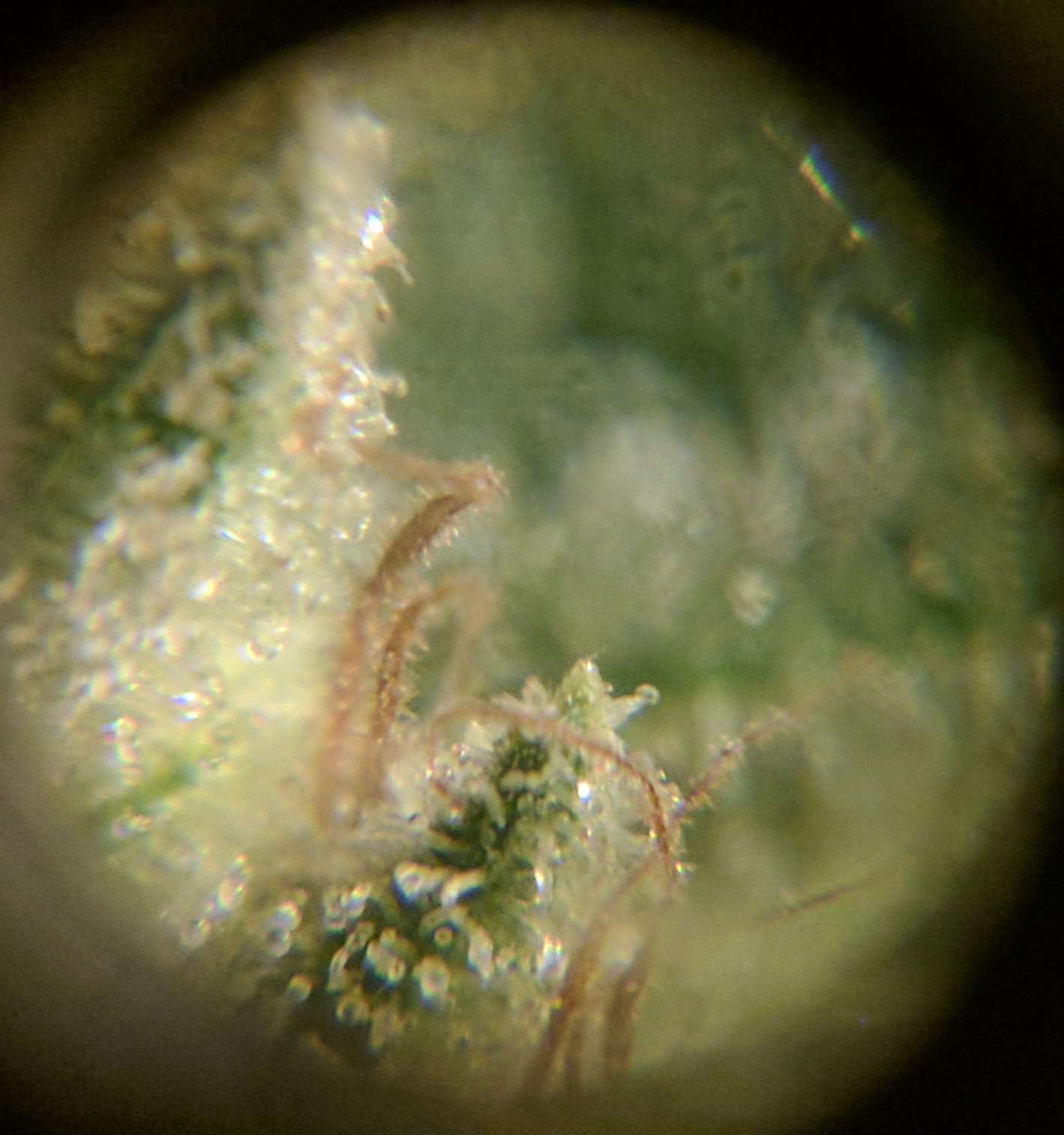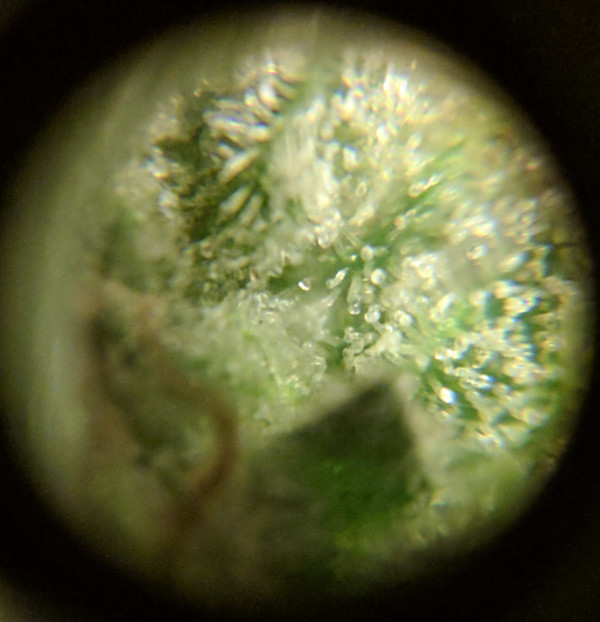 And now, the photo barrage. First up, a trichrome close up. I think we've shifted closer to 70% cloudy or better. A little hard to tell in this photo, but looking mostly cloudy on the buds overall, with a rare hint of amber in there.