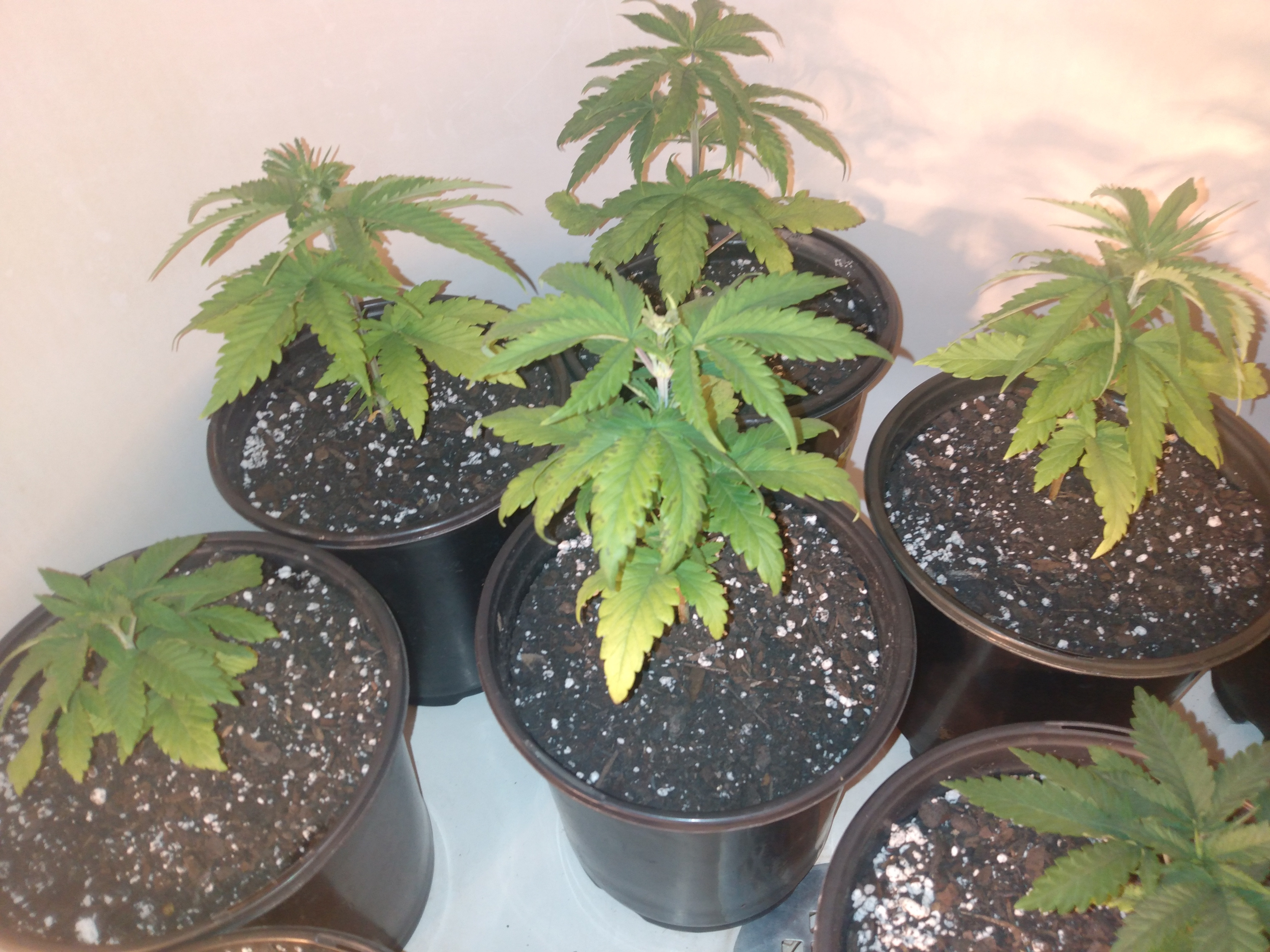 hey GWE I made this post a couple of days ago but for some reason it was telling me to do it in a private message to pick 3 people n needless to say I haven't gotten any response back was looking for the website and realized I was just in the wrong section but what I was wondering is at first glance what is y'all's opinion on what's wrong with these plants I know their droopy I had to let the plants dry because I was having a fungus gnat problem and I change the top of the soil add a new soil to the top and waited a couple of days before I water them and since then I'm happy to say I've deleted the problem but yes I watered them since then. a little history on the plants they're bagseed as you can tell my medium is soil with perlithe my pH is running about 6 5 6 8 I'm giving them rainwater the nutrients is the general organics grow box which I've used before with success I'm running to them under CFL bulbs and LEDs the temperature ranges anywhere between 78 + 90 my humidity temps are not right but I'm kind of doing the best I can for right now I'm working on building a grow box a stealth grow box can my landlord doesn't see it should be done with the next couple days and then I'll be able to fix the temperature in humidity one thing I did notice is a couple of my plants do you have a lil brown spotty action going on oh and they are 5 weeks old... anyway thank you for your time and opinions and any thoughts on how to fix any problems that you might see would be greatly appreciated.... thx