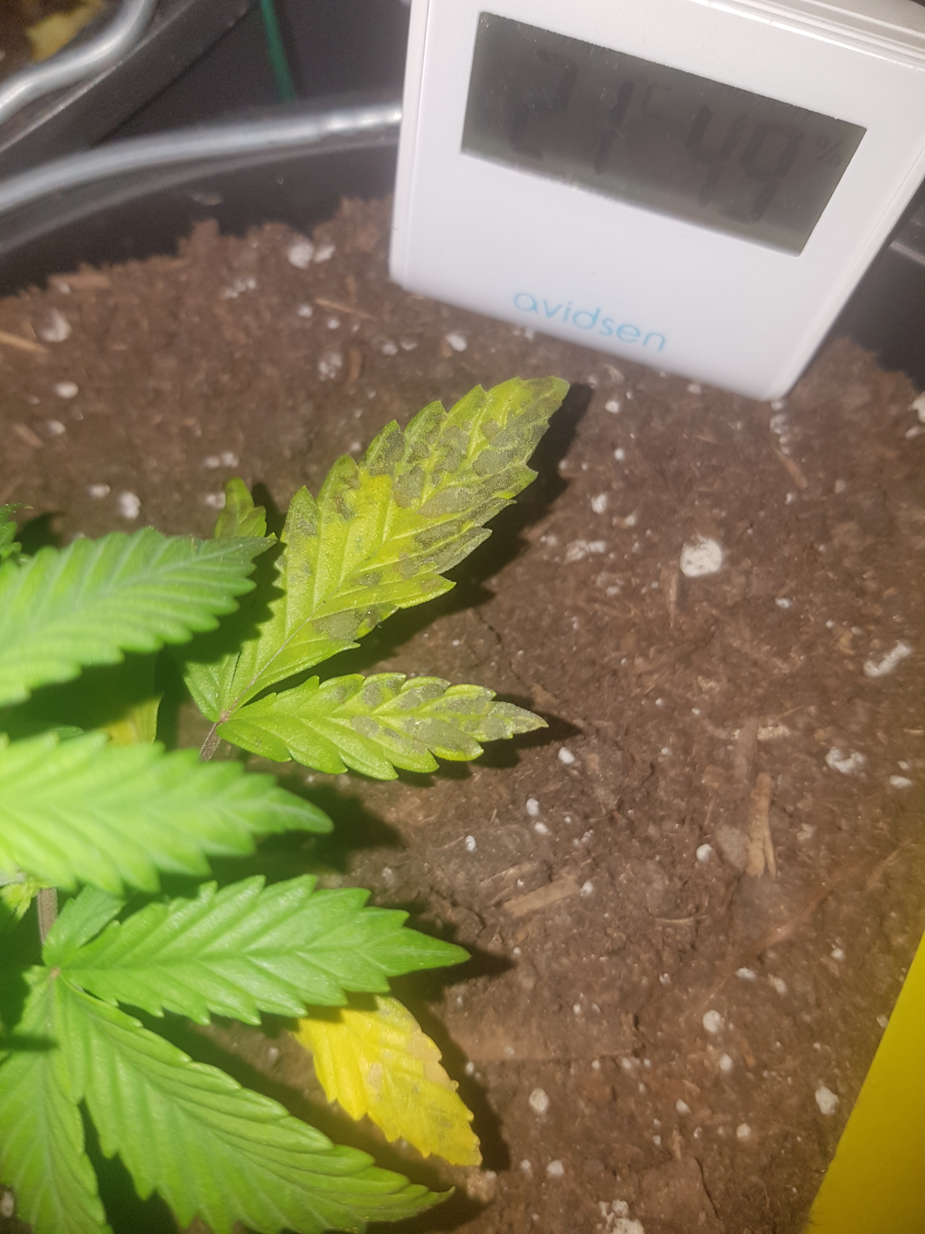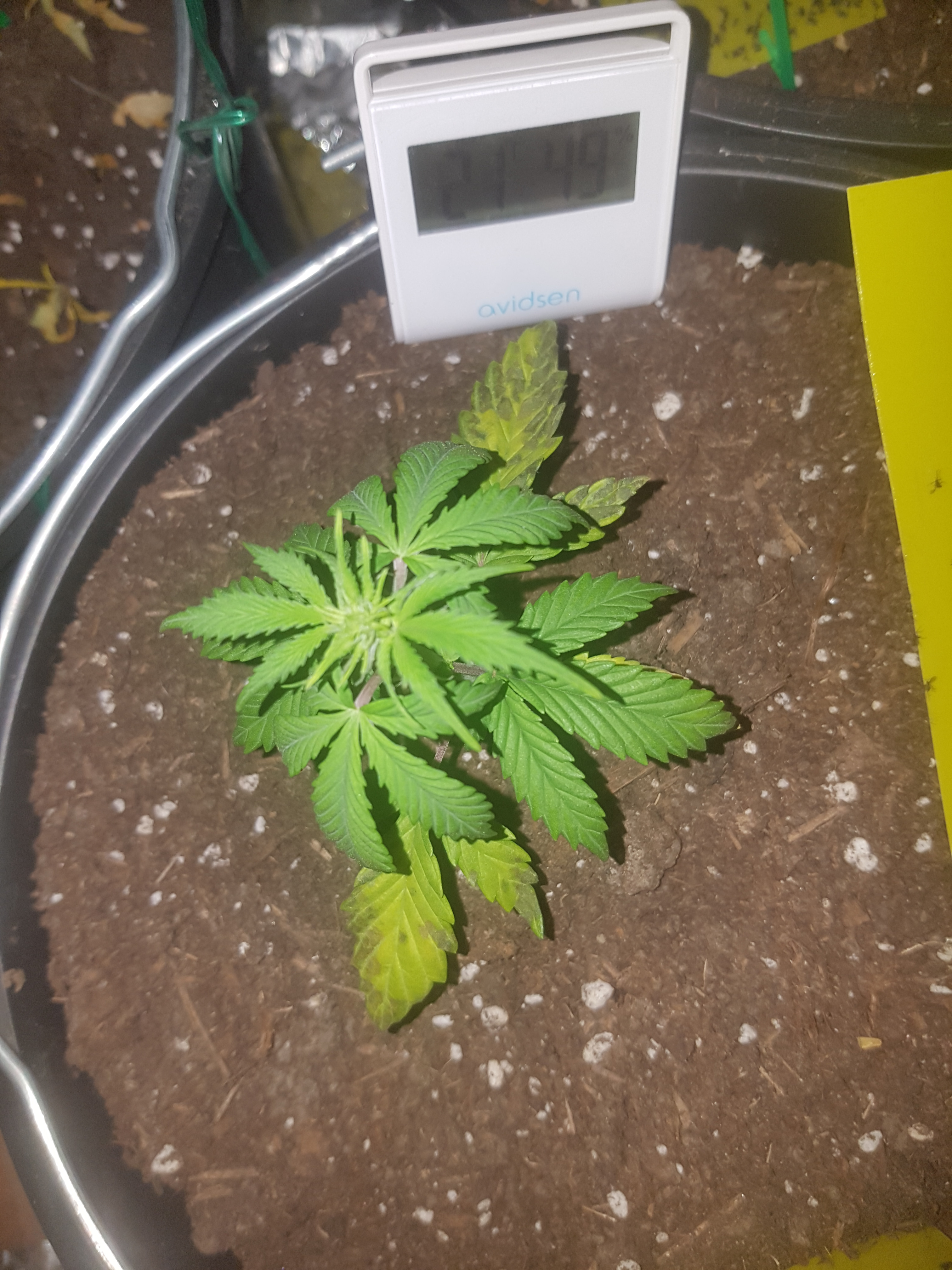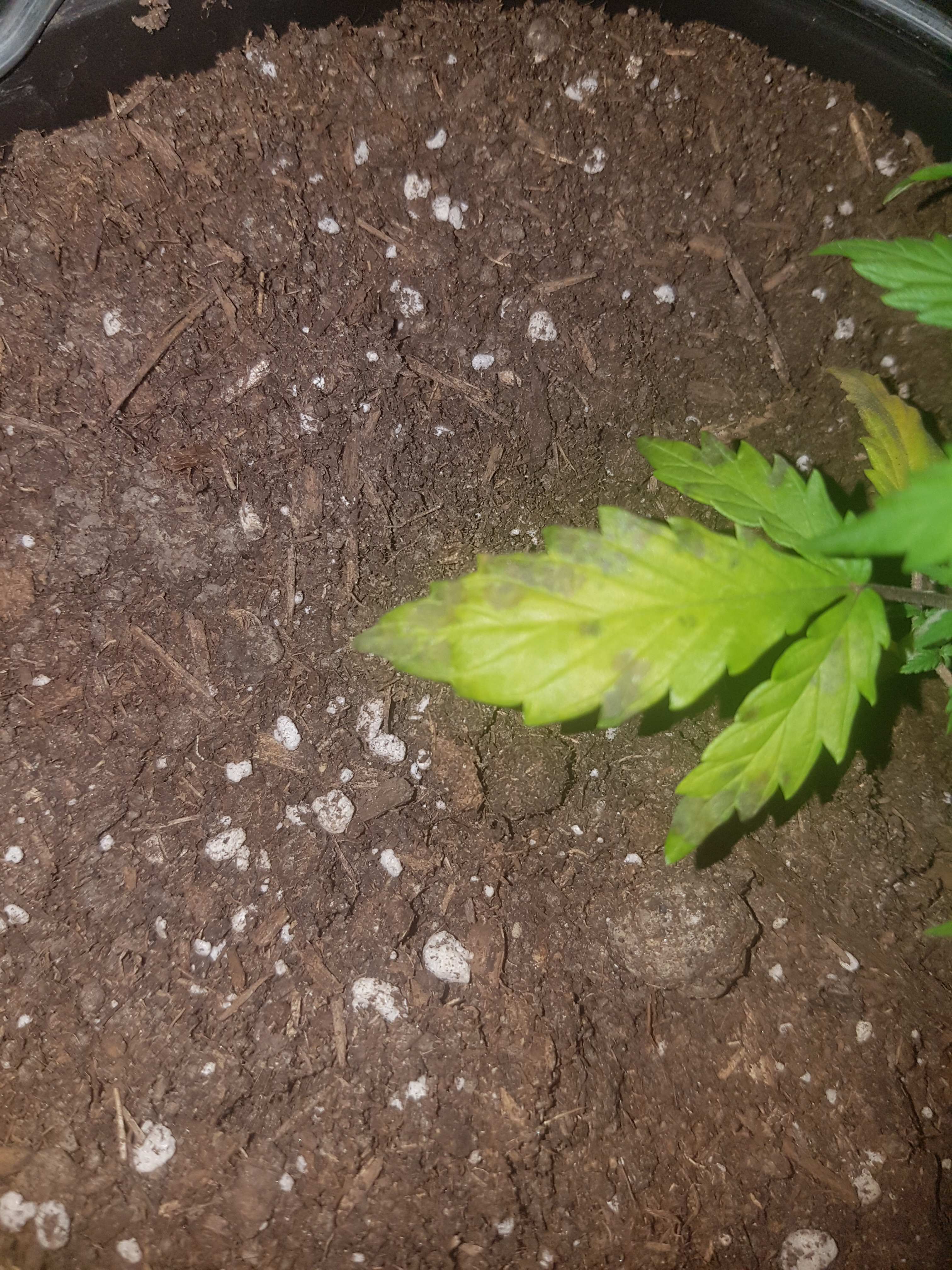 This is og kush automatic from fastbuds. 2 days ago i moved this plant to a larger plastic container. Temperature is 19 to 23 c and the humidity is 50%