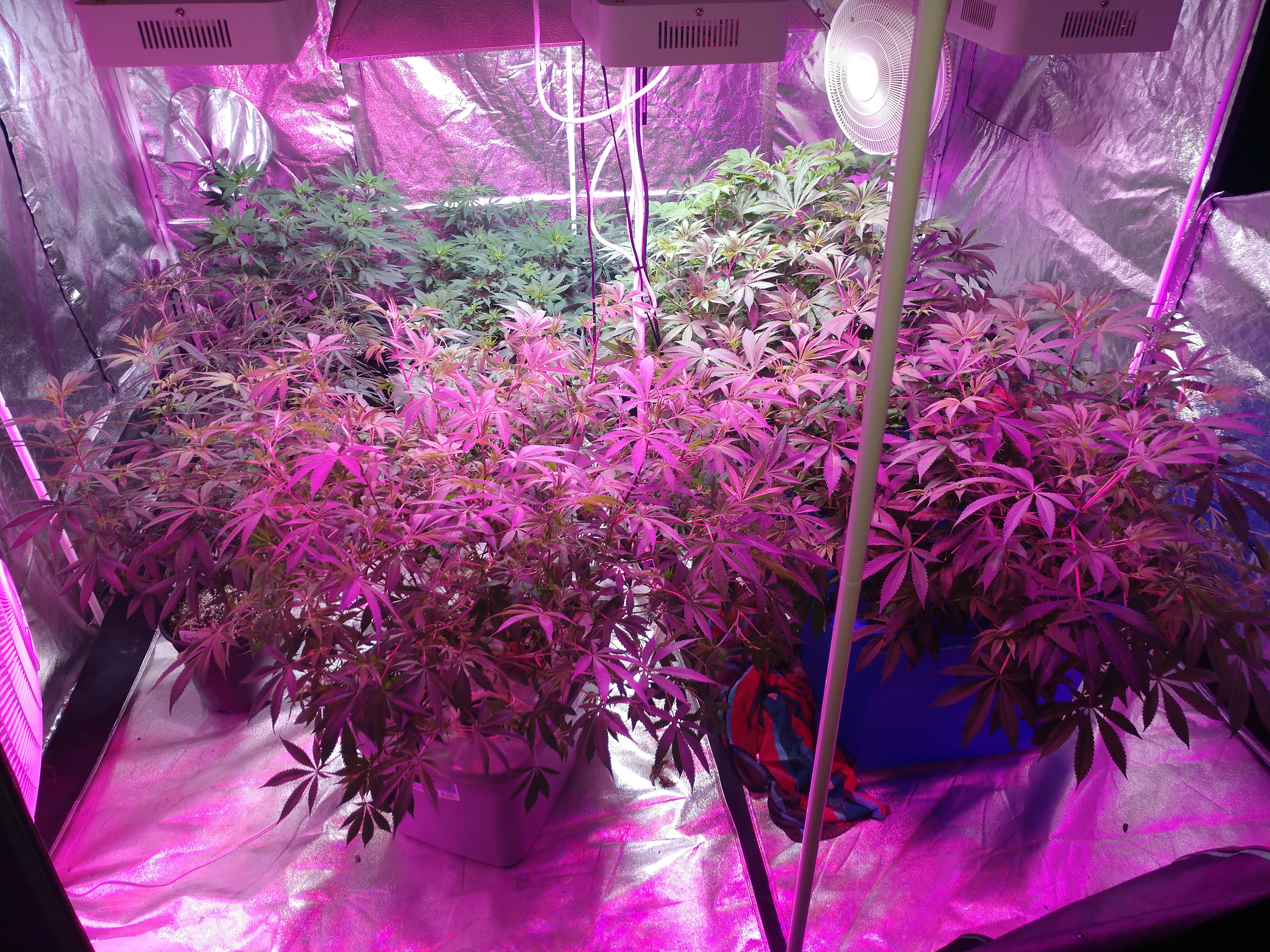 So it's been a while since I posted some pictures, figured it's time. Some of the ladies in the big tent were super cropped today. Still need to transplant most of them and separate the hydro again pretty soon but otherwise still going strong. I'm honestly thinking I like the LEDs more than the HID lights, at least for flower. Seems to be making fatter buds and the color of the whole plant seems darker, like the LEDs make the green come out more. It's pretty strange honestly. Plants are all healthy, except for a few saggy spots sometimes from under watering which fix themselves pretty quick after I water. Cut one of the girls down a few days ago. Was a little earlier than I wanted but I'm running out of weed from my last harvest so I figured I'd cut one and keep the other 9 going for a little longer.