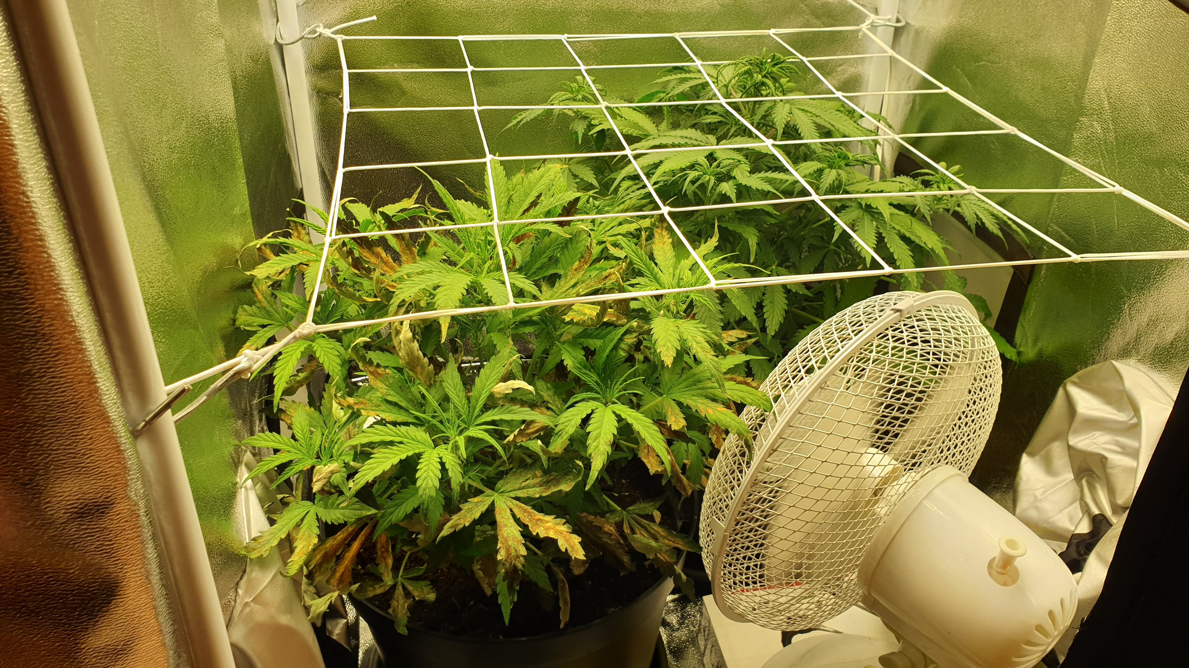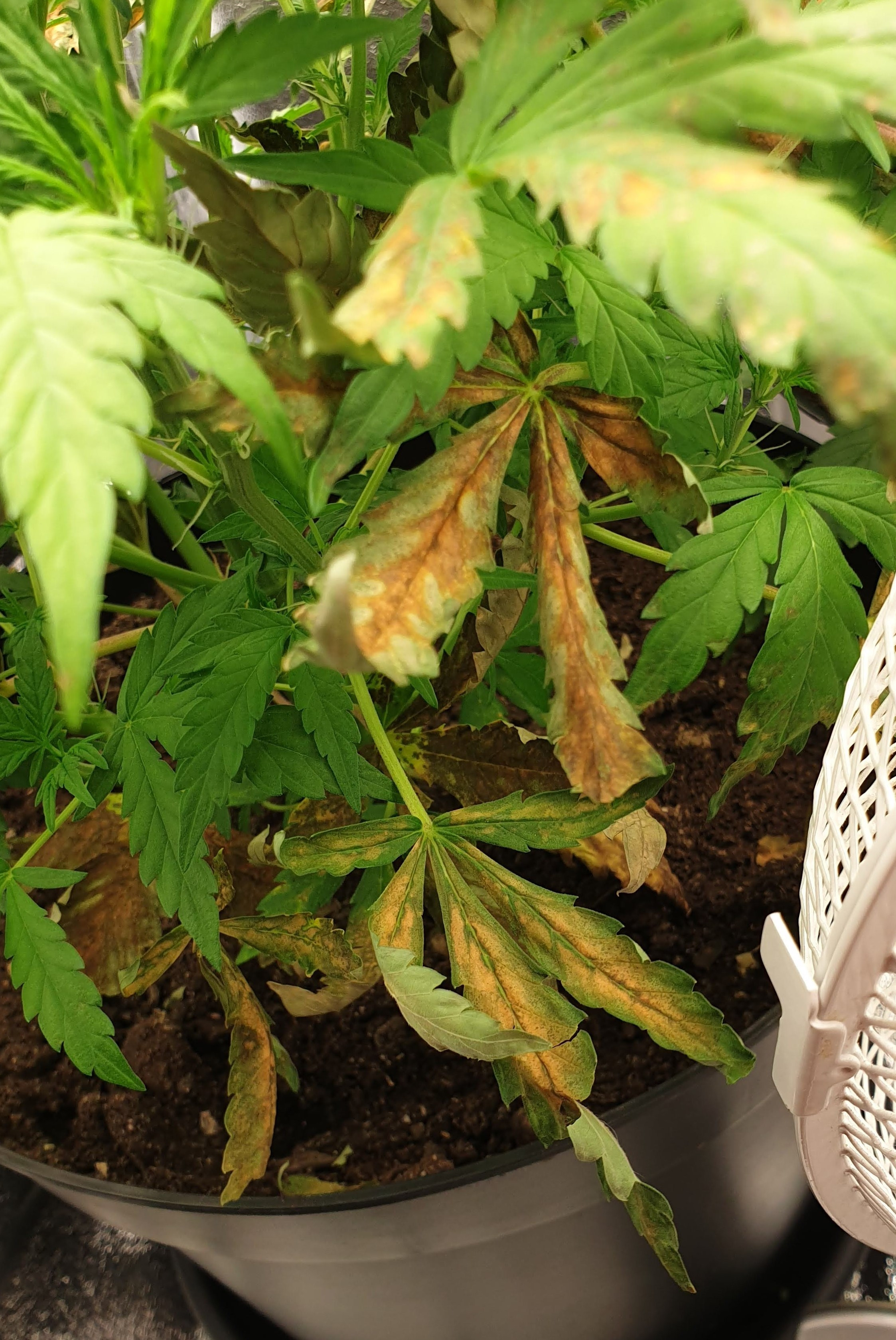 But yesterday night I noticed brown spots on two fan leaves on my White Widow Automatic, pictured in the closeups. The picture of the full plant is from today.