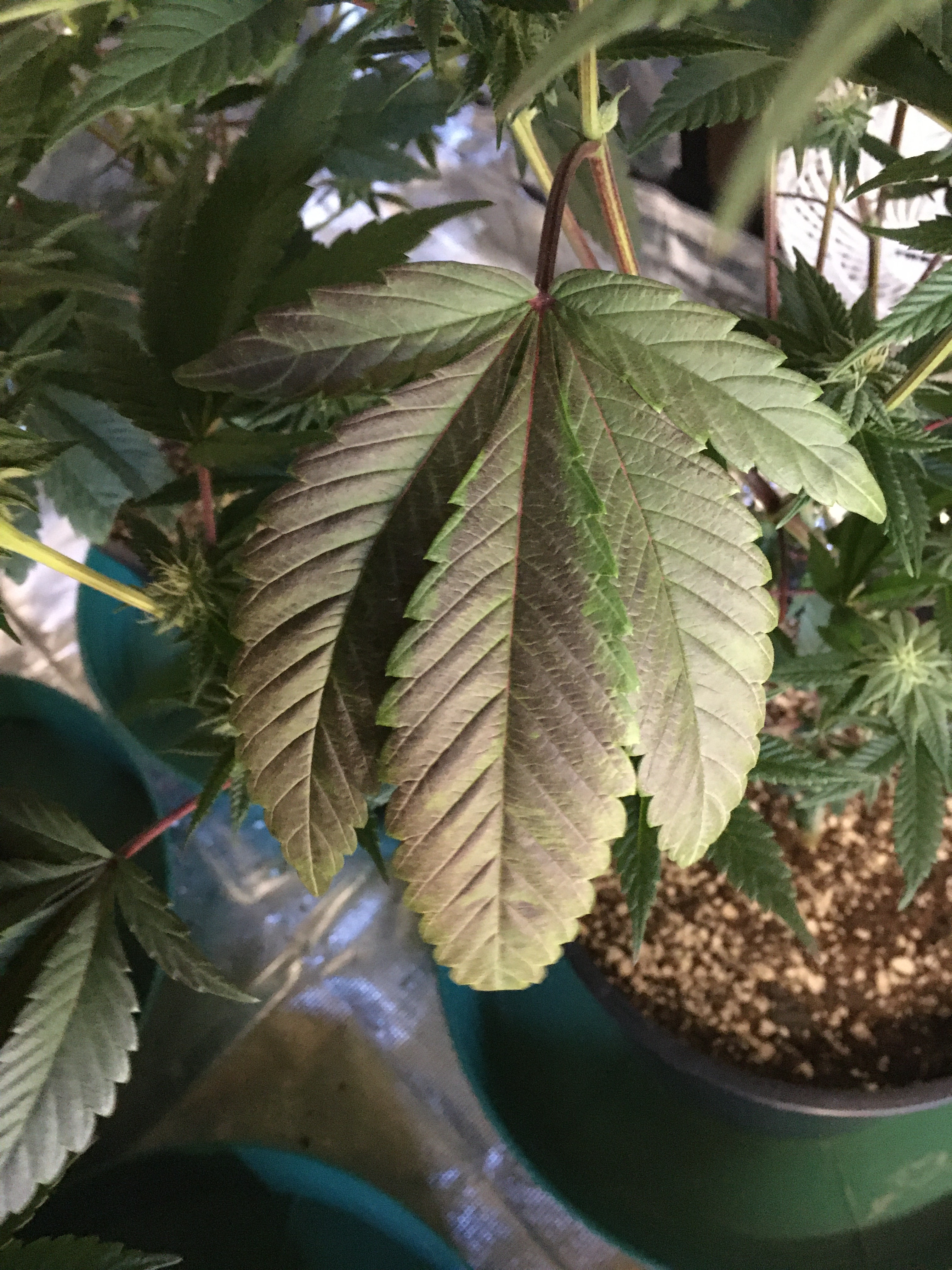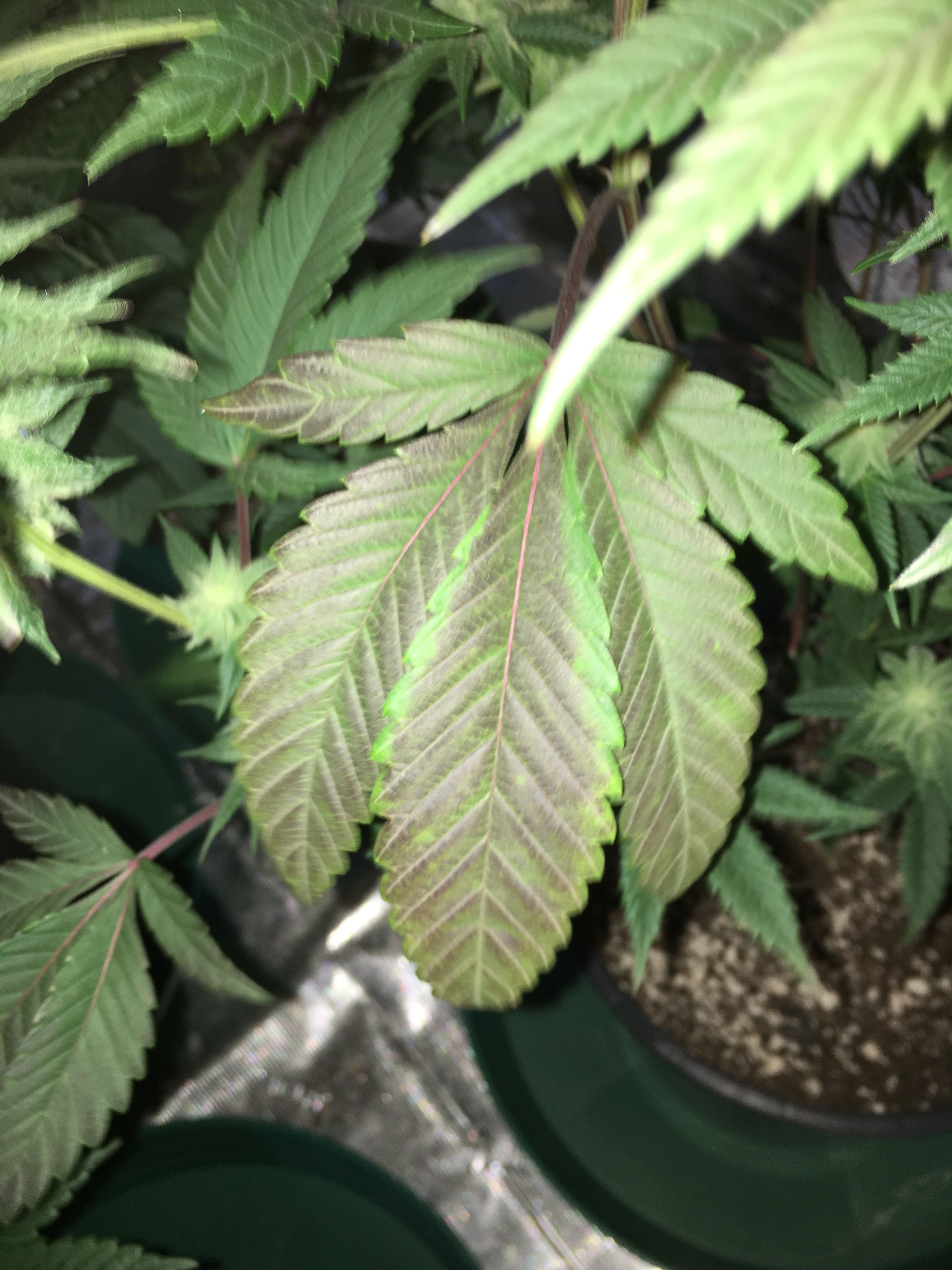 The fan leaves on my plants are turning purple from the inside out. I know it’s a blurp picture but the leaf actually looks like this in natural light. I didn’t find anything out about it on GWE. It seems to be spreading pretty fast. I’ve had some ph issues and I’m hoping it’s related to that and will correct itself now that the runoff pH is 6.5. Any ideas. Could it have anything to do with light distance? It’s hung 3-4” lower than the spec minimum.Tags: None