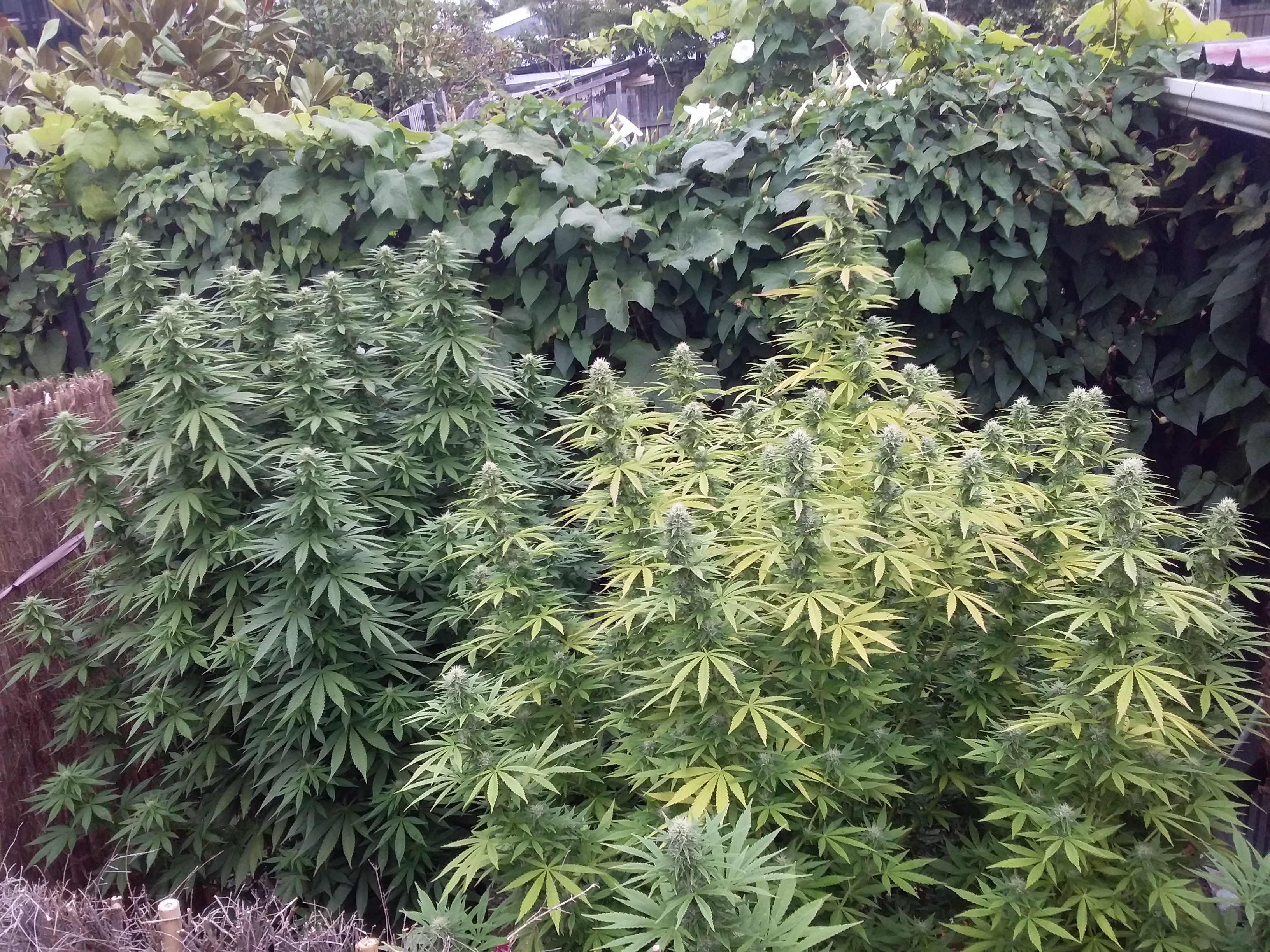 Hey guys heres my 2 trees in backyard 6mths1wk old im on roof of garage to get this pic my query is can any1 help me out what my yellowing girl looks like shes 2.3m tall and around 1.6m width around week 4 flower any experienced growers pick any ideas?