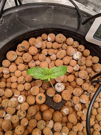 The bucket had been prepared with 2 gallons of water at PH 6, using a mix of 1/4 tsp per gallon of FloraMicro, FloraGro and FloraBloom, and 2ml per gallon of hydro guard. Everything went fine at first, see pictures. I actually meant to post all of the pictures except the drooping one yesterday, but my account was approved today and as of writing, the seedling has now dropped down entirely.