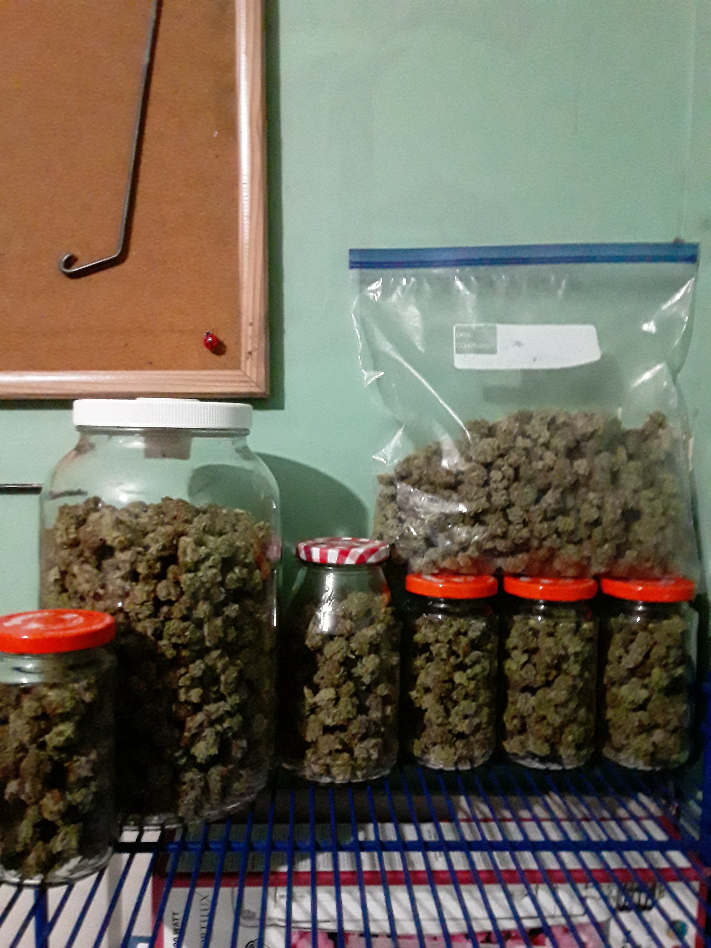 Total 2.3 pounds still curing. also got a gulf ball size ball of bubble hash I made from trimmings, Already dry 25 grams ready to smoke.