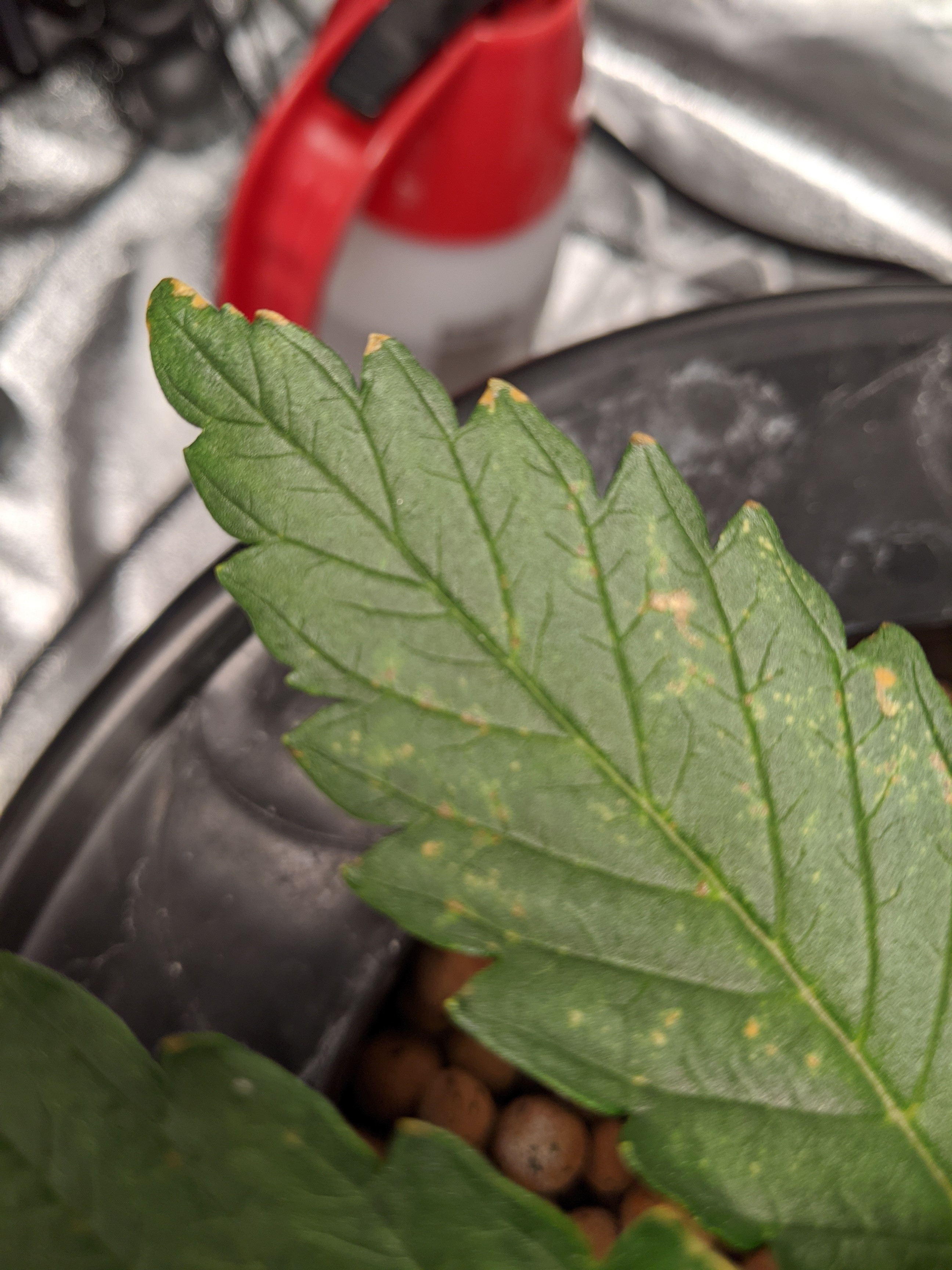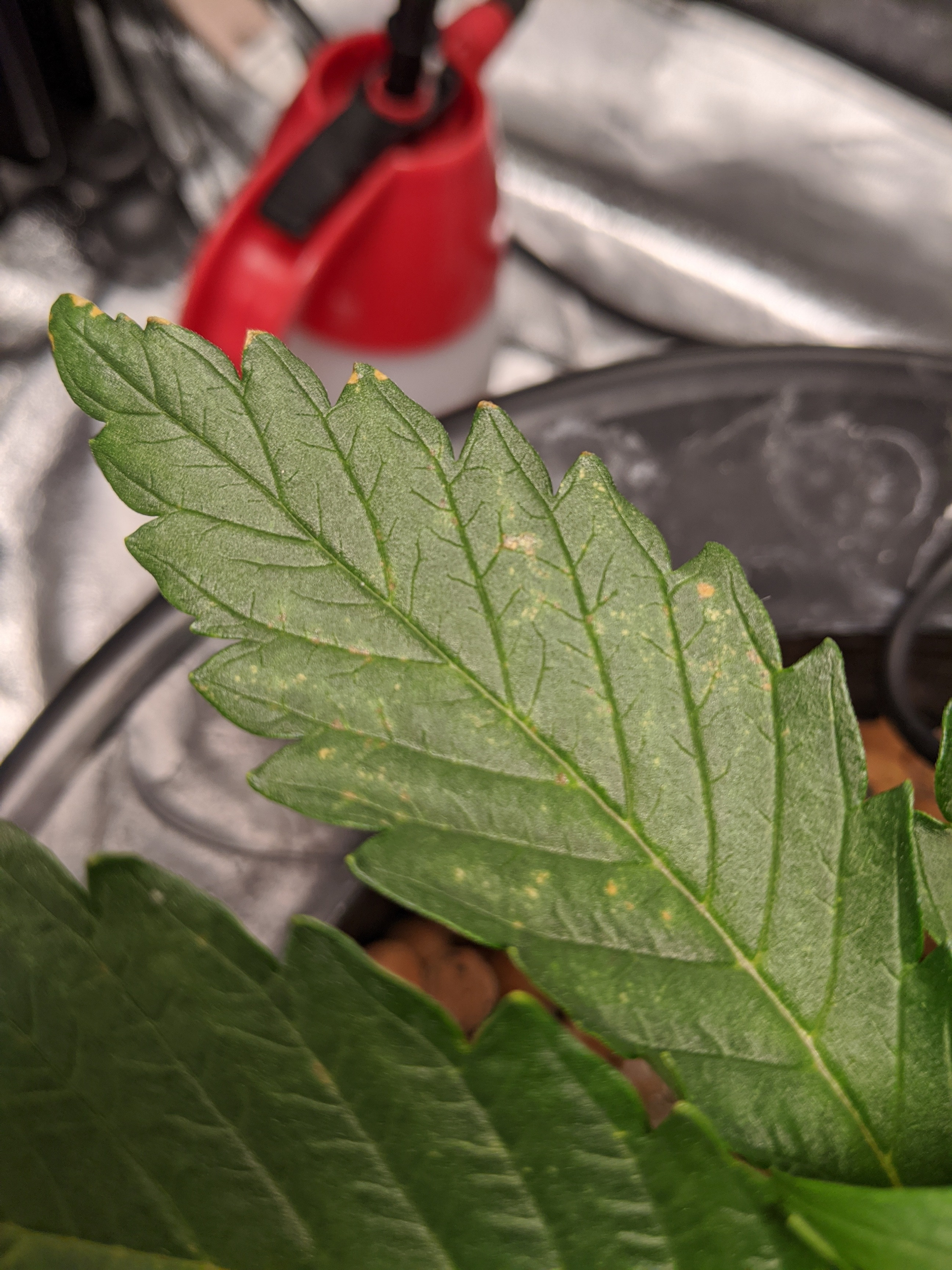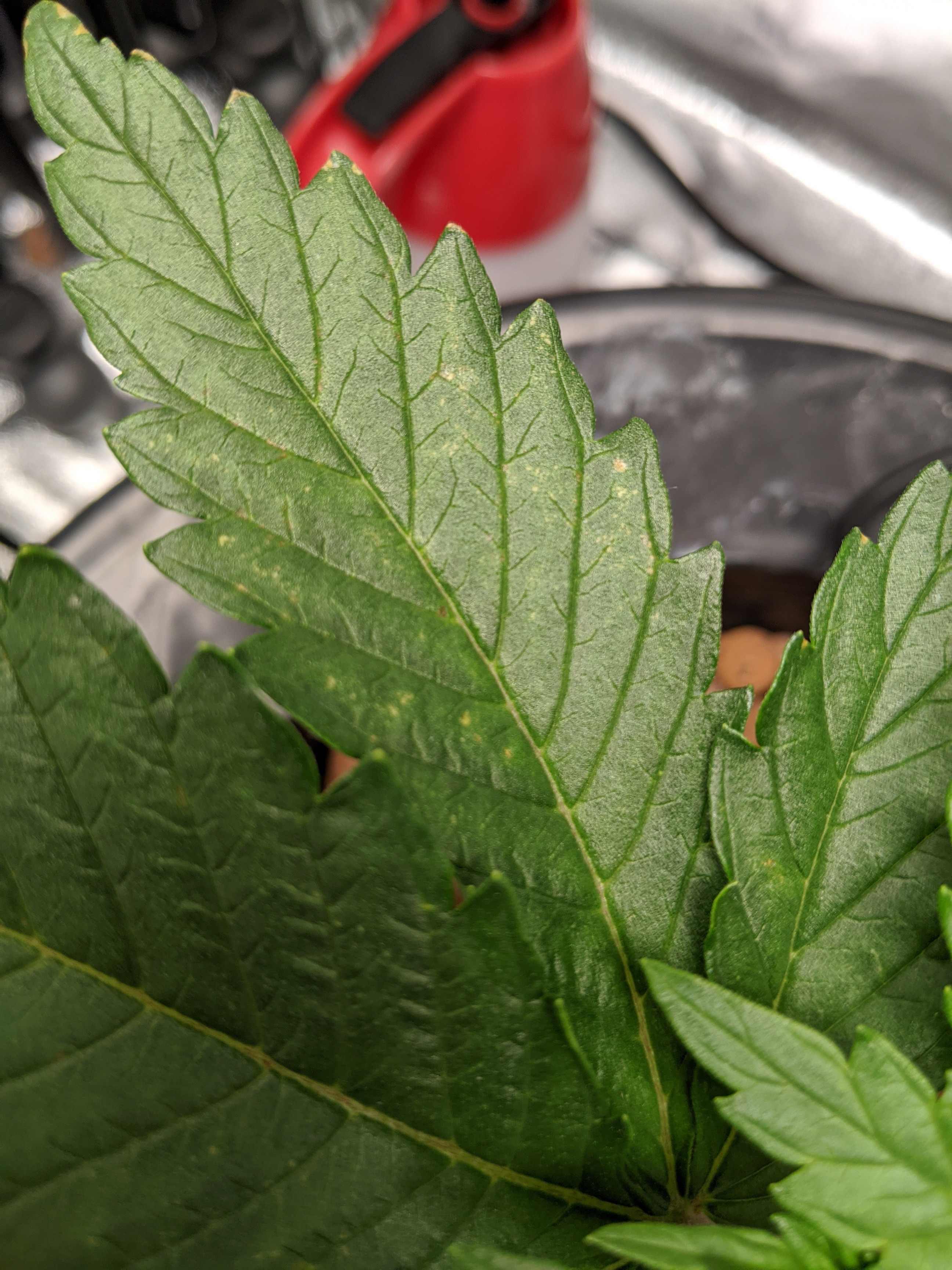 The spotting appears to be getting worse, but is mostly contained to two of the older fan leaves. I picked up some GH CALiMAGic and added a little over a teaspoon (around a half dosage for veg). New photos attached.